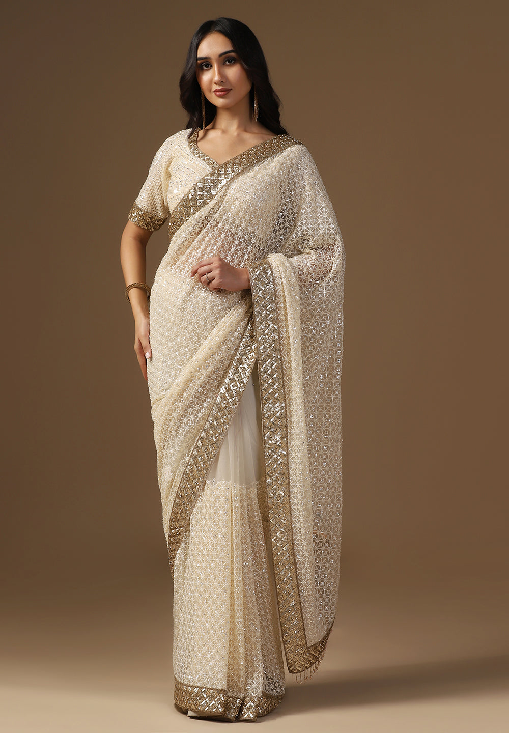 A rising favorite, pastel sarees for Teej are all about soft elegance. With the monsoon weather in mind, these pastel festive sarees are lightweight and camera-friendly. From peach and blush to mint and lavender, lightweight pastel sarees keep you cool while staying fashion-forward. This Glass Organza Pearls Work Embroidery Saree is one of the trendy pastel sarees that’s perfect for Teej brunches, poojas, and Instagram reels.