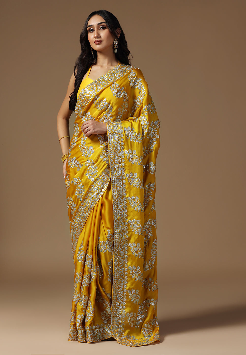 It is traditional to wear a yellow saree for Basant Panchami festival and there is nothing wrong with following this tradition in today’s world. This is a sprung festival that always demands colors and what can be as appealing as an embroidered yellow saree? If you want the rich look and feel of a handwoven silk saree in yellow or choose a lightly embroidered satin festive saree, there is an aura of elegance and serenity about these outfits. The fabric and experience of the sarees, the grand zari work, and the detailed patterns make them representative of prosperity and grace, apt for pooja wear as well as cocktails and dinner wear.