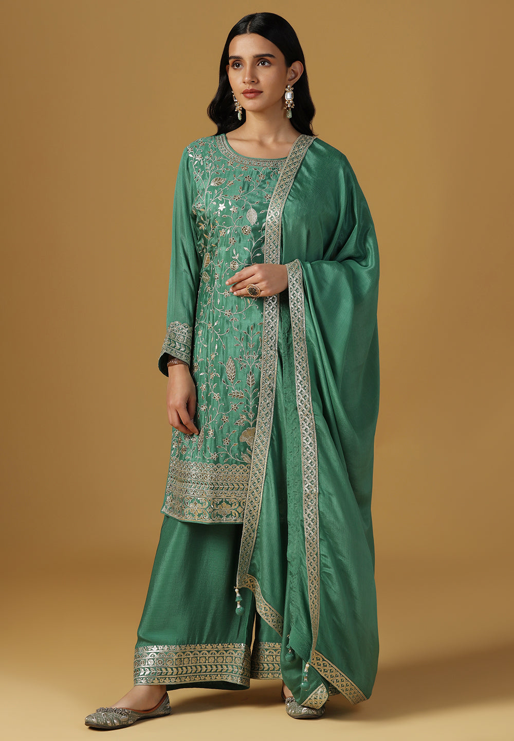 The Mehndi function calls for lively colours and comfort that lets you enjoy the festivities. Our green sharara suits feature thread embroidery, sequins, and hand detailing that reflect playful charm. For this event, go for lighter fabrics like georgette or chiffon to stay comfortable while dancing and celebrating.