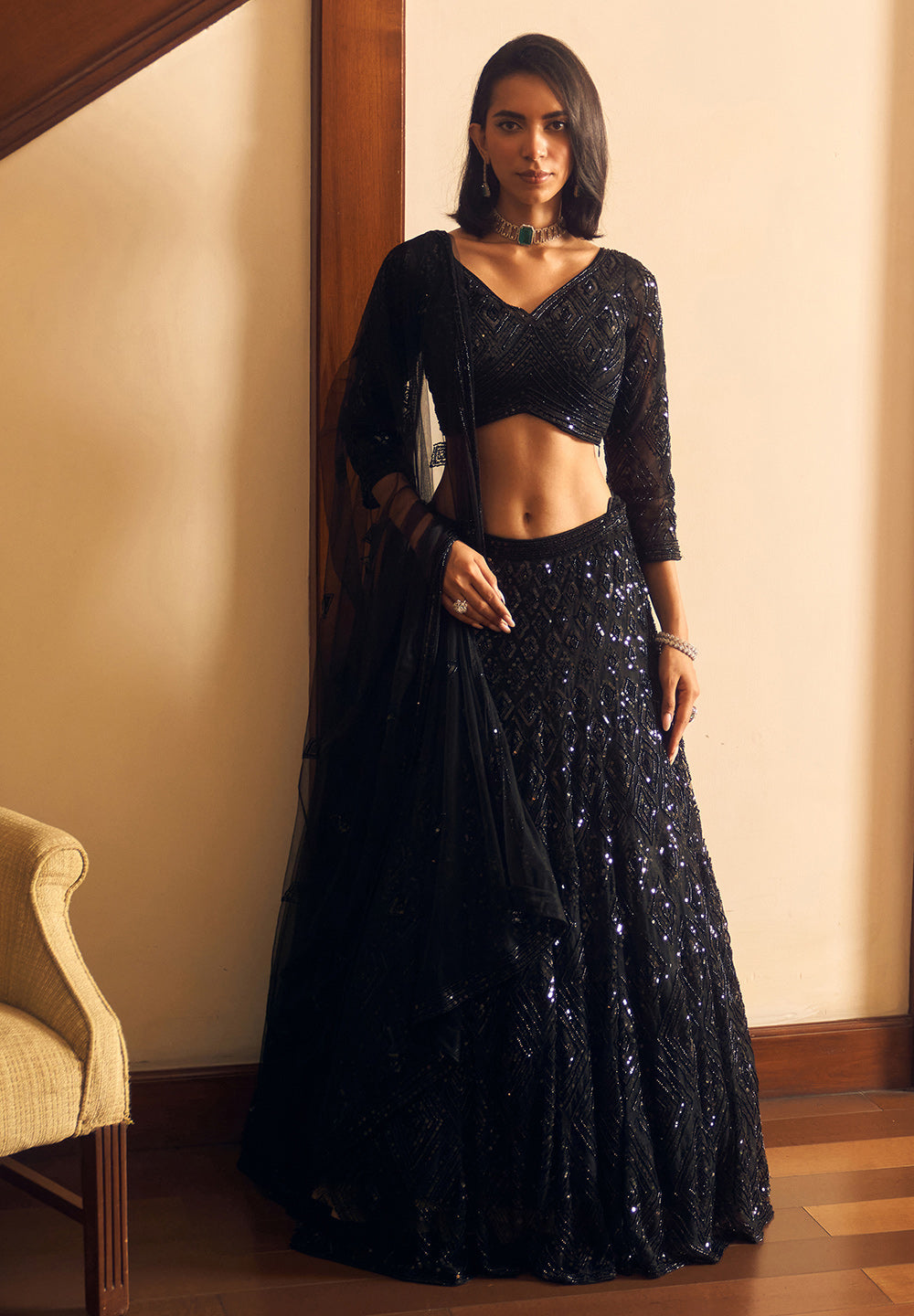 Cocktail nights are for contemporary elegance. For this evening affair, swap heavy embroidery for sleek silhouettes and statement details. Choose from black lehengas, blue lehengas that exude modern sophistication.