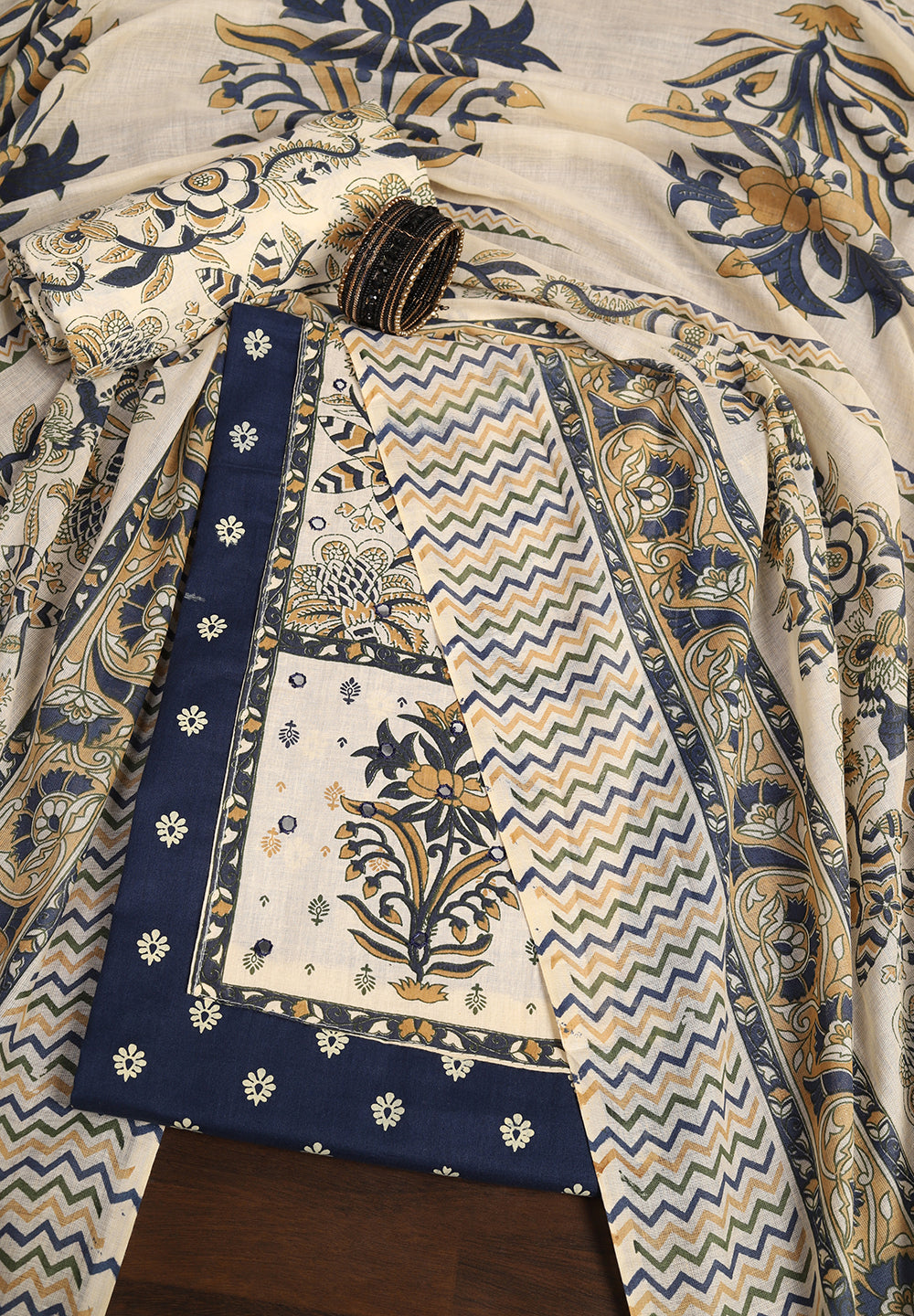 "Printed Perfection: Cotton Unstitched Suit with Stylish Neck Patch"
