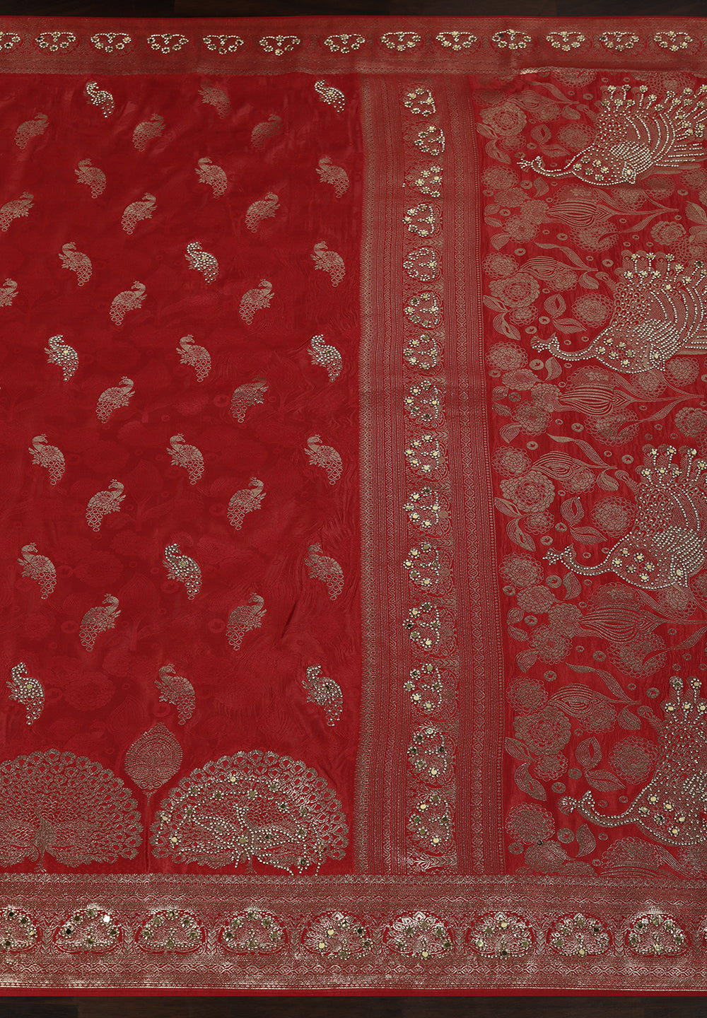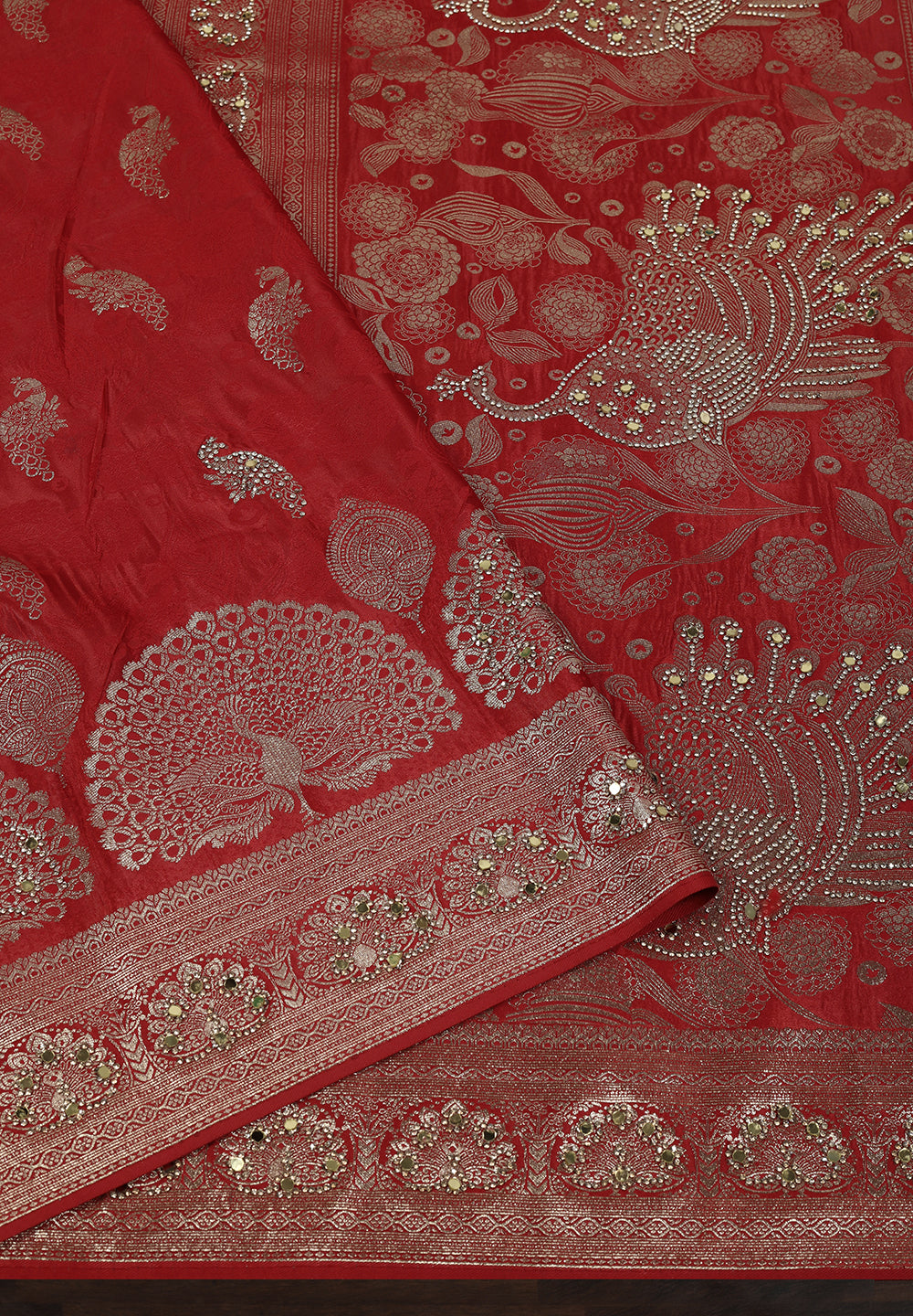 Our bridal Banarasi sarees feature intricate gold and silver zari work, delicate floral motifs, and rich color palettes that embody timeless beauty. Whether you choose a red, maroon, or pastel Banarasi saree, each piece adds a royal touch to your bridal ensemble, making it perfect for weddings, receptions, or engagement ceremonies.