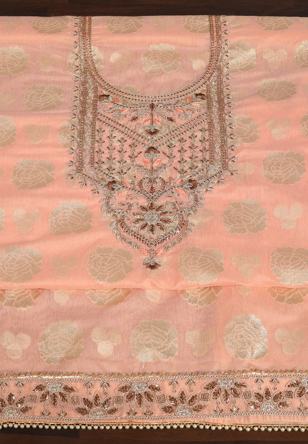 The charm of a Chanderi suit lies in its effortless elegance. From the intricate zari motifs to the luxurious feel of handwoven fabric, every detail reflects refined craftsmanship. Explore our exclusive range of Banarasi Chanderi unstitched suits in rich hues like pink, green, mauve, and onion, beautifully adorned with Aari, sequin, and zari detailing.