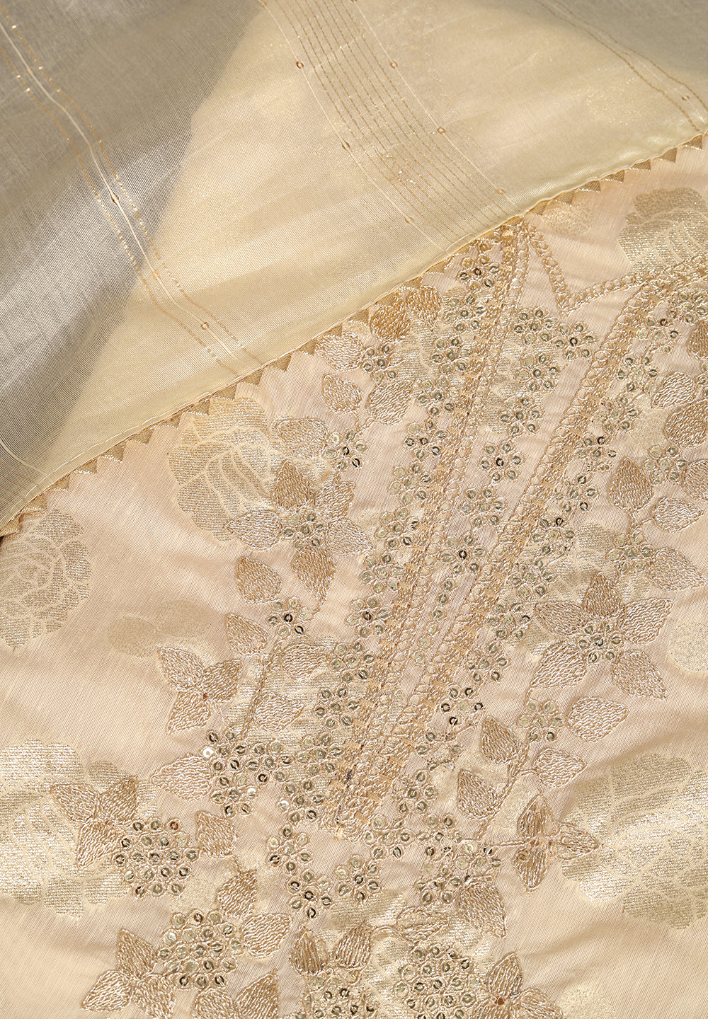 For women who love to create personalized styles, unstitched Chanderi suits offer endless versatility. At Bombay Selections, our Banarasi Chanderi suit fabrics come embellished with delicate zari borders, sequin patterns, and handwoven motifs — giving you the freedom to design your dream outfit.
