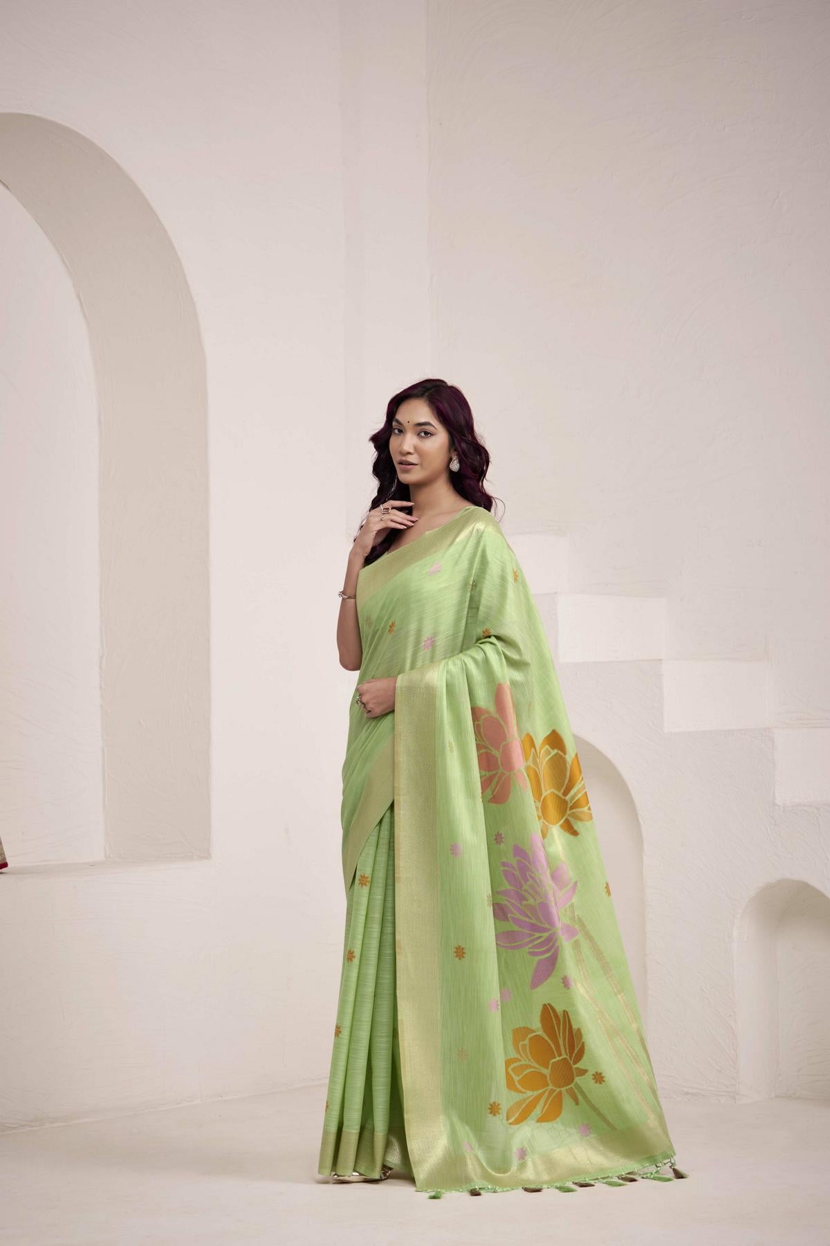 Discover captivating shades like rose pink, pistachio green, sky blue, and classic cream — each saree adorned with intricate prints, zari borders, or woven motifs that radiate timeless elegance. Soft to touch and easy to drape, these floral sarees are a must-have addition to your collection of ethnic wear for women.