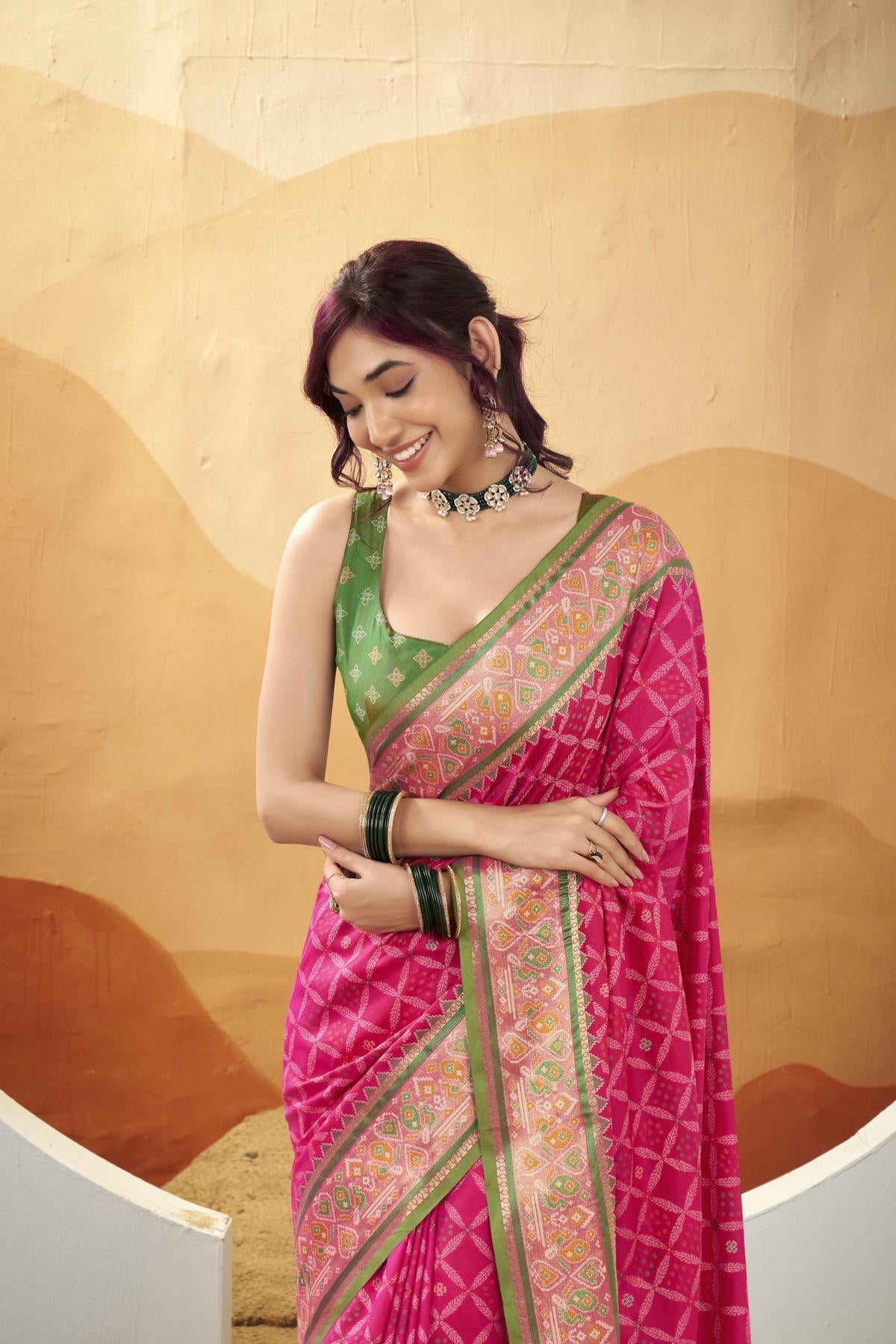 - Choose a contrasting blouse for satin crepe sarees to add a modern twist.