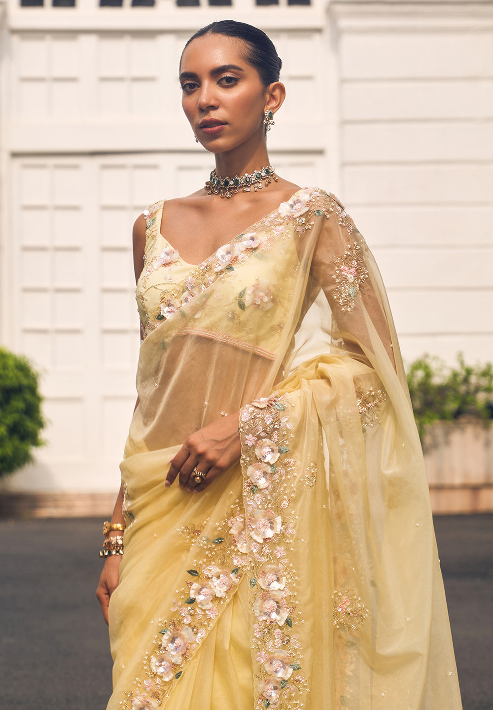 - Pair floral organza sarees with pearl earrings and nude makeup for a soft, feminine appeal.