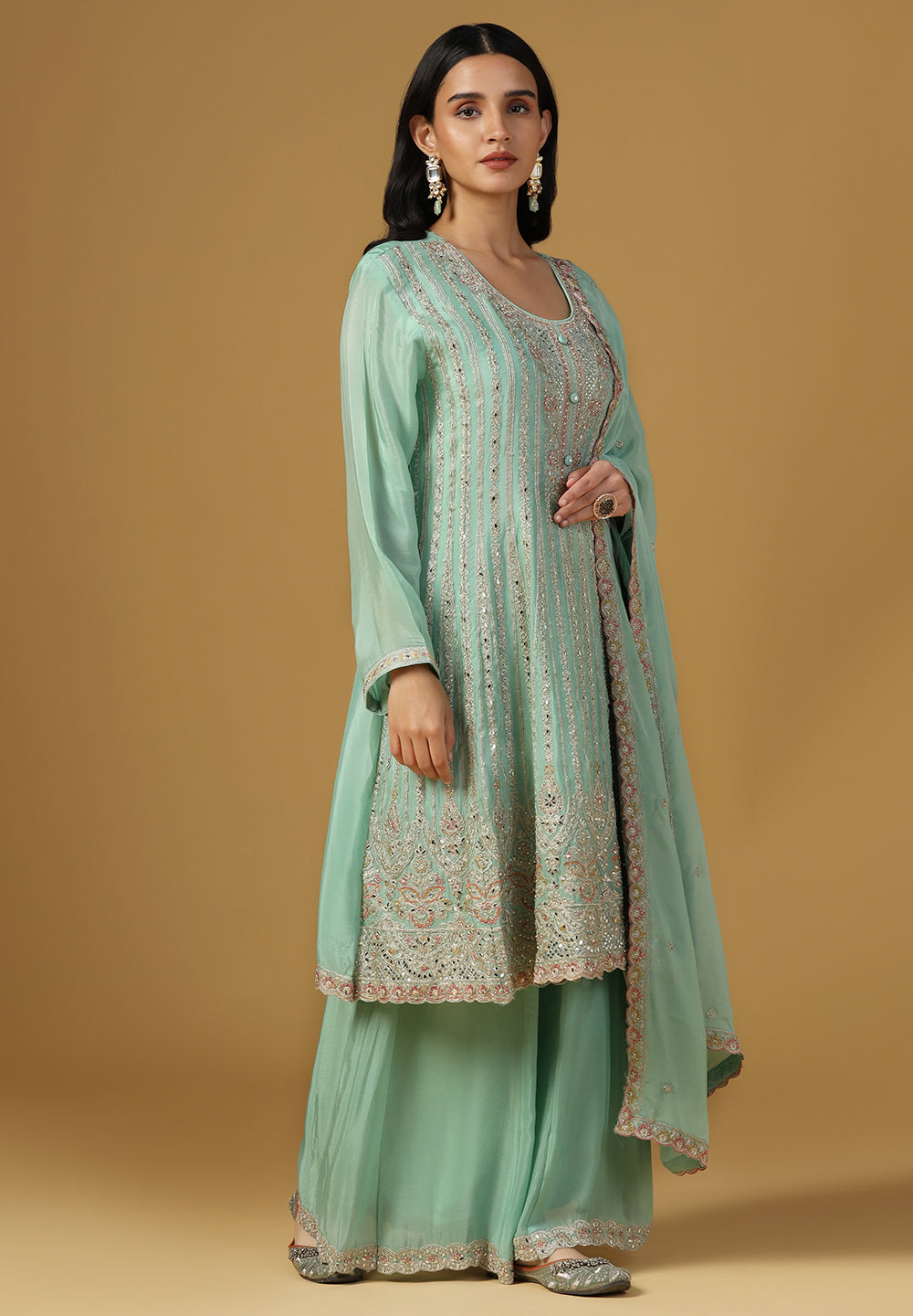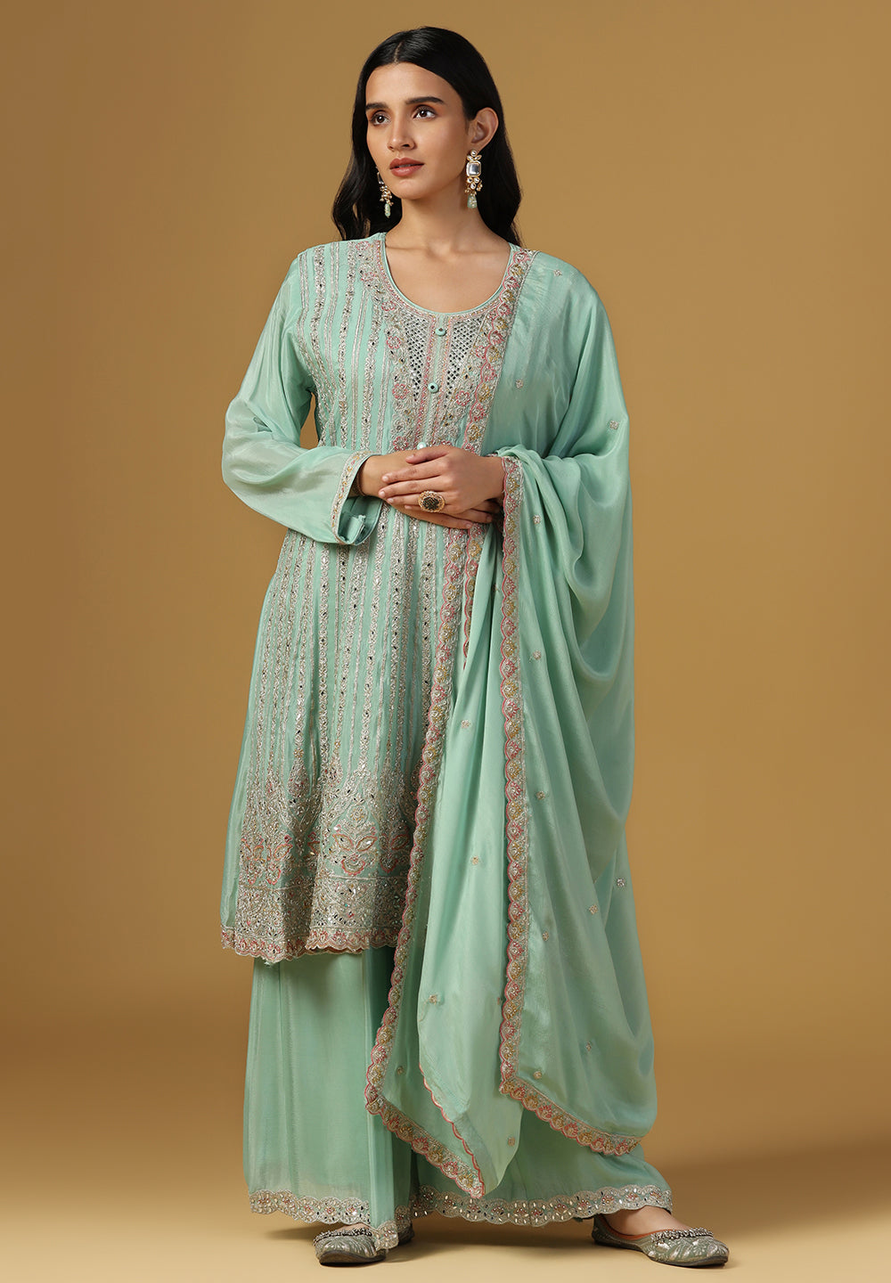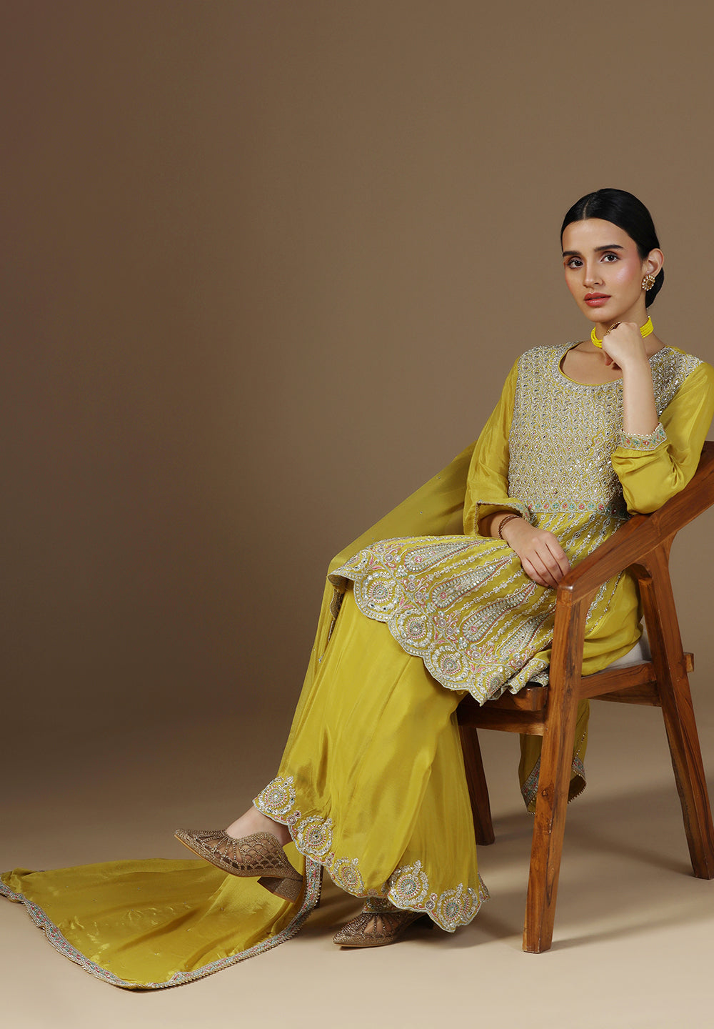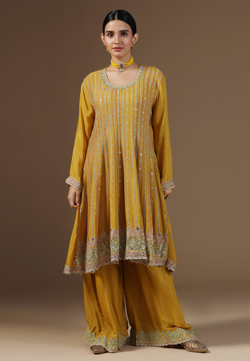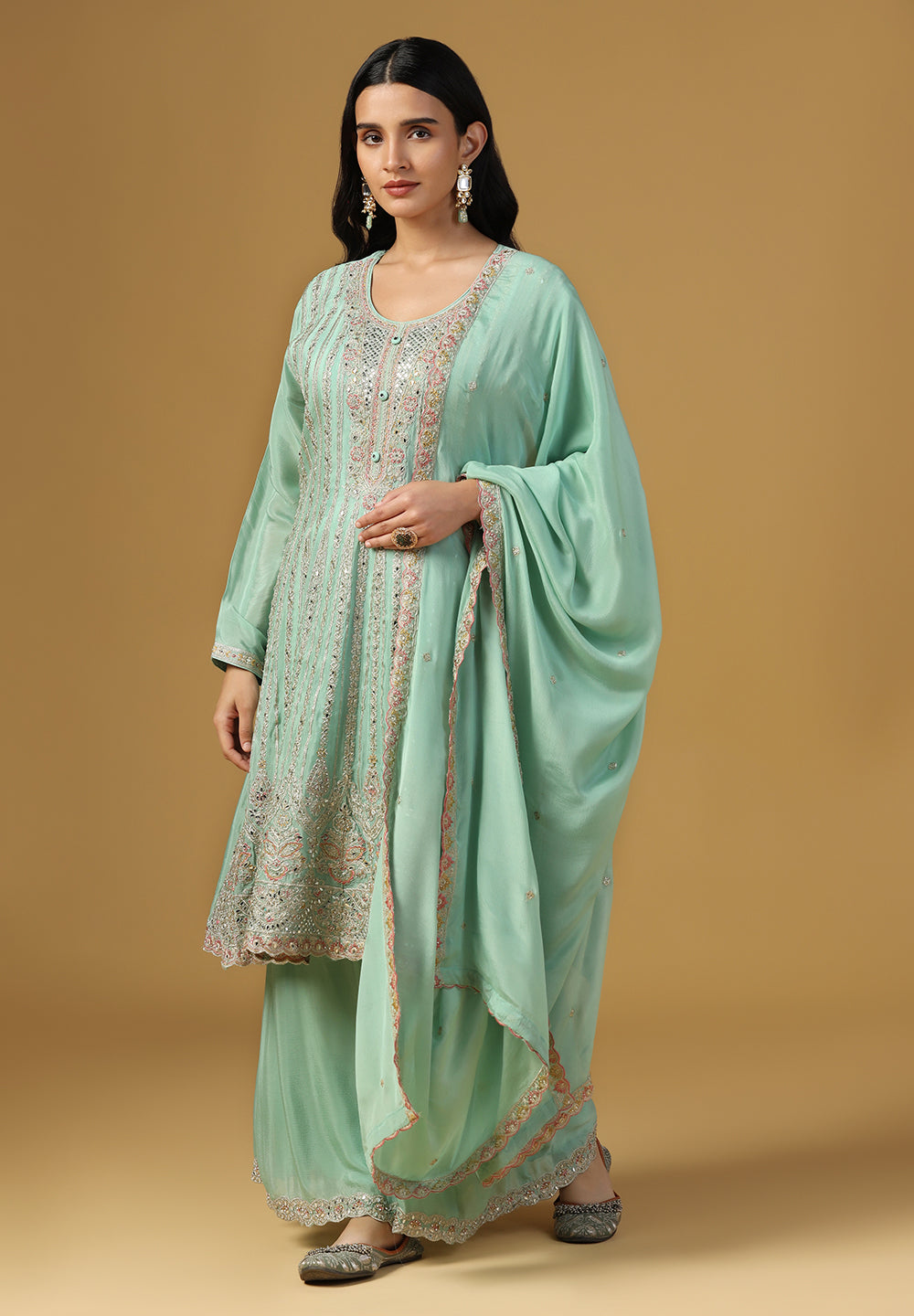 - Complement your look with embroidered juttis or block heels.