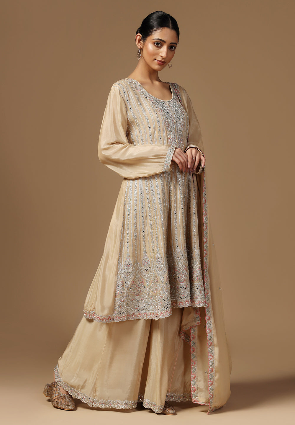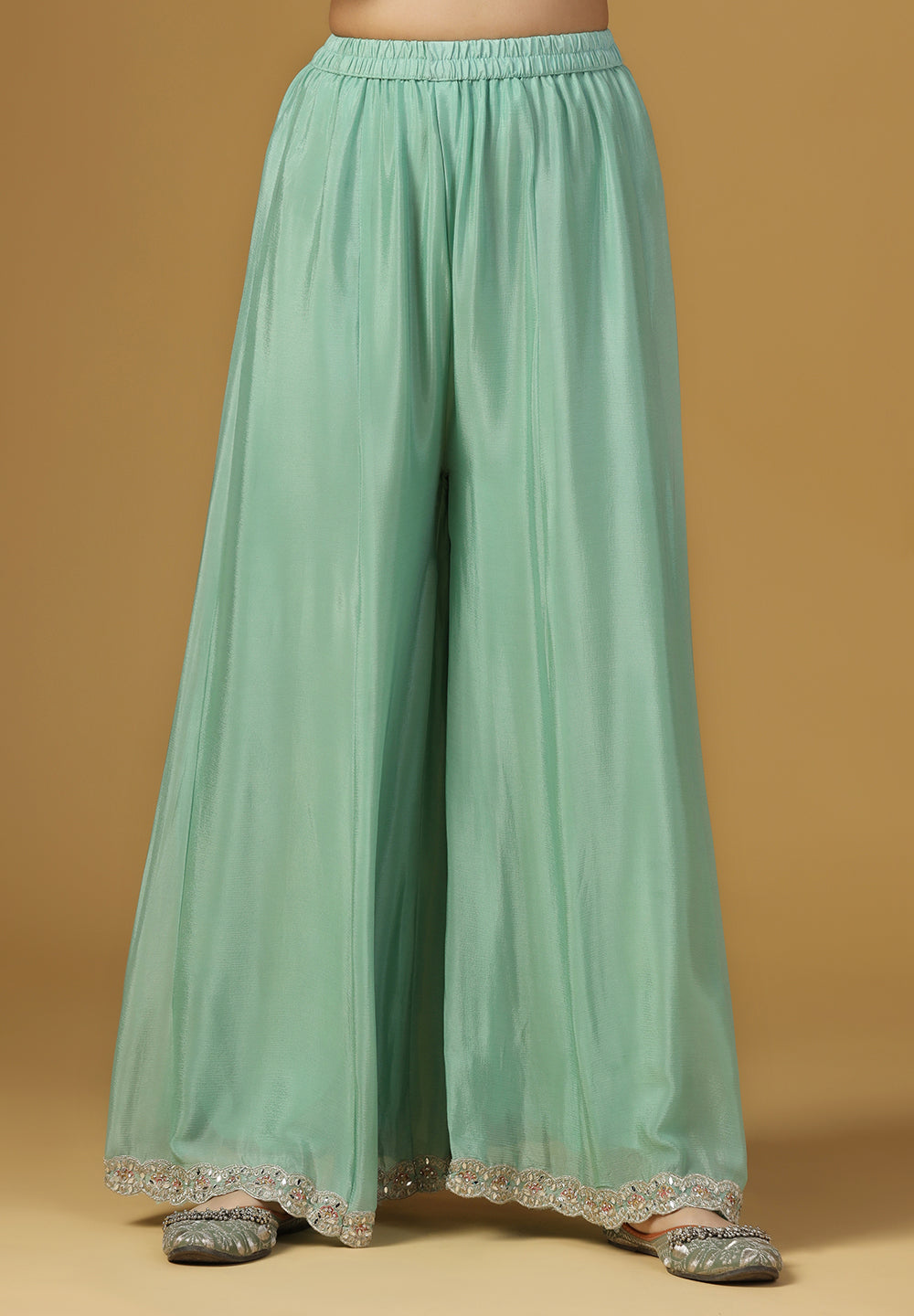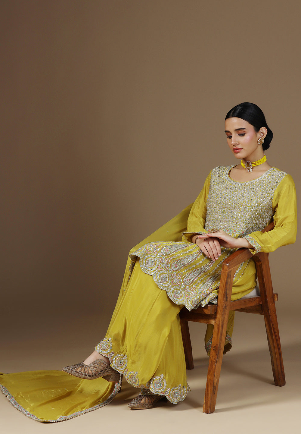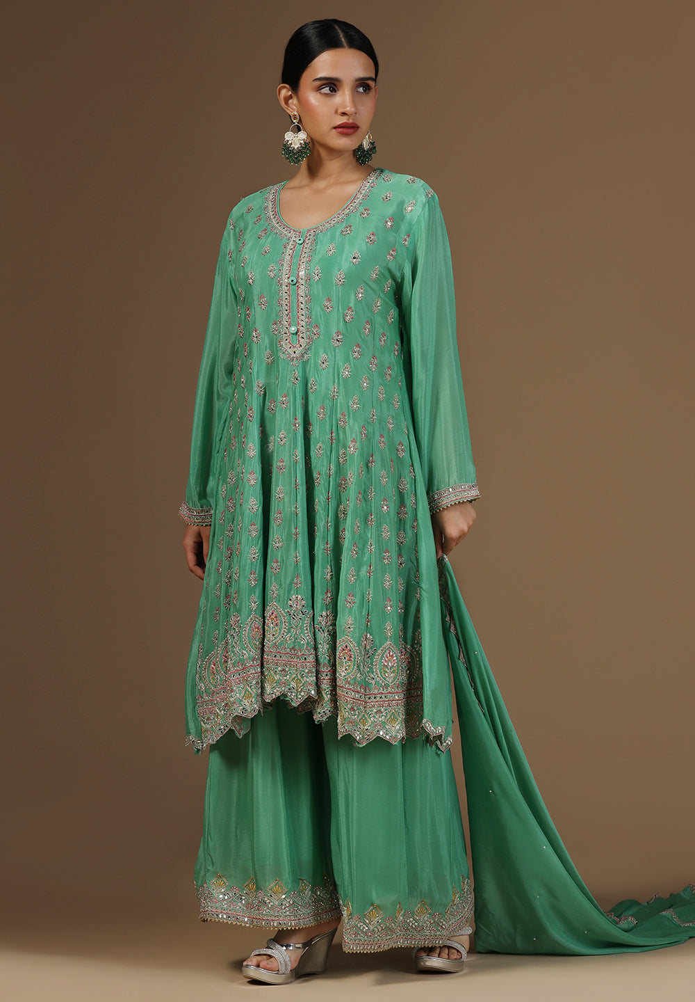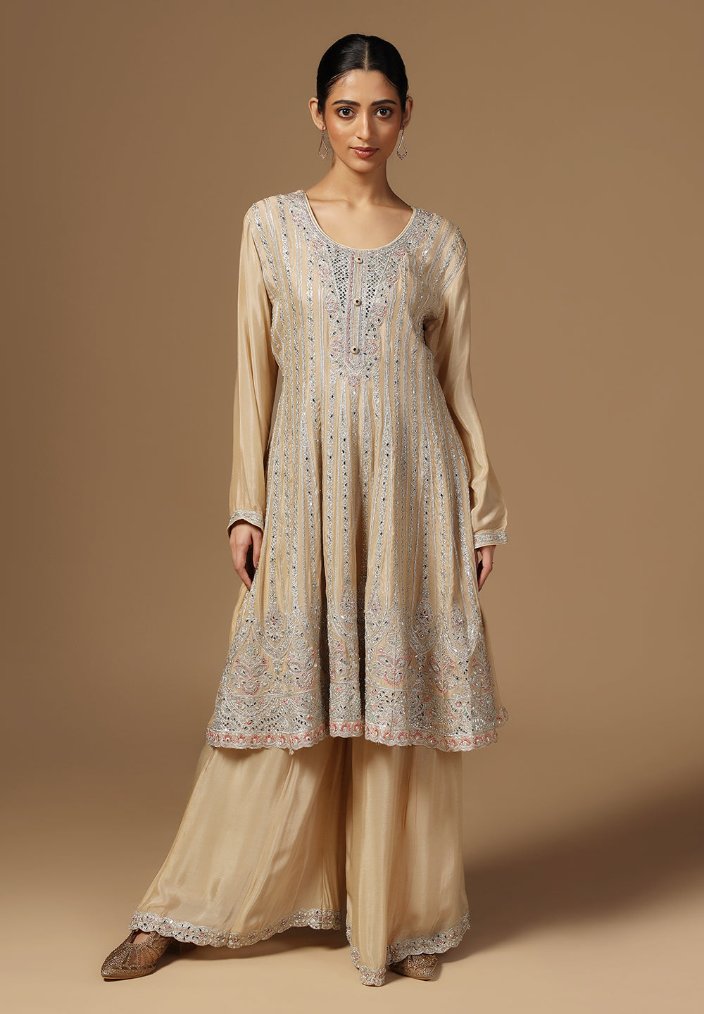 - Complement your look with embroidered juttis or block heels.
