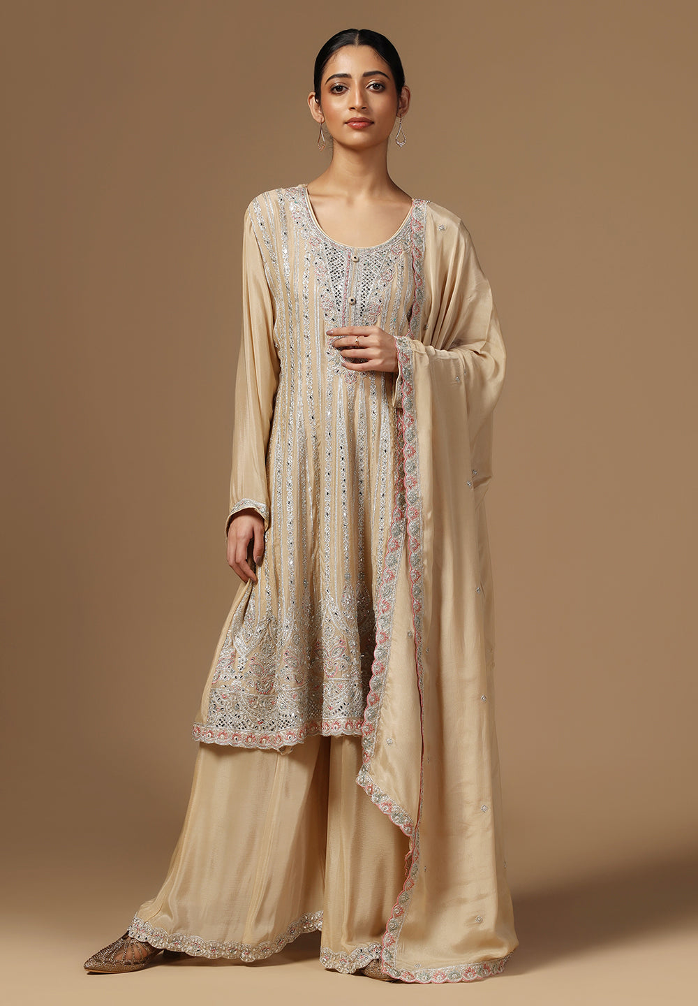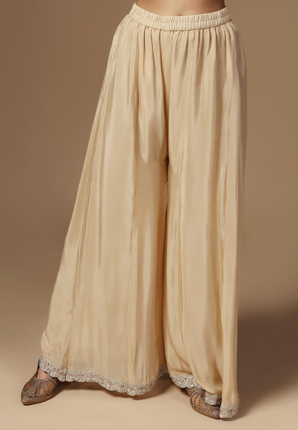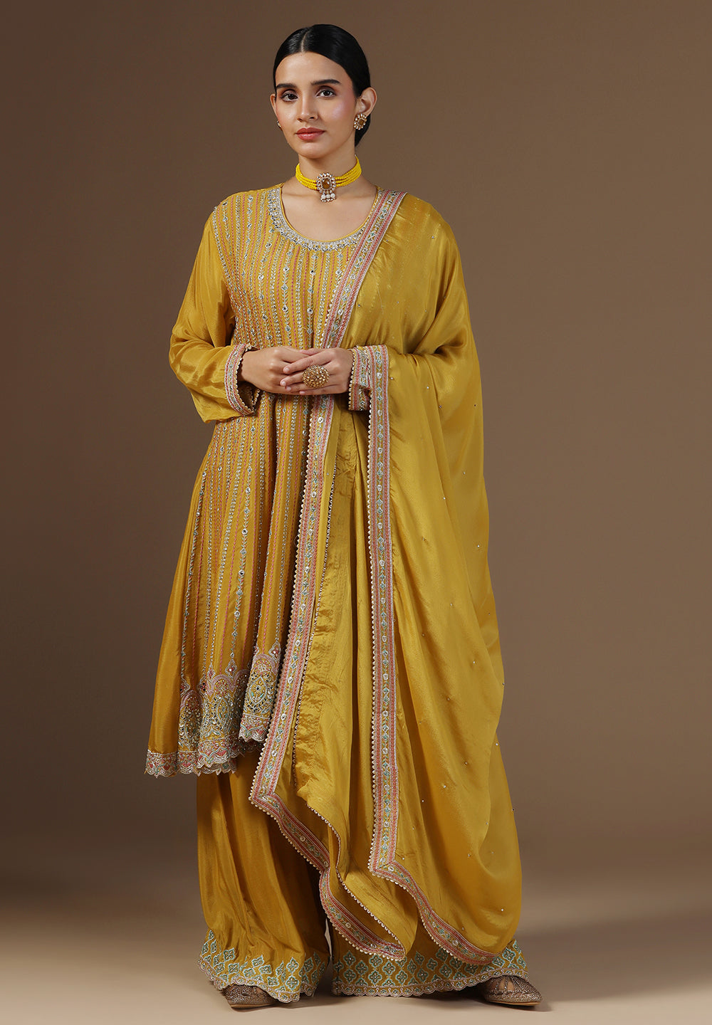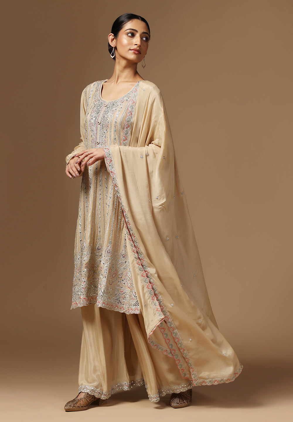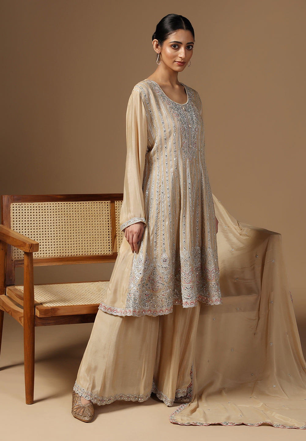 - Complement your look with embroidered juttis or block heels.