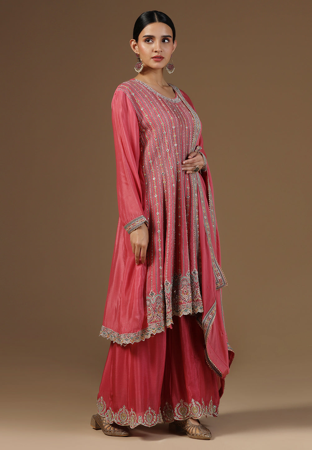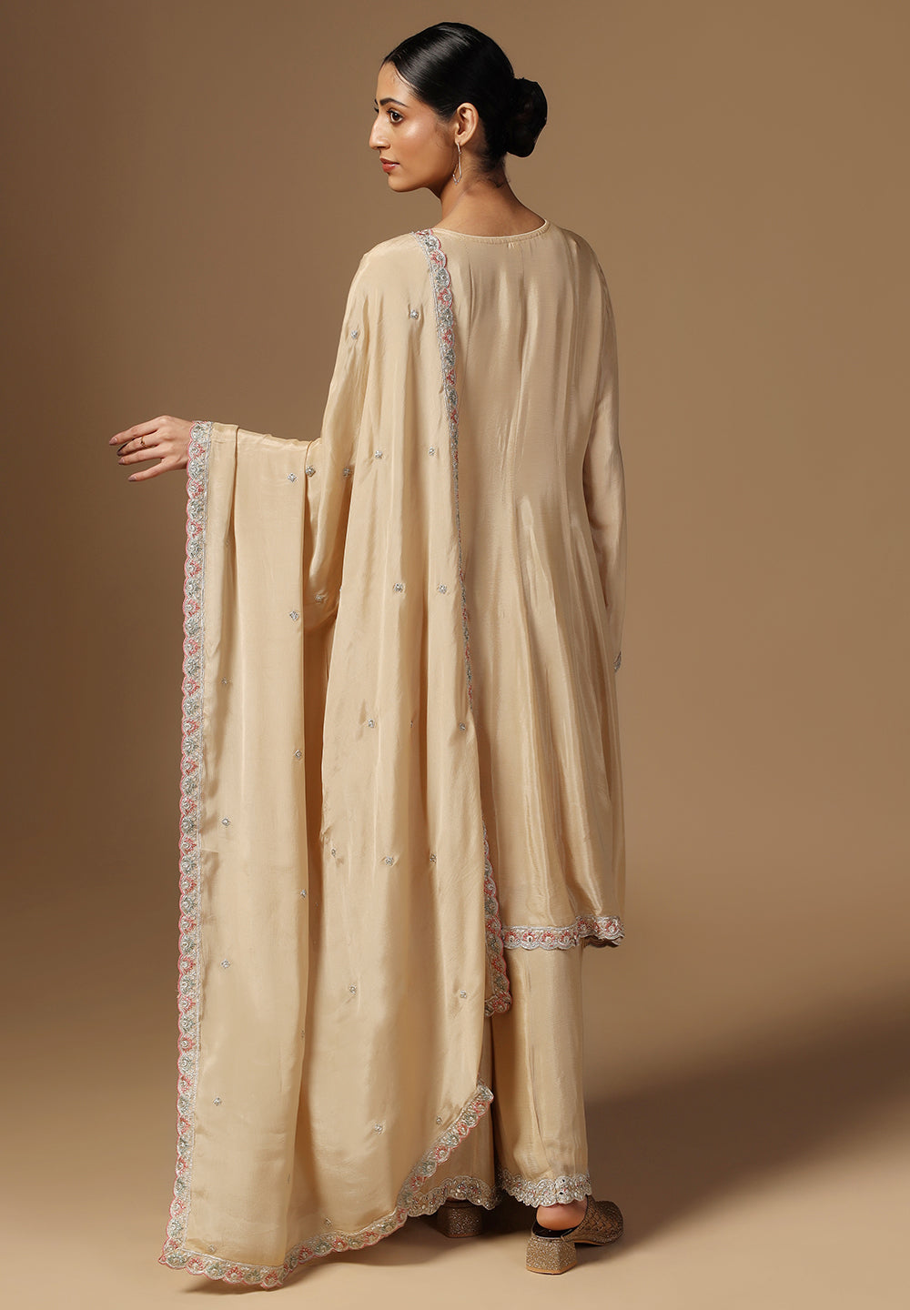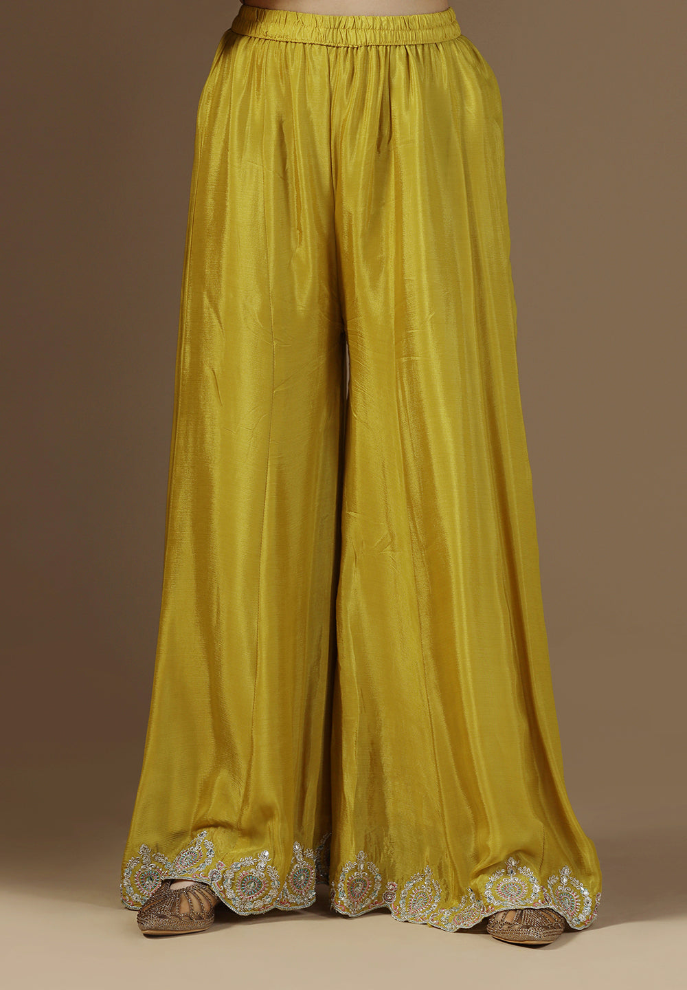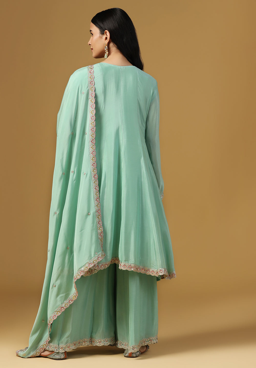 - Complement your look with embroidered juttis or block heels.