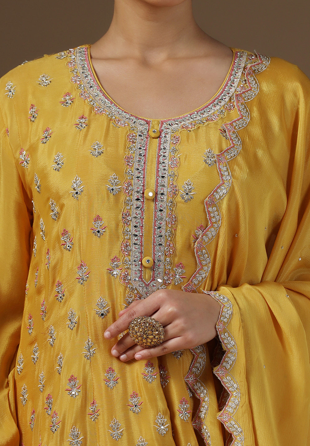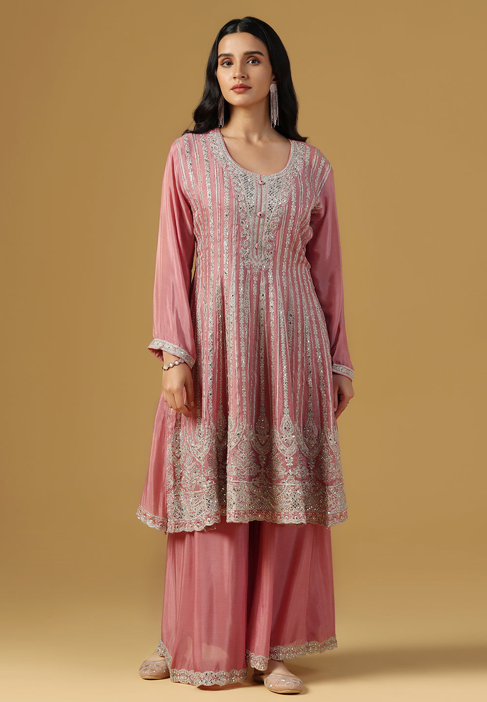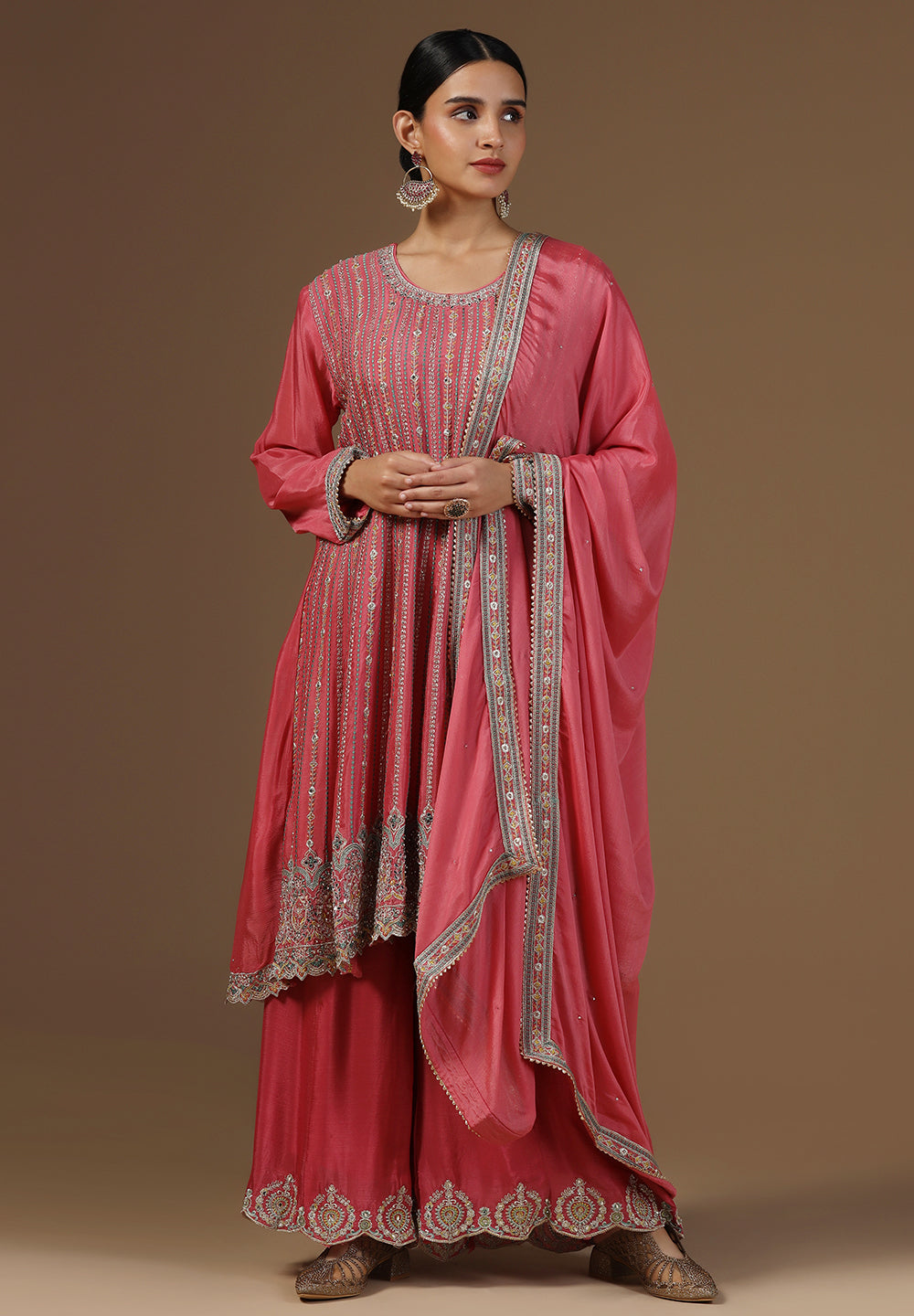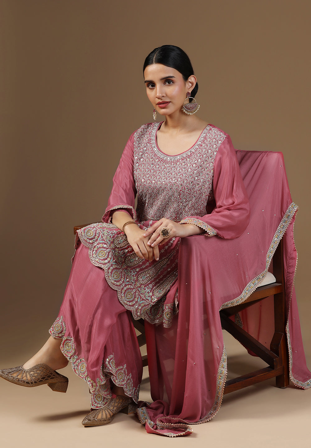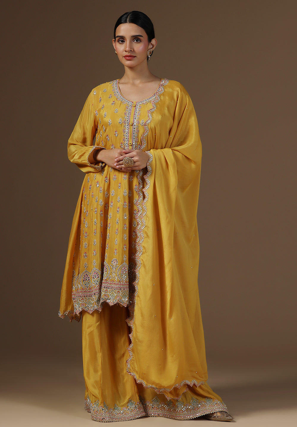 - Complement your look with embroidered juttis or block heels.