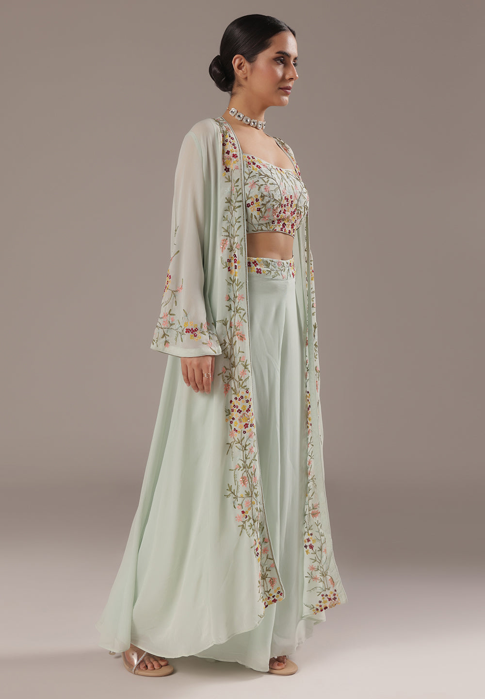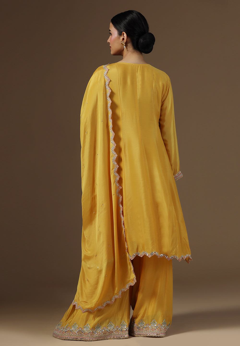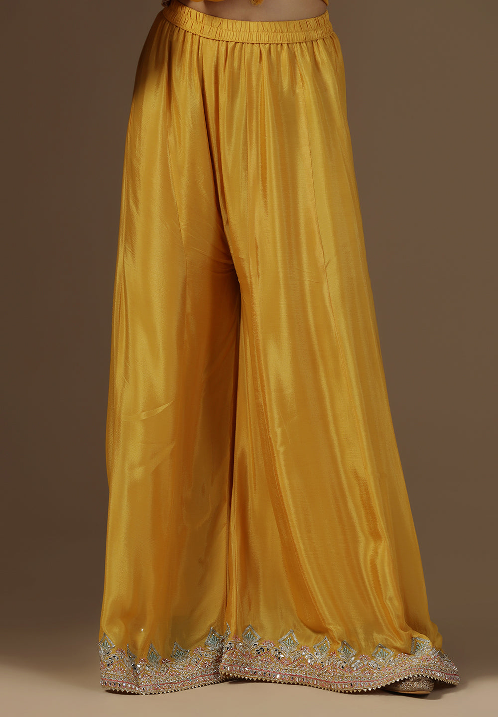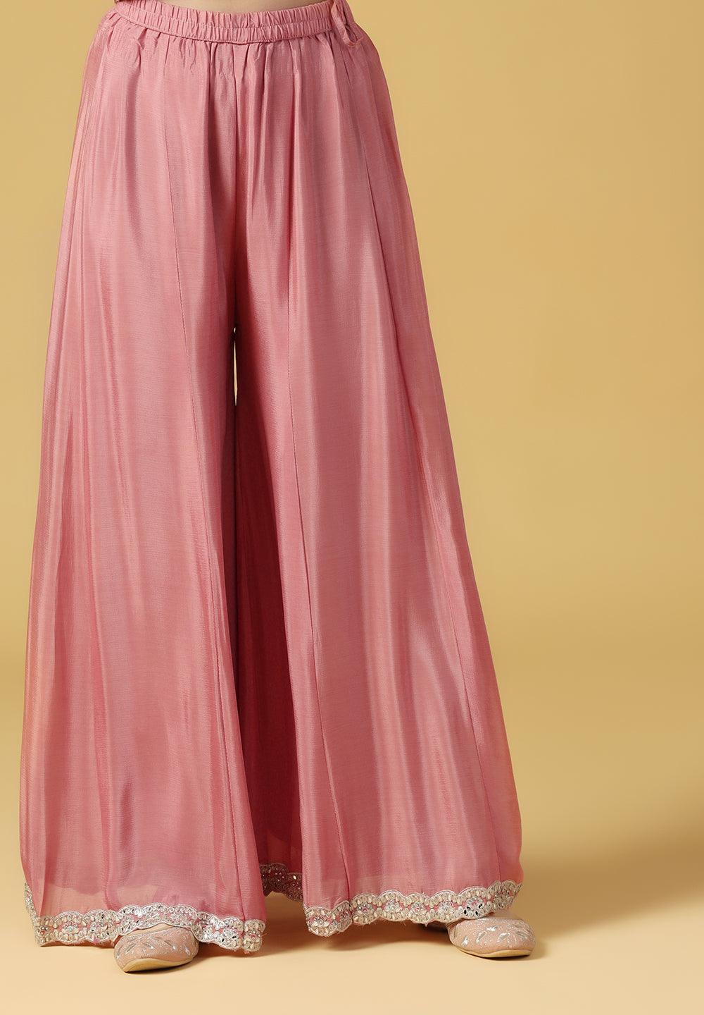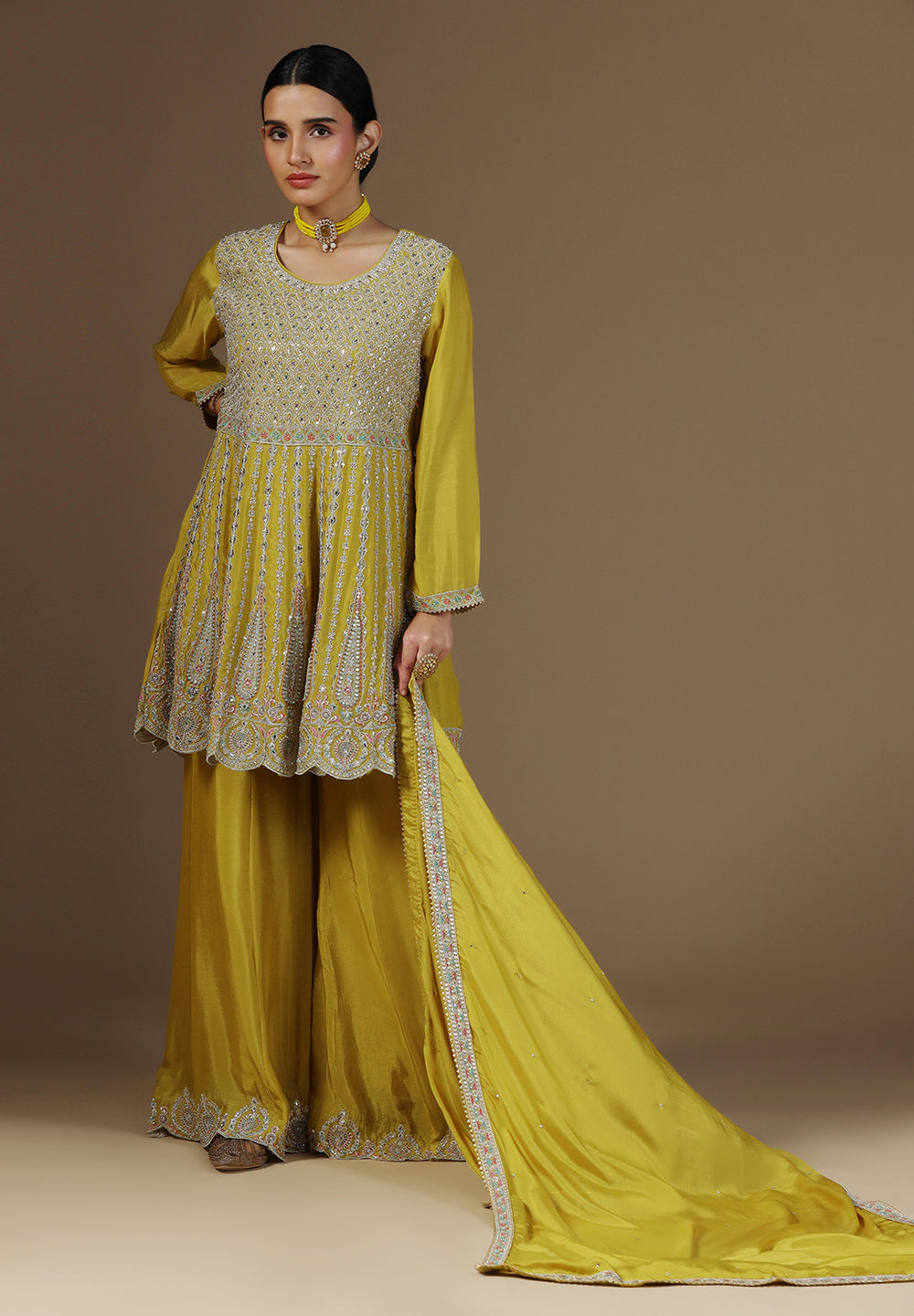 - Complement your look with embroidered juttis or block heels.