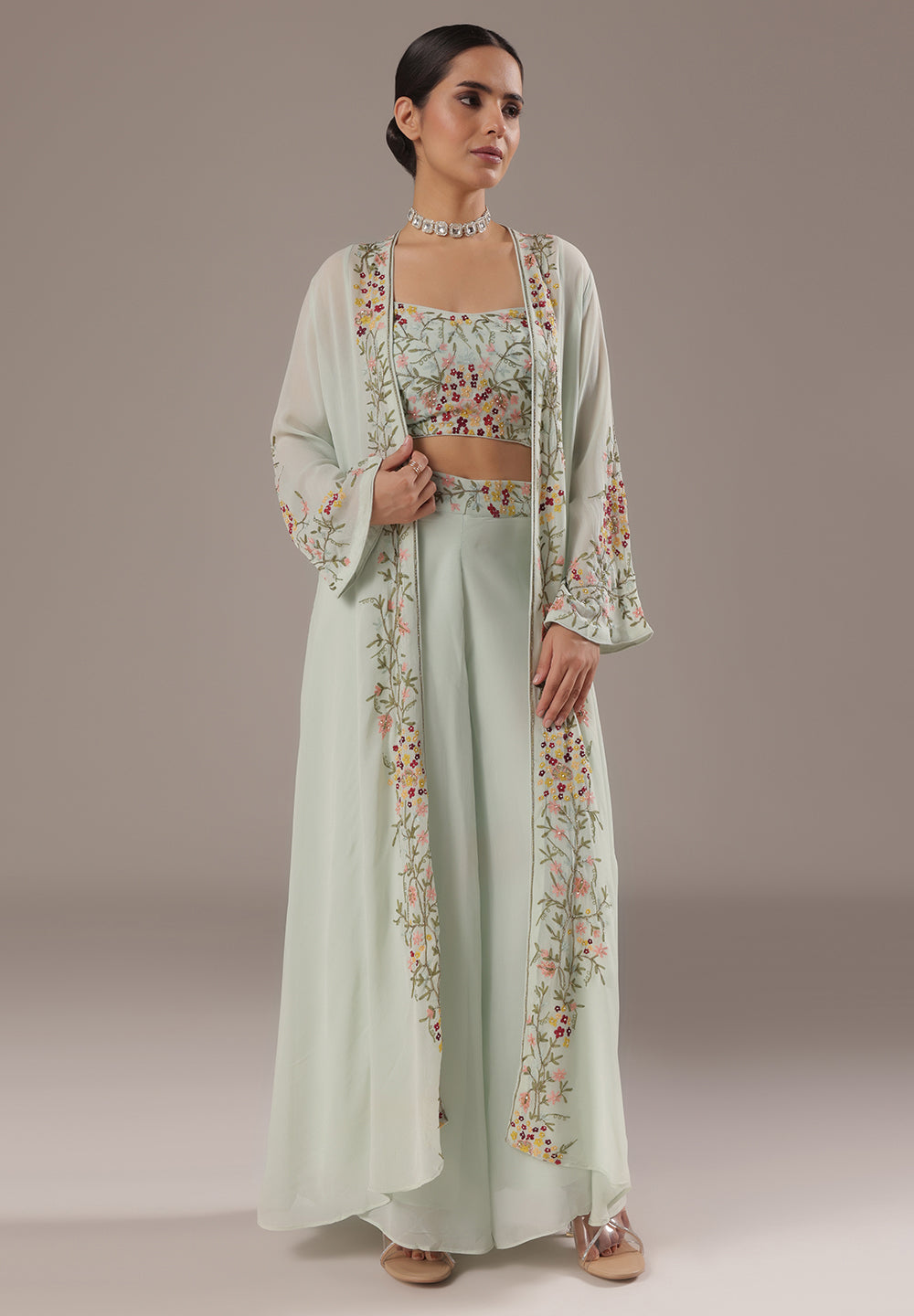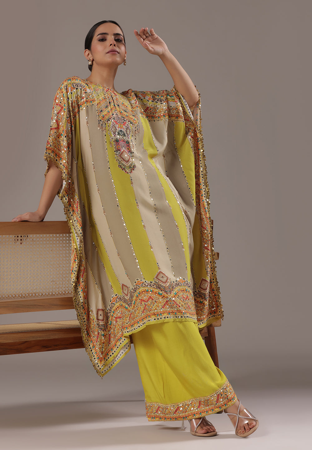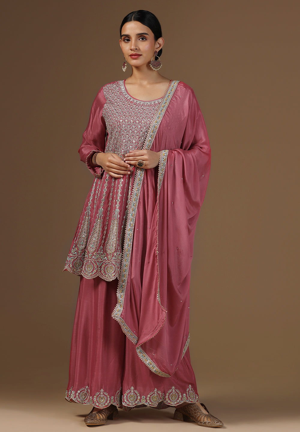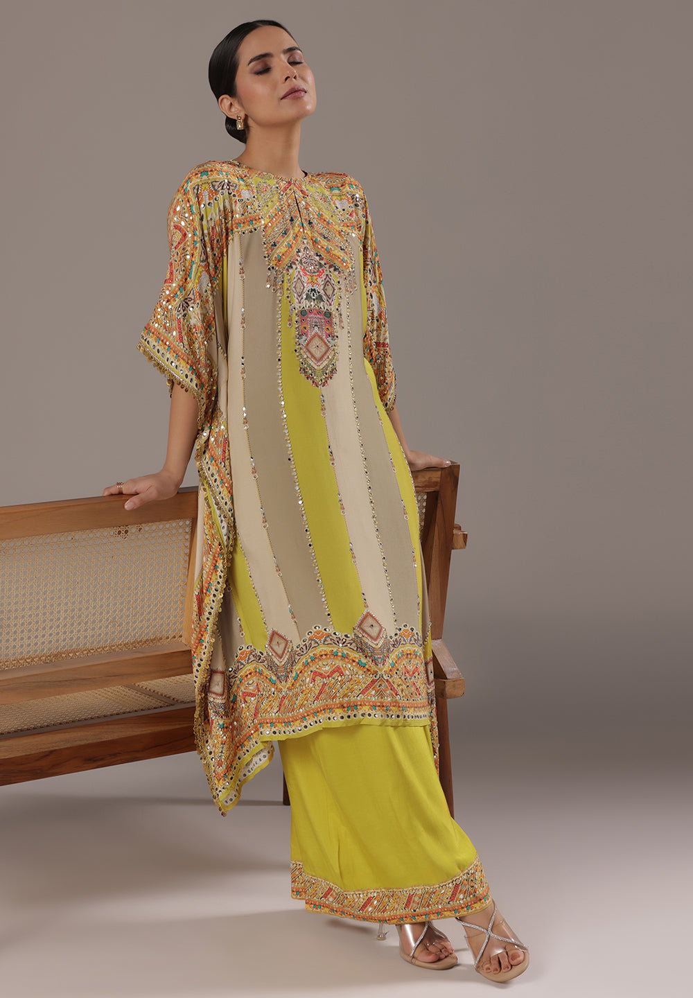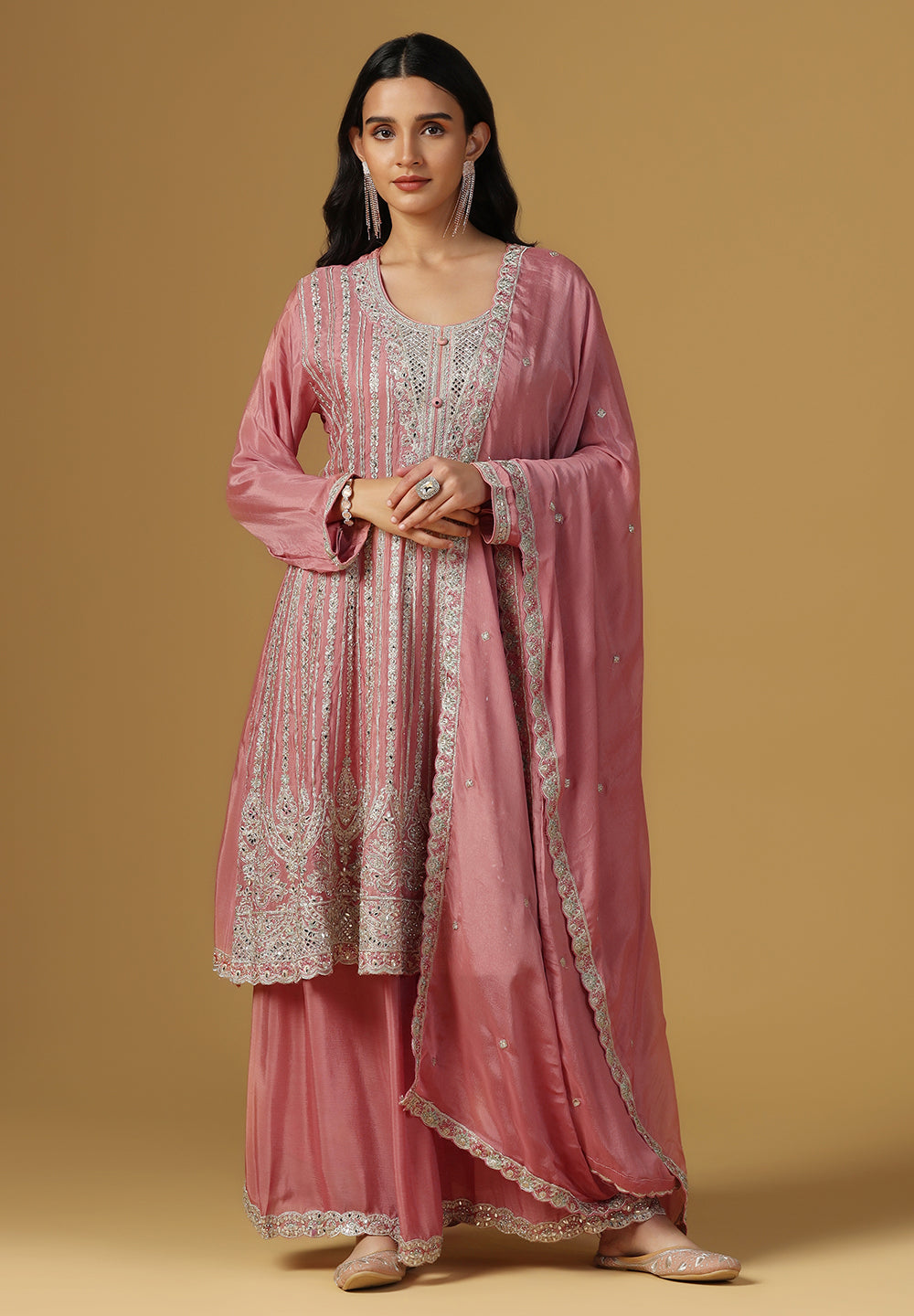 - Complement your look with embroidered juttis or block heels.