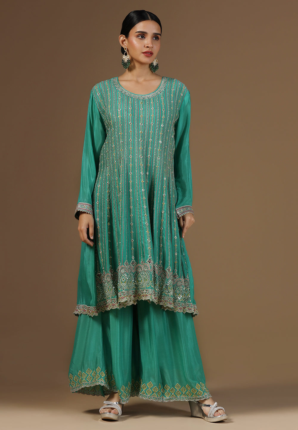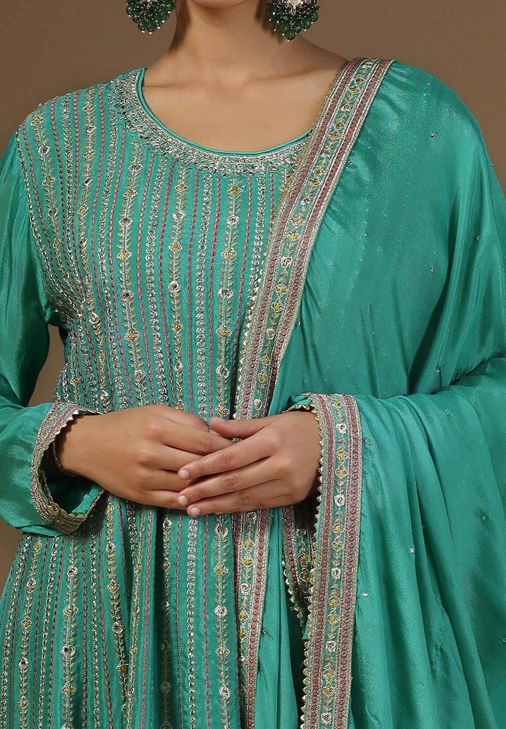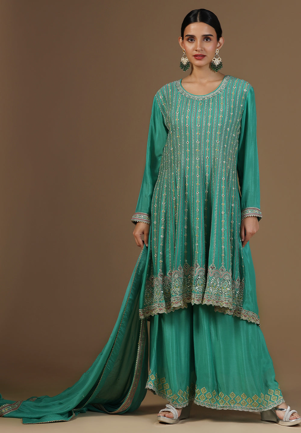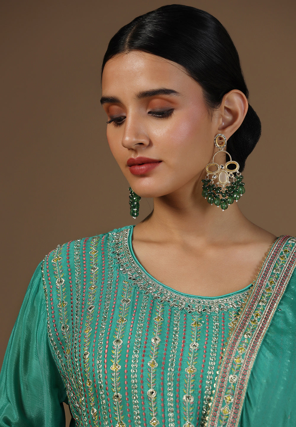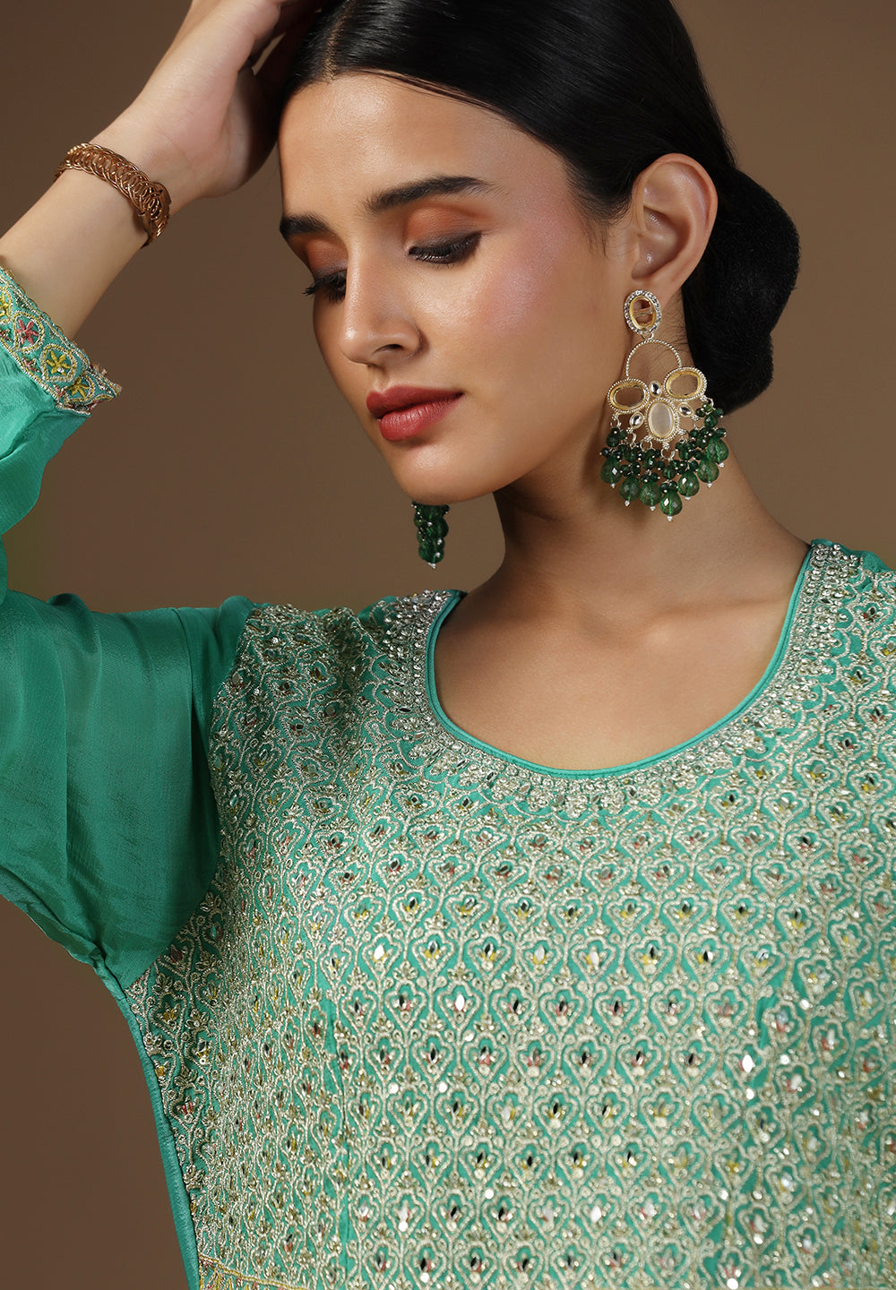 - Accessorize with gold jhumkas or kundan chokers to enhance zari and sequin work.