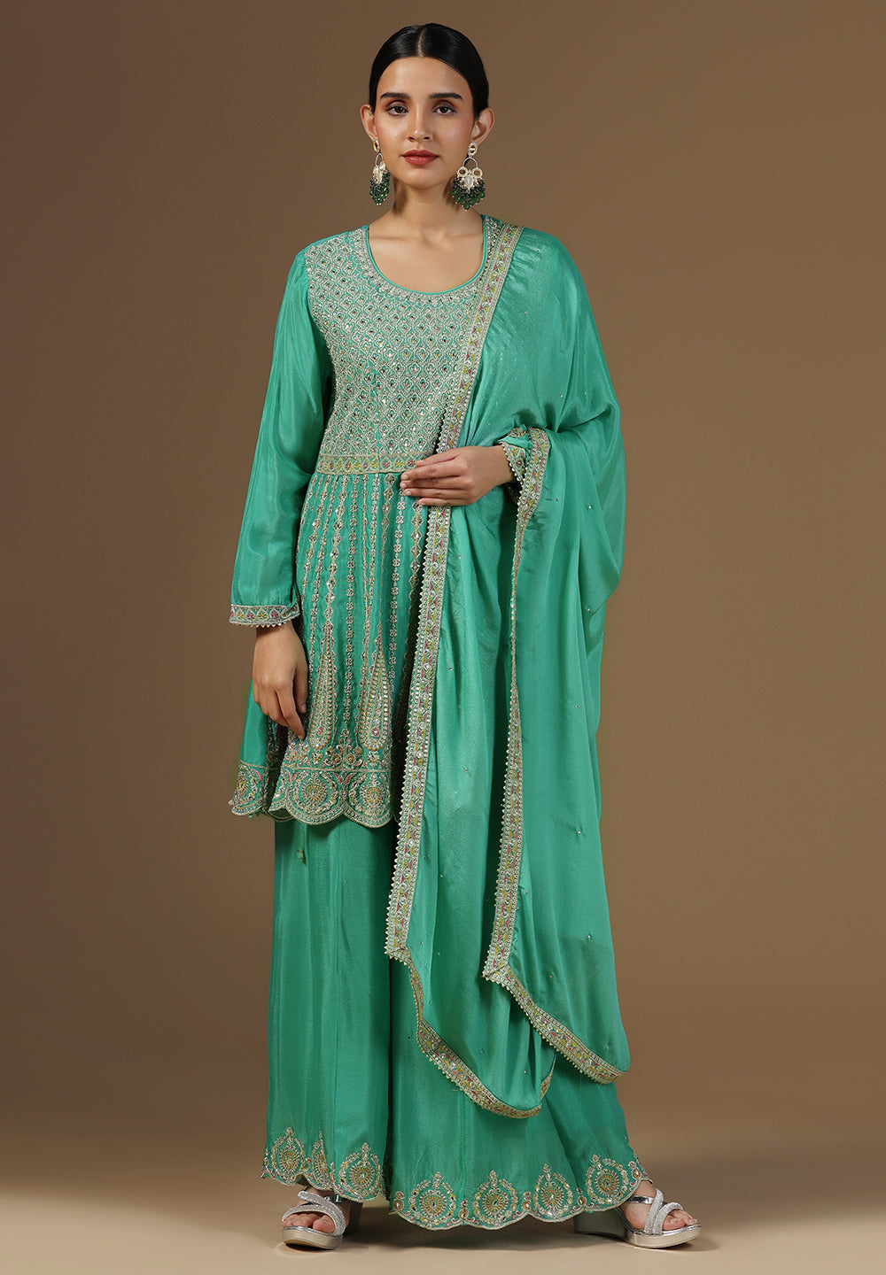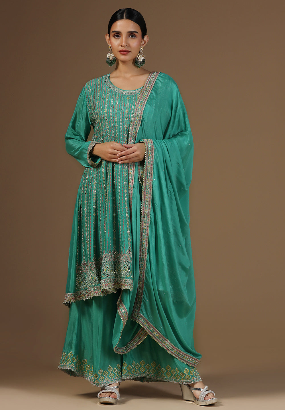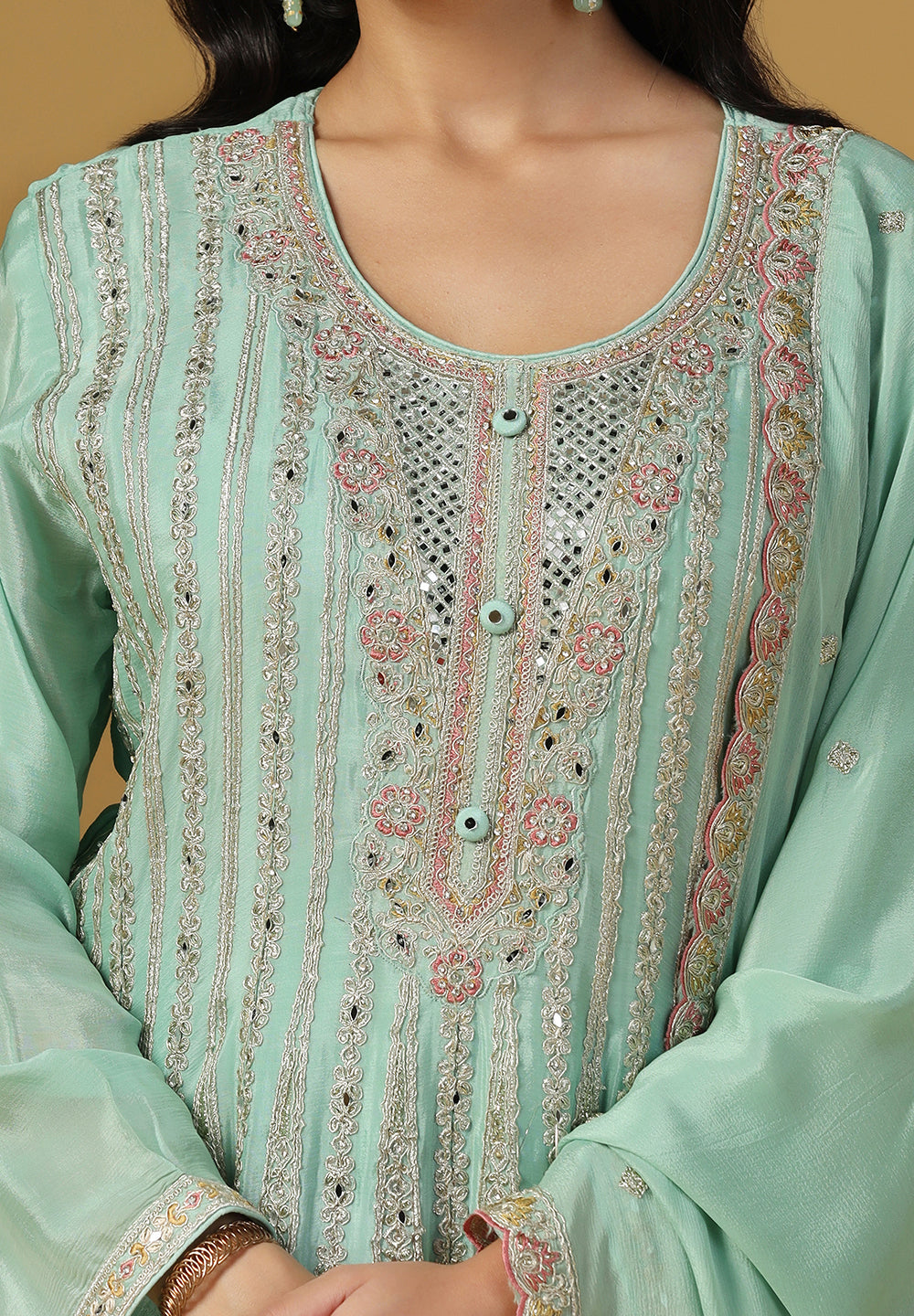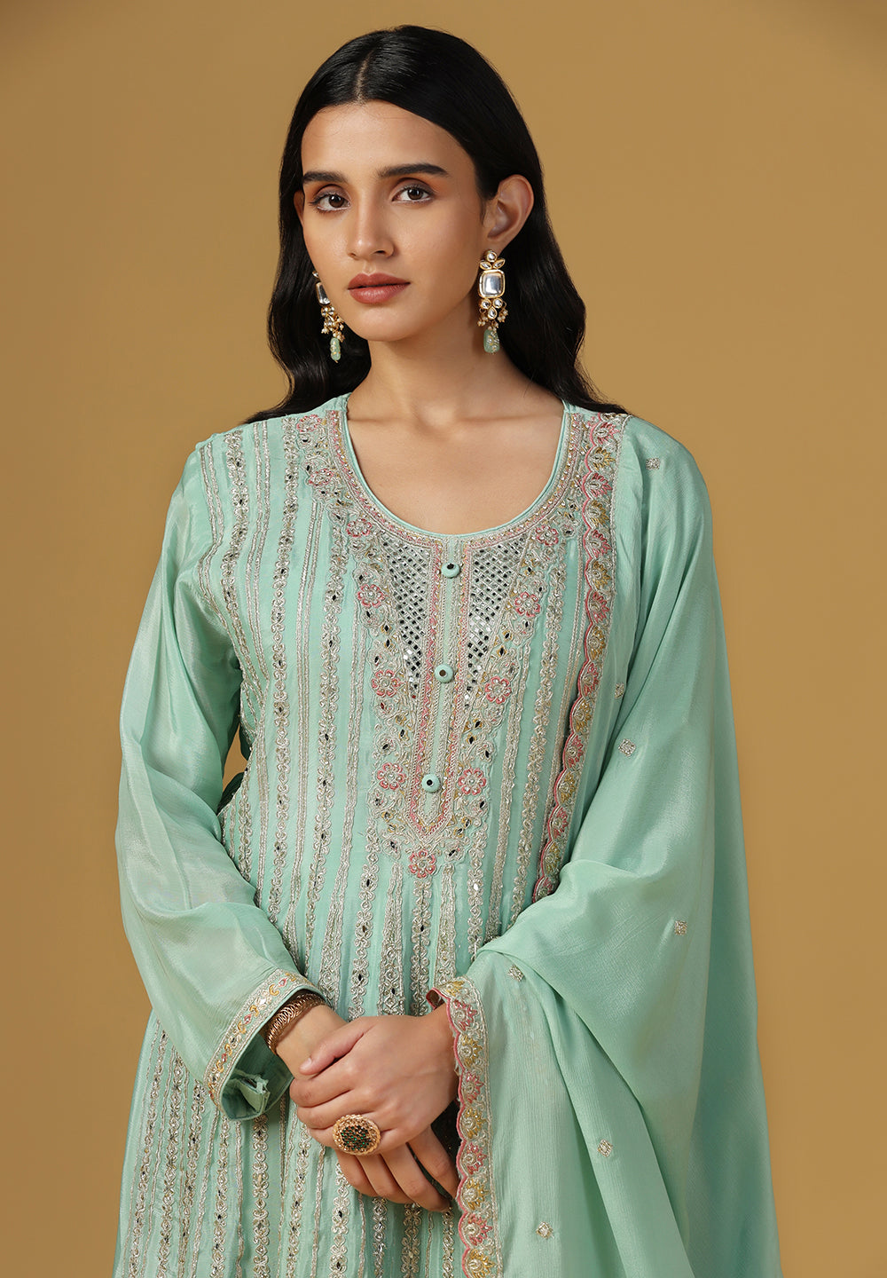 - Accessorize with gold jhumkas or kundan chokers to enhance zari and sequin work.