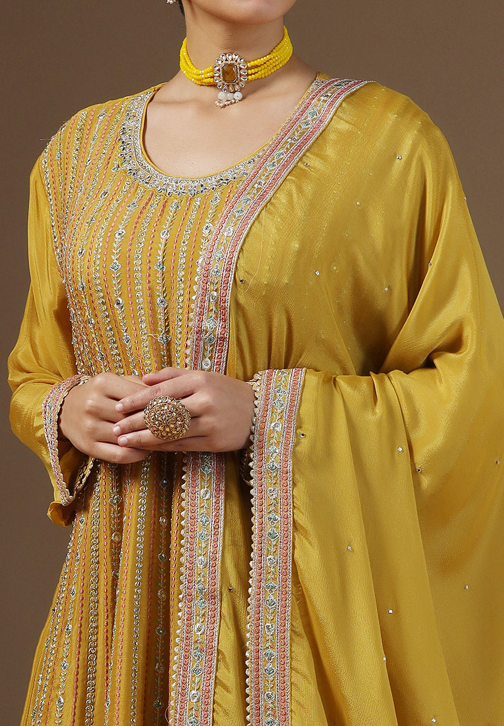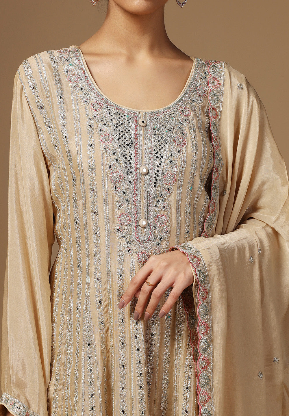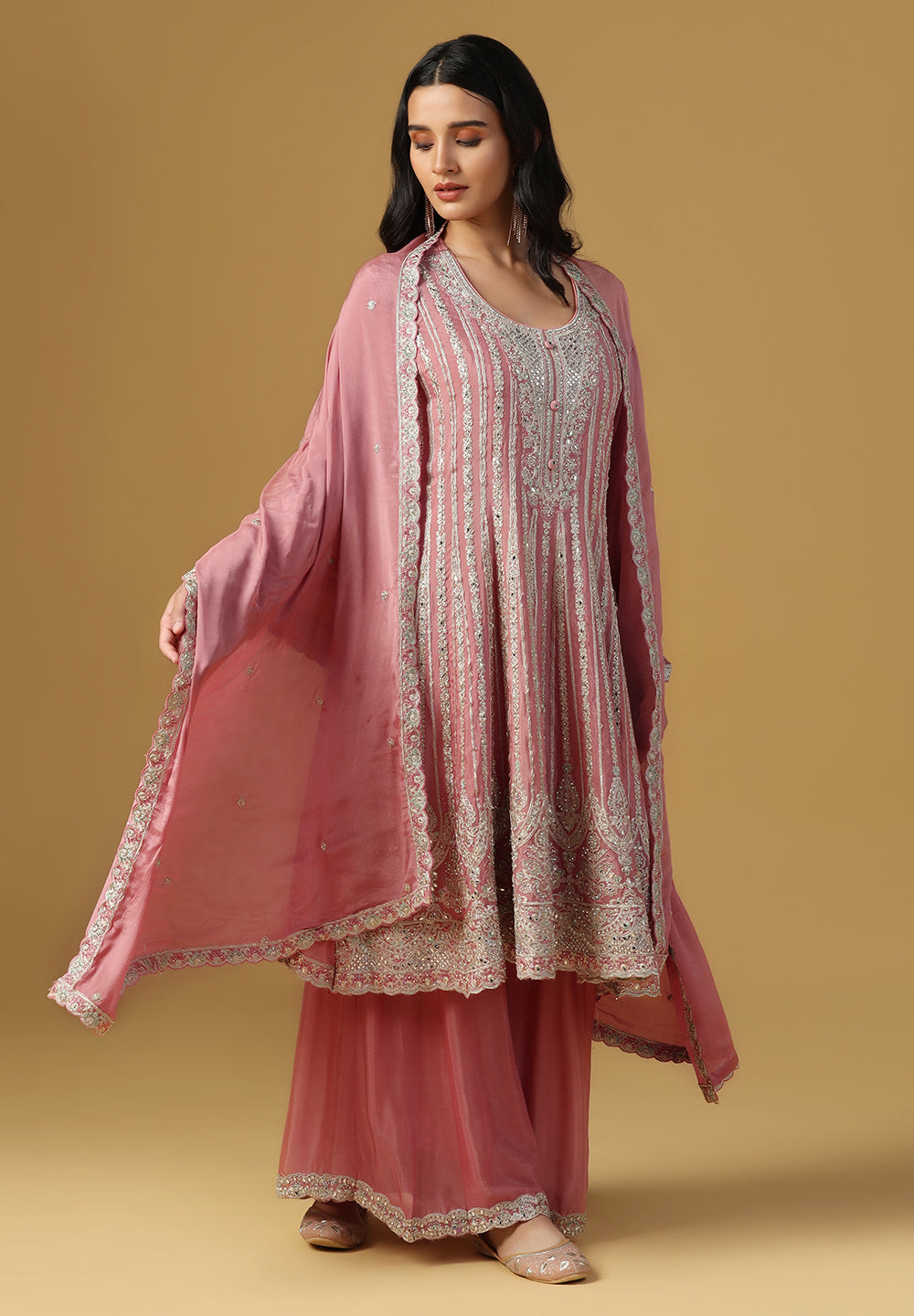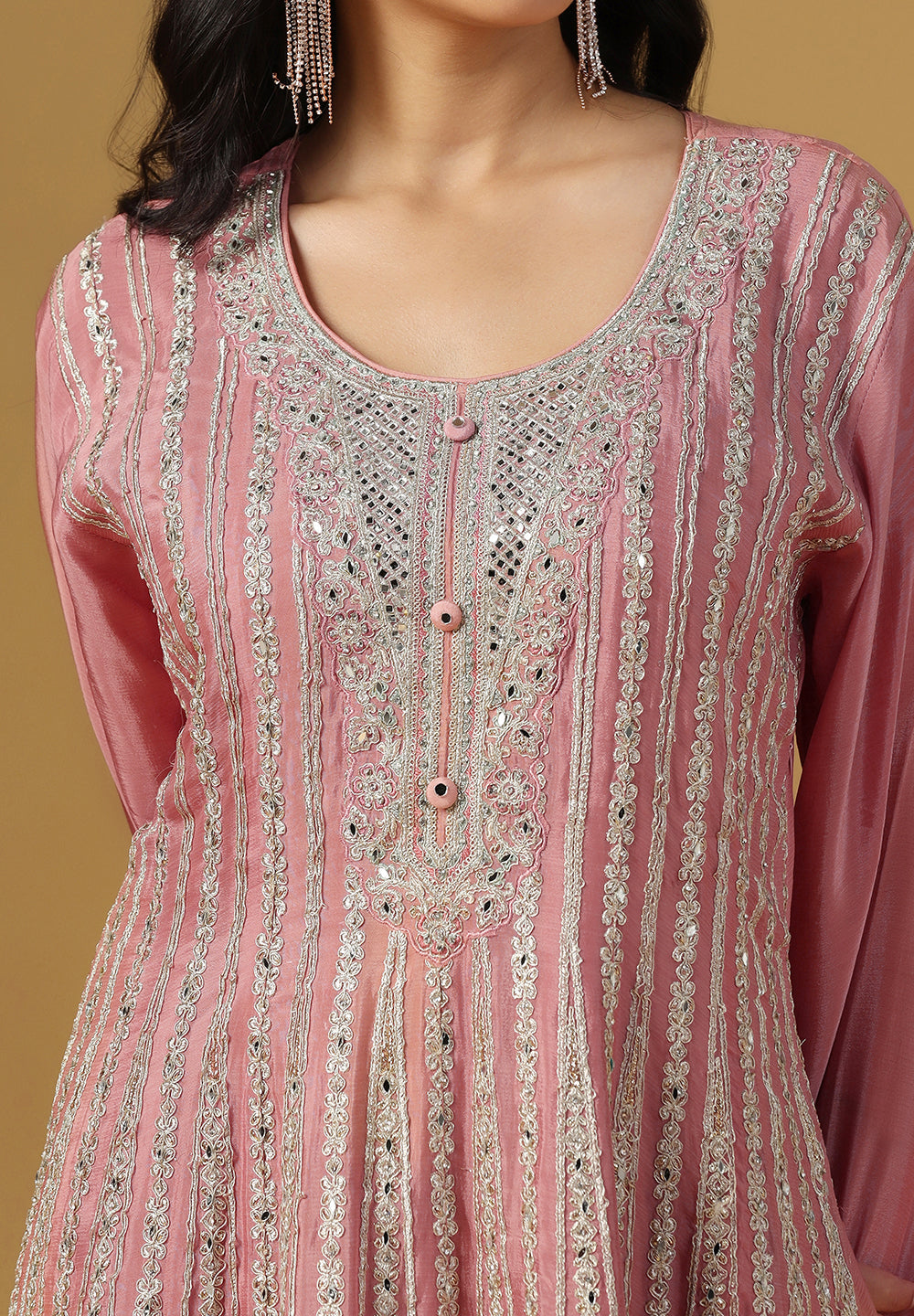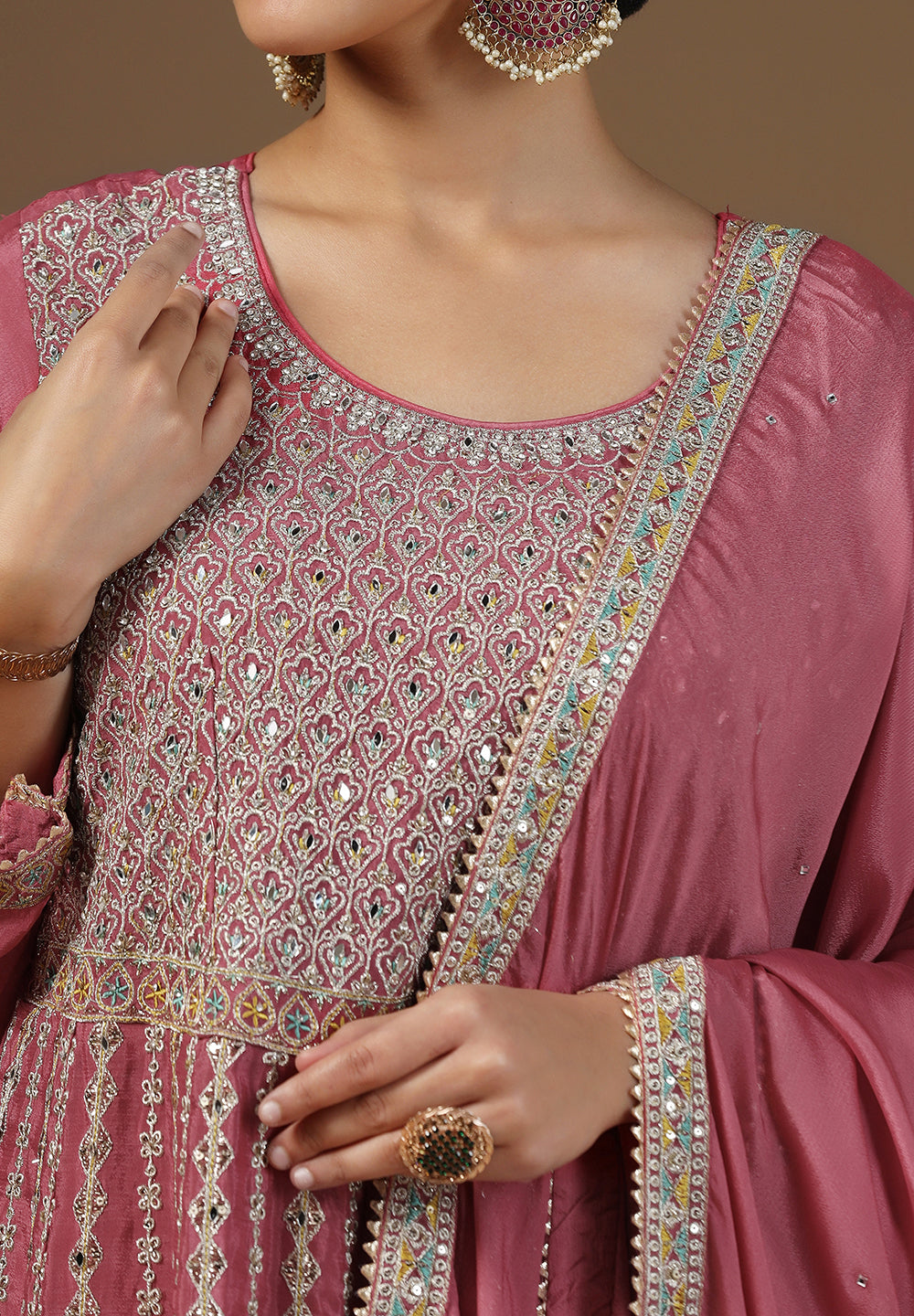 - Accessorize with gold jhumkas or kundan chokers to enhance zari and sequin work.