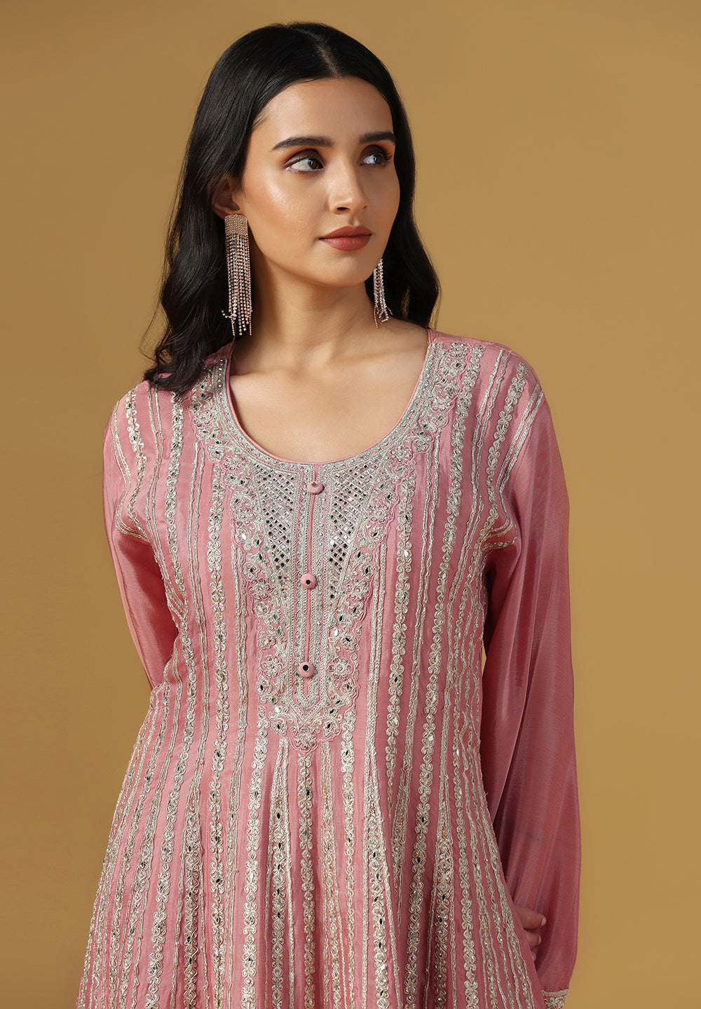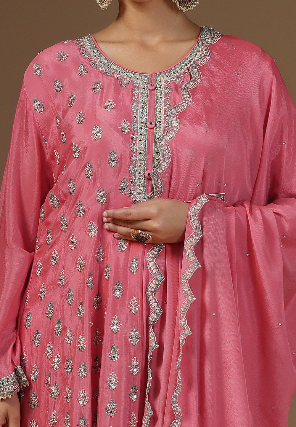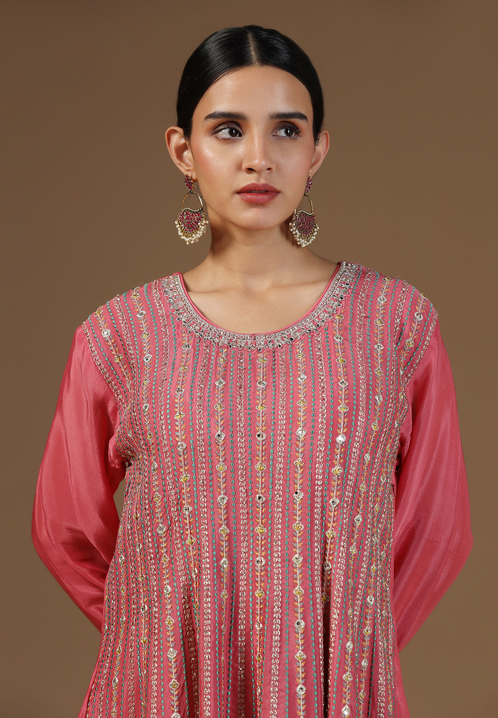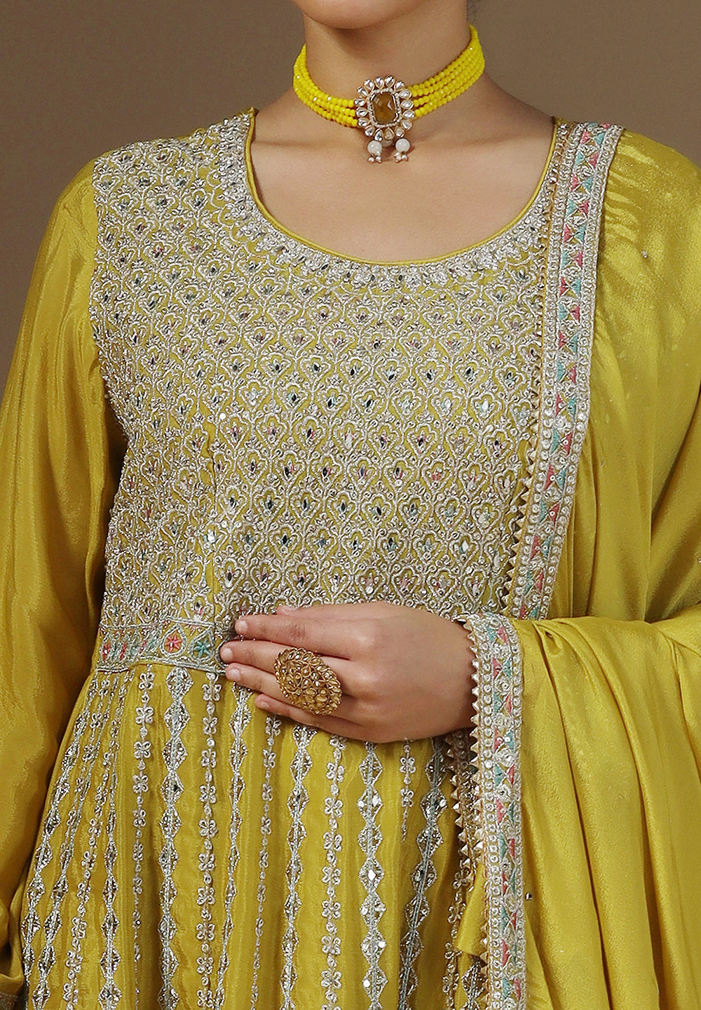 - Accessorize with gold jhumkas or kundan chokers to enhance zari and sequin work.