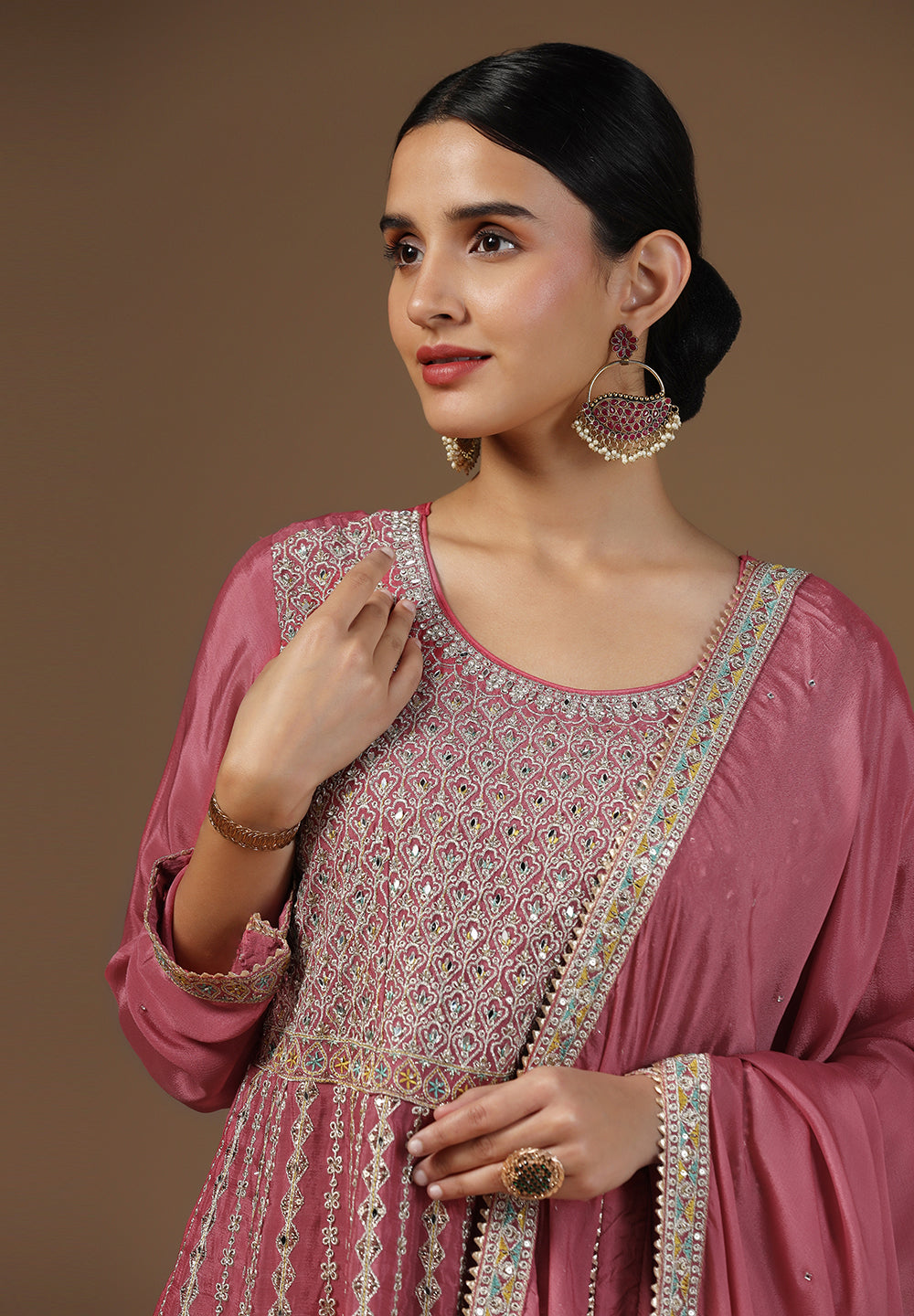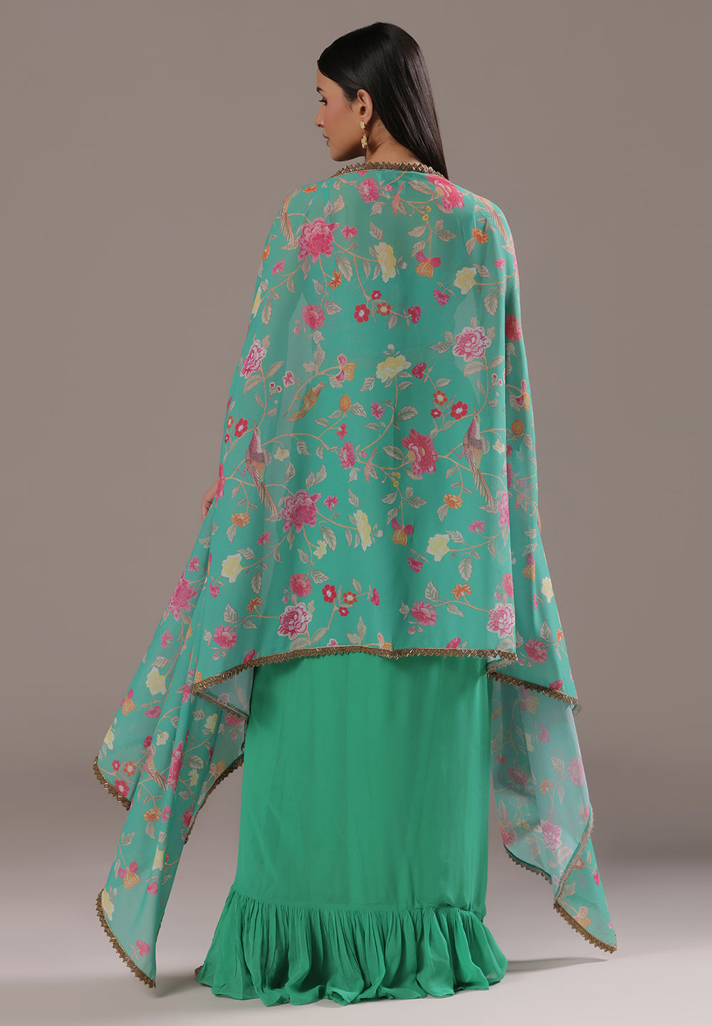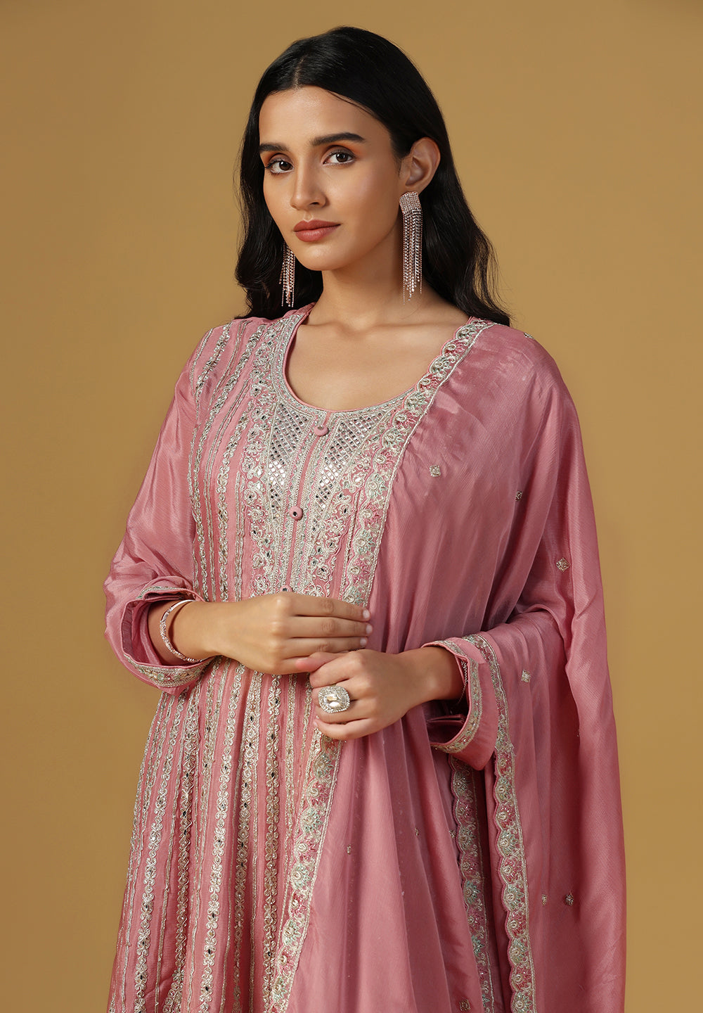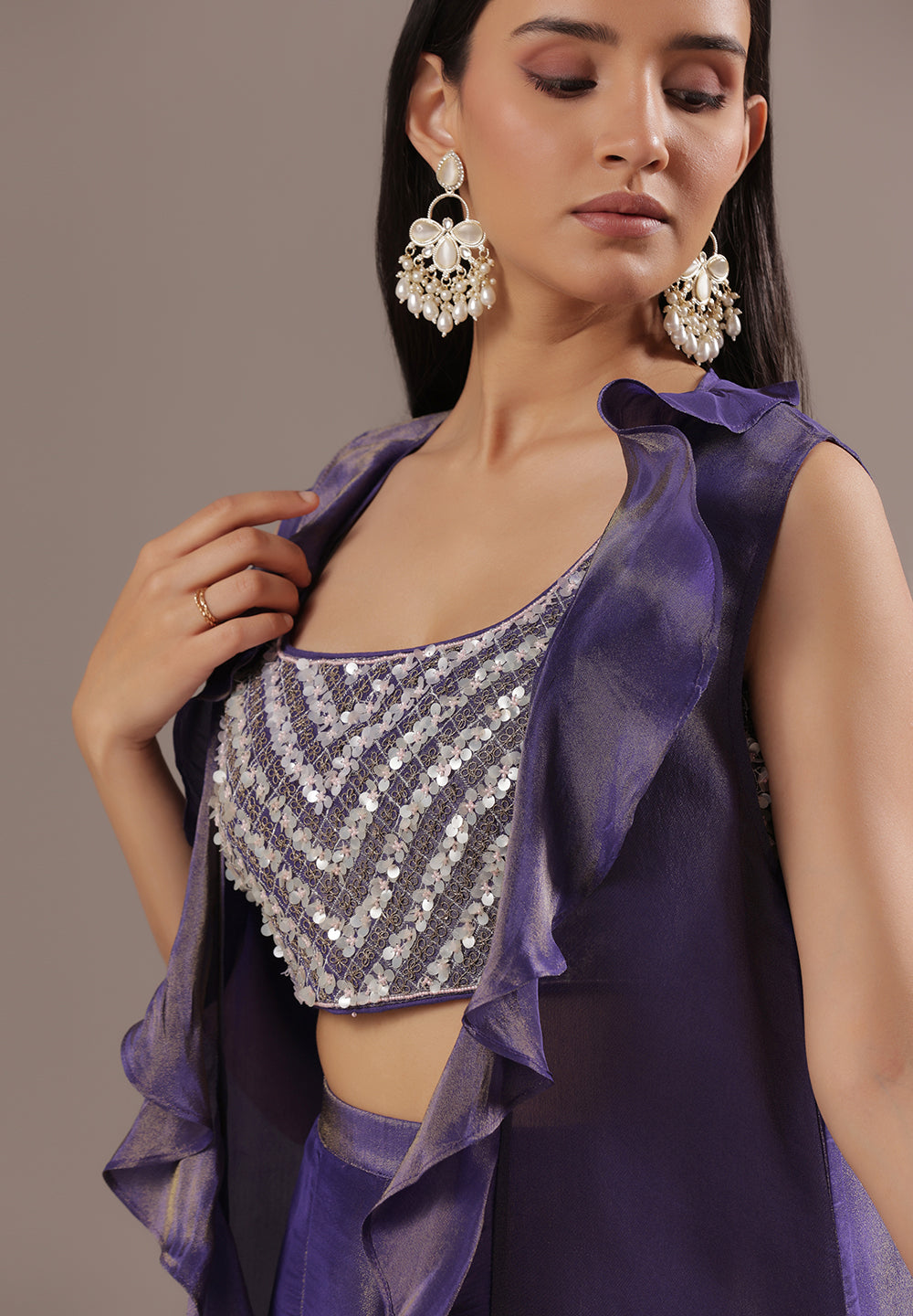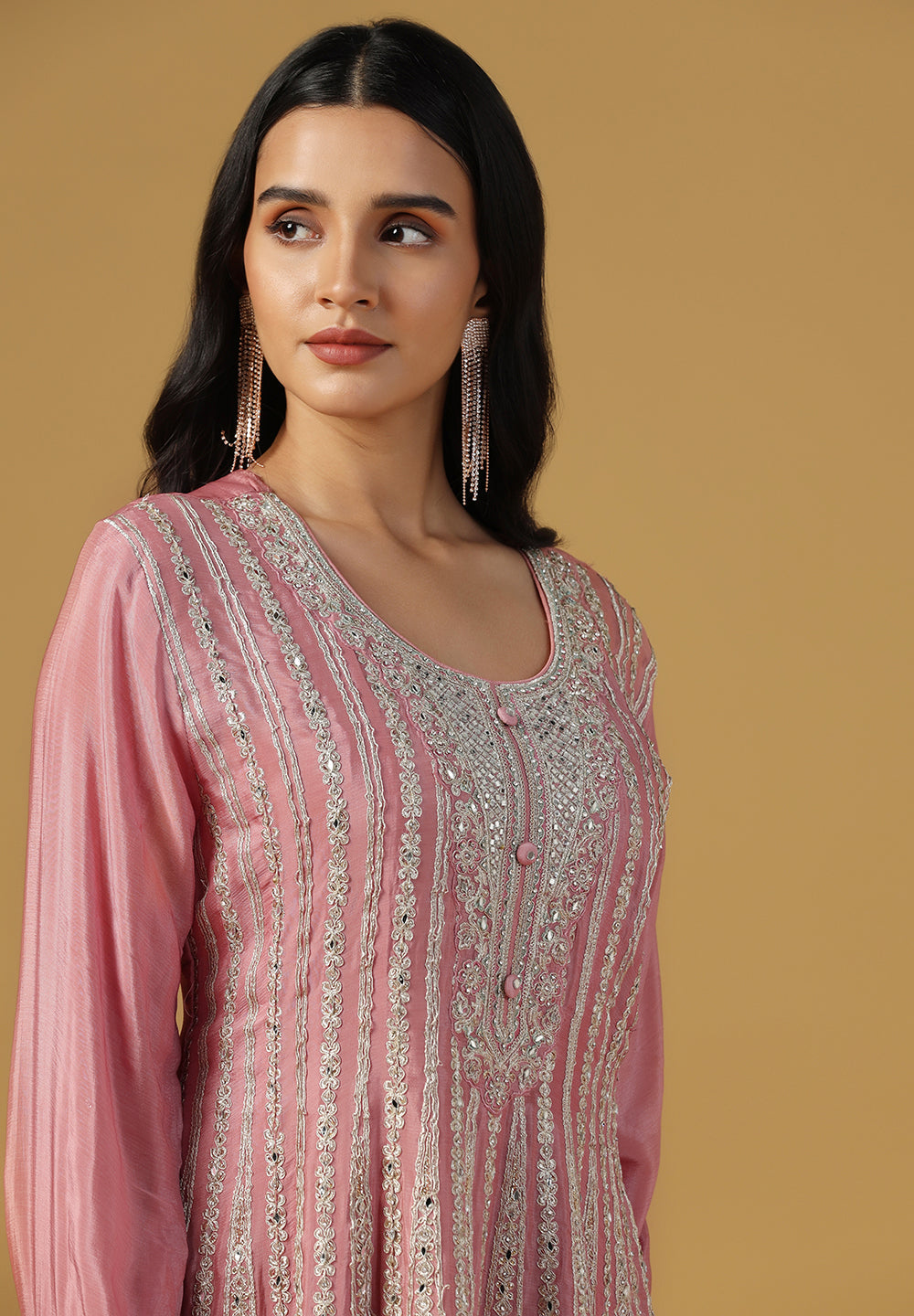 - Accessorize with gold jhumkas or kundan chokers to enhance zari and sequin work.