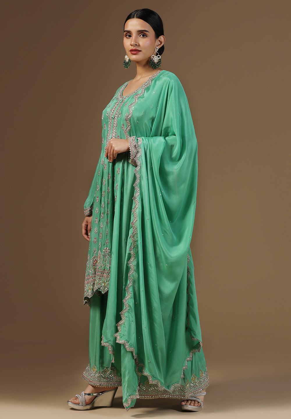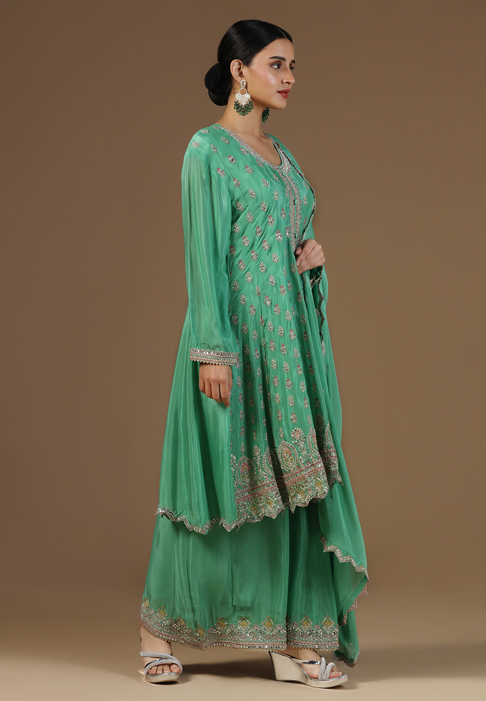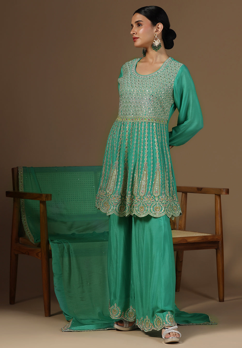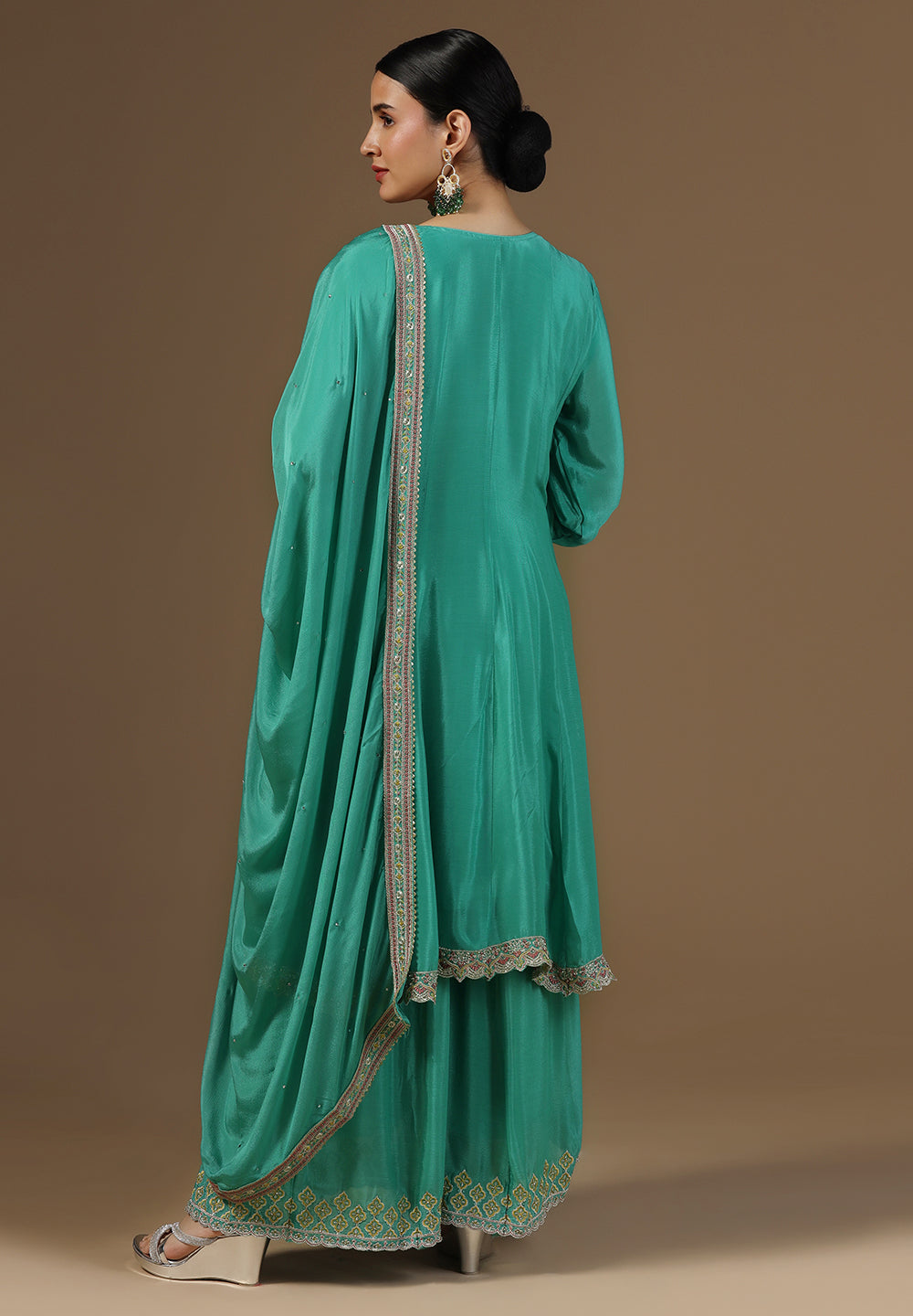 Style with statement earrings and embroidered heels for a graceful ethnic look.