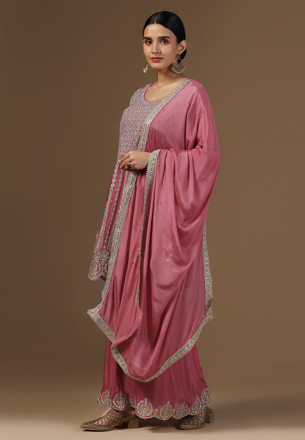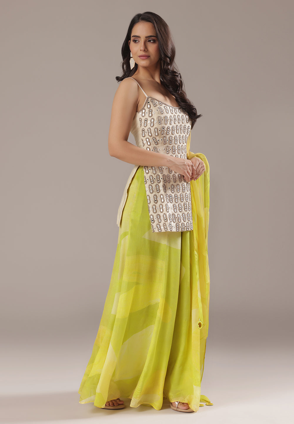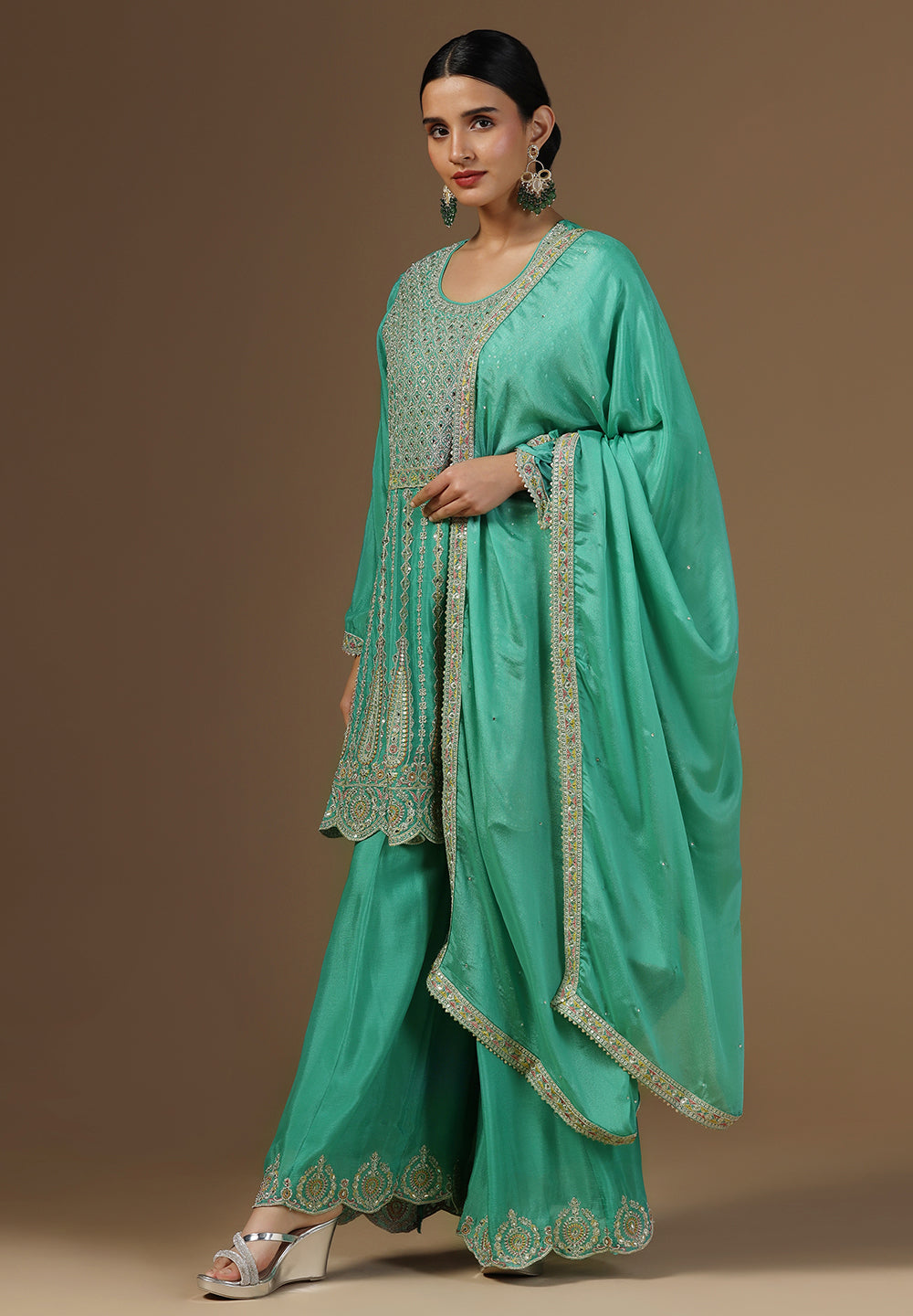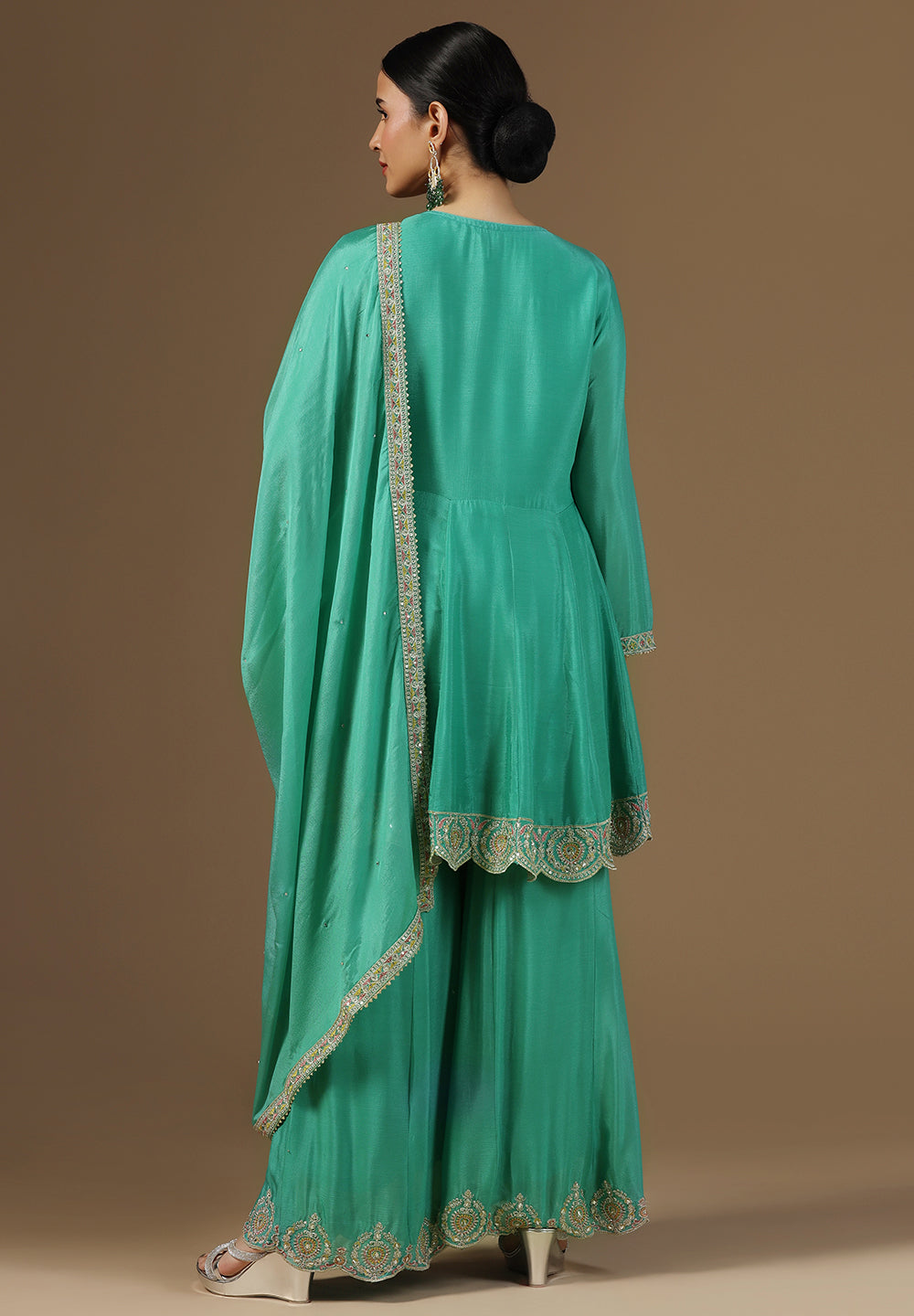 Style with statement earrings and embroidered heels for a graceful ethnic look.