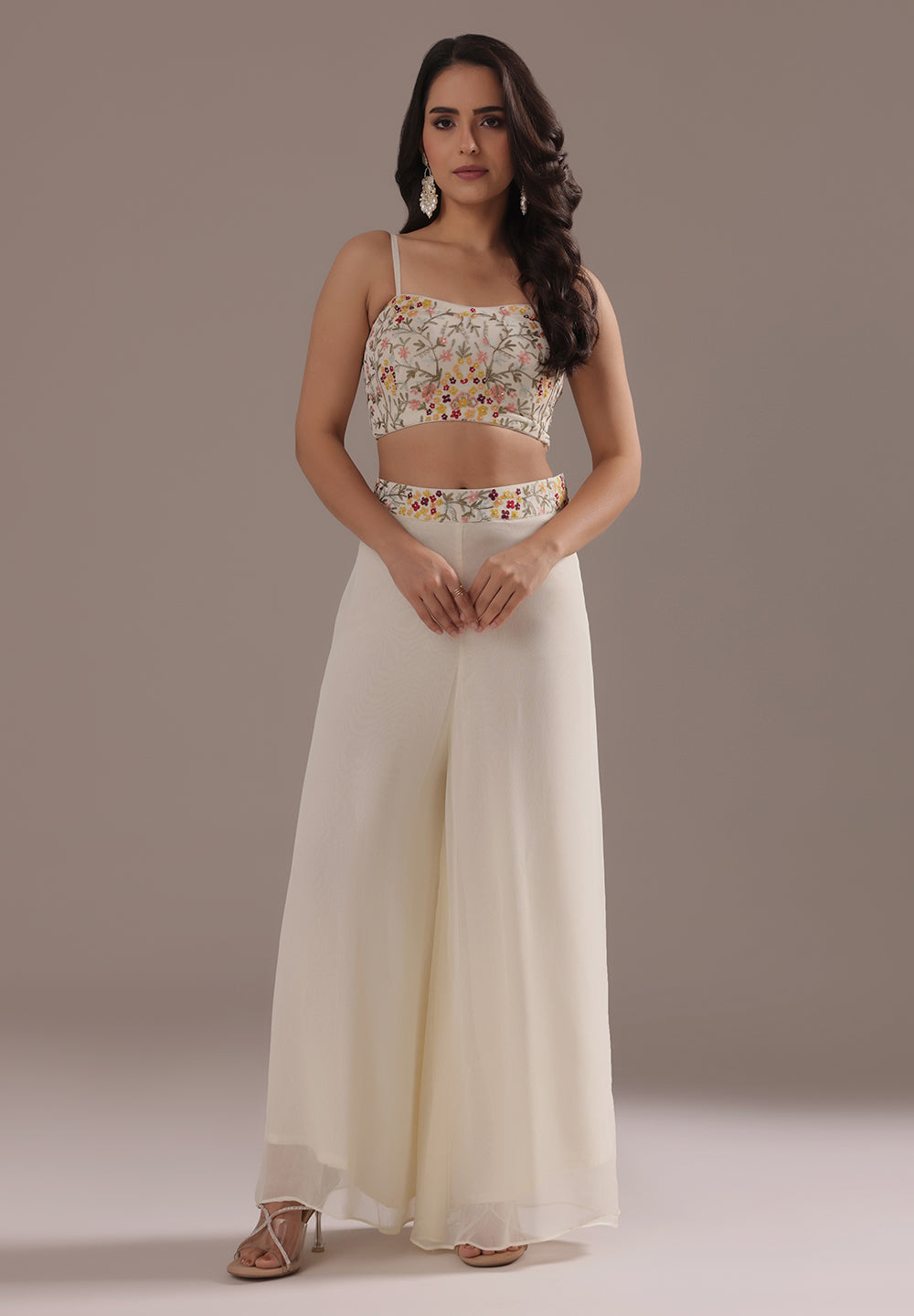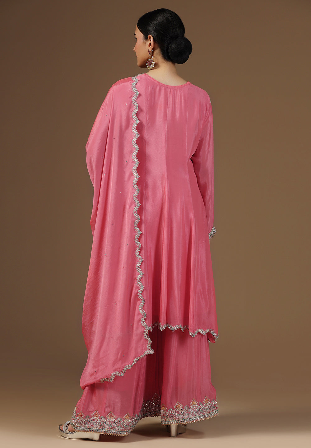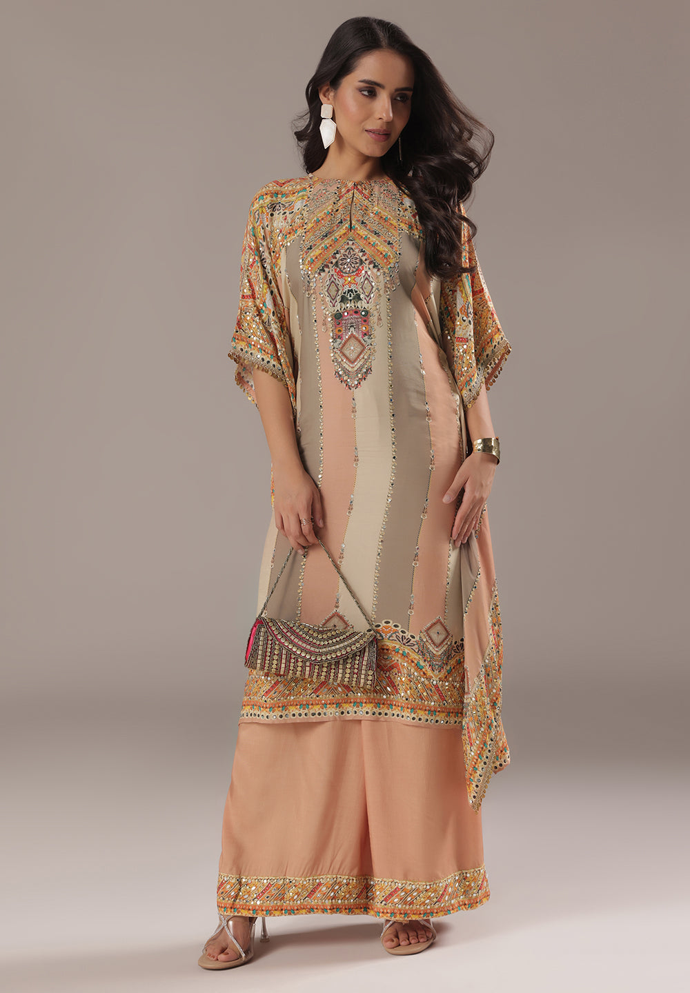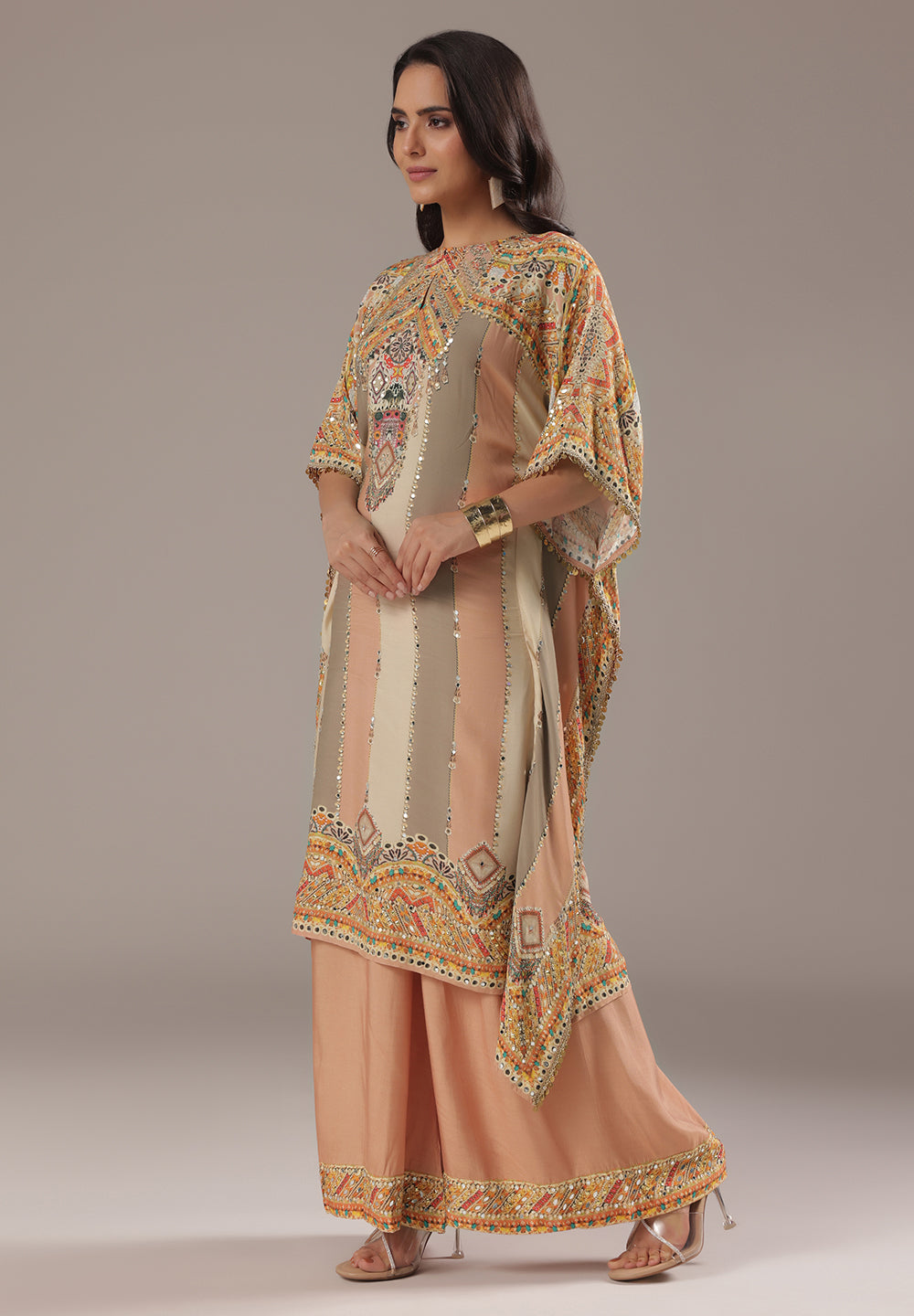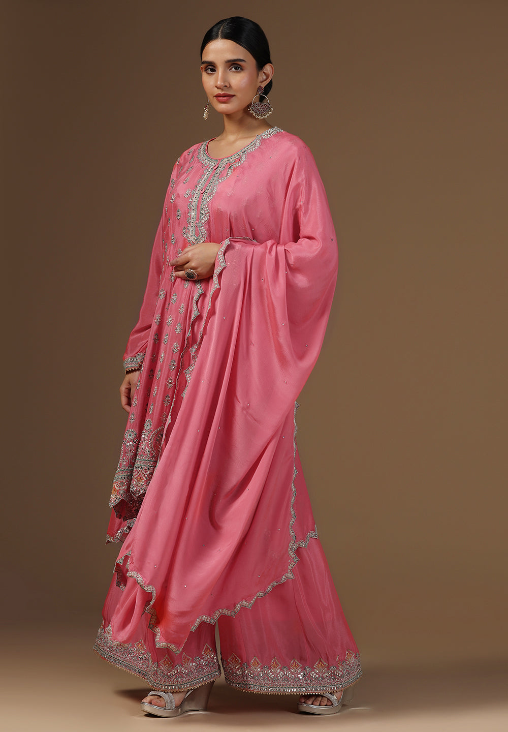 Style with statement earrings and embroidered heels for a graceful ethnic look.