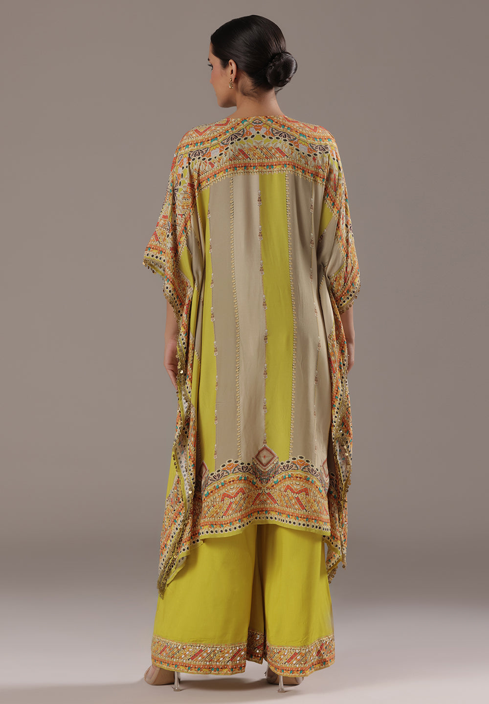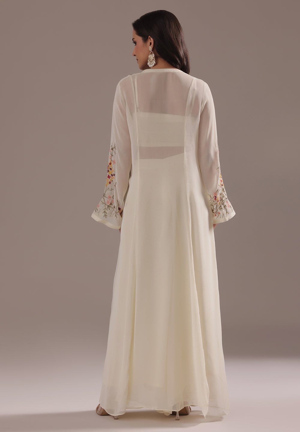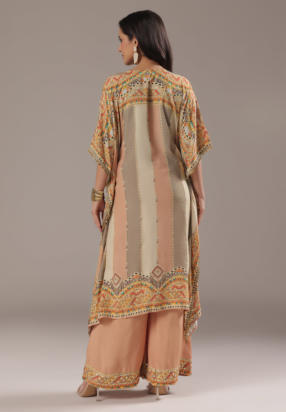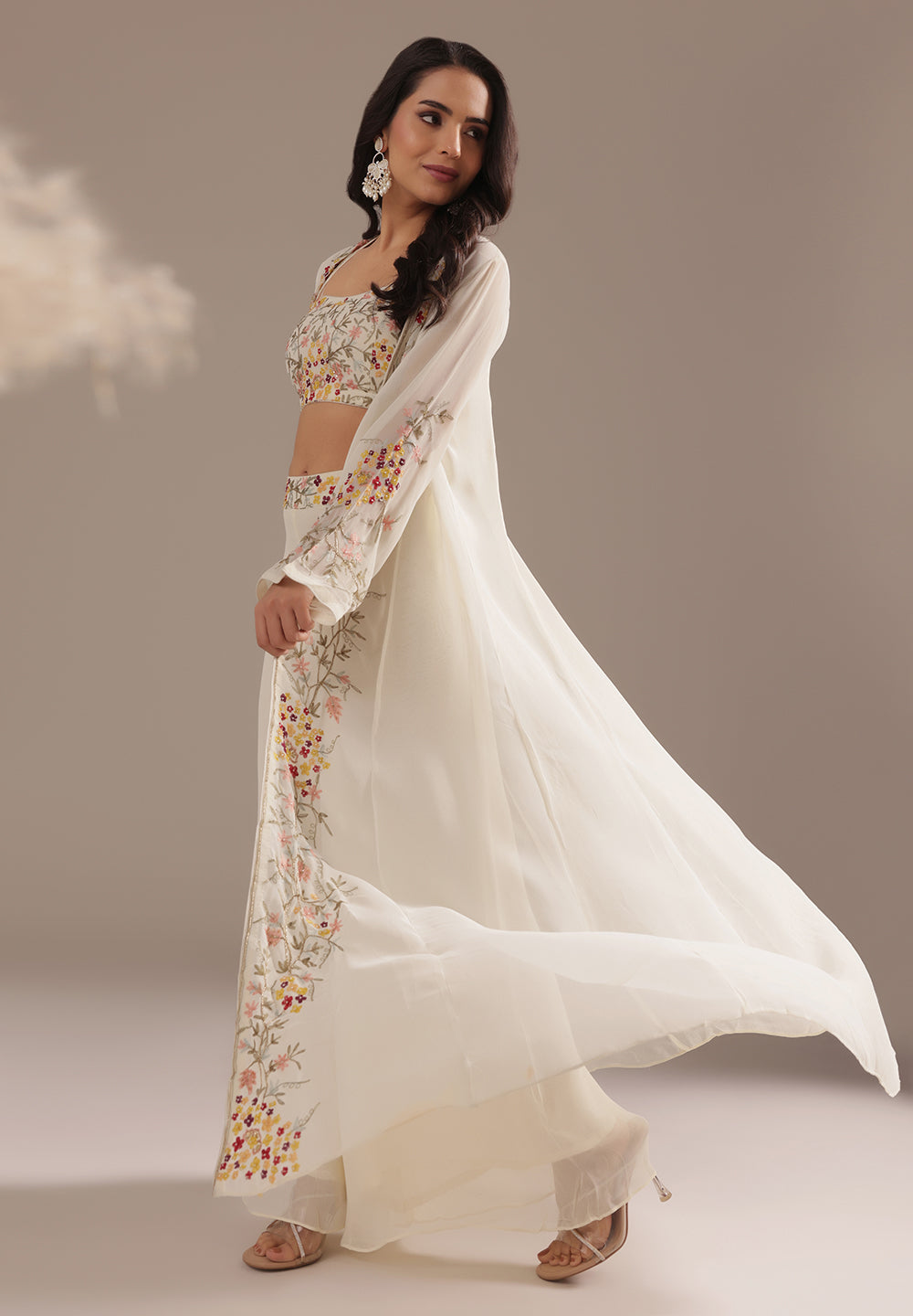 Style with statement earrings and embroidered heels for a graceful ethnic look.
