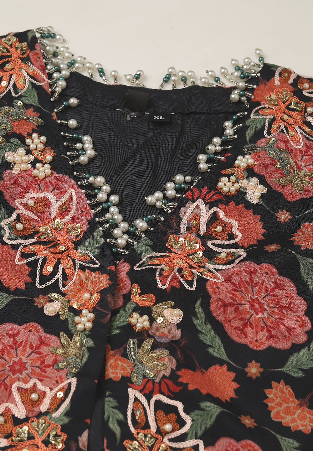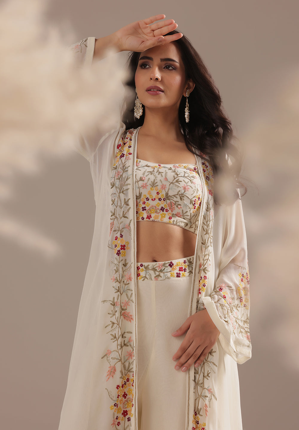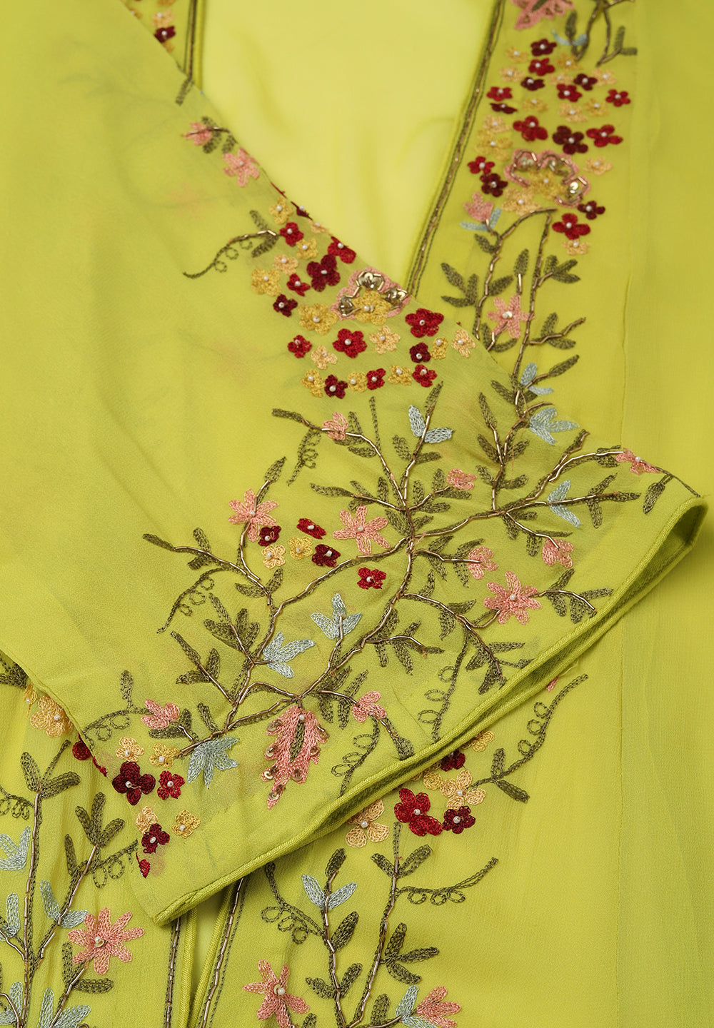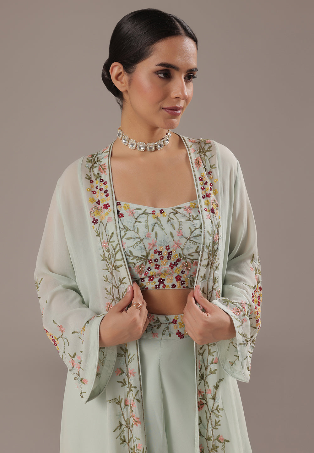 - Intricate Aari, Sequin, Zari, and Thread detailing for festive elegance.