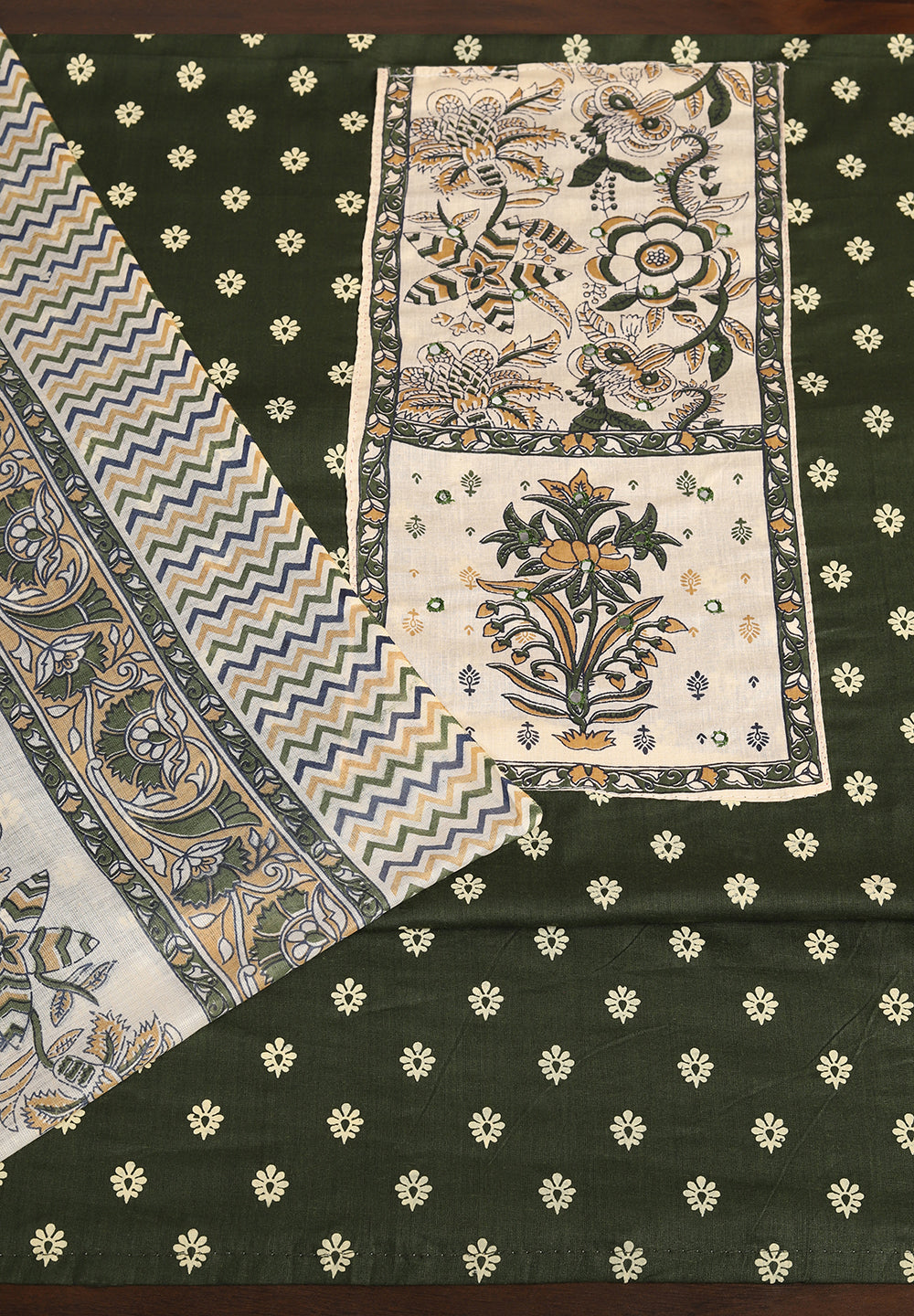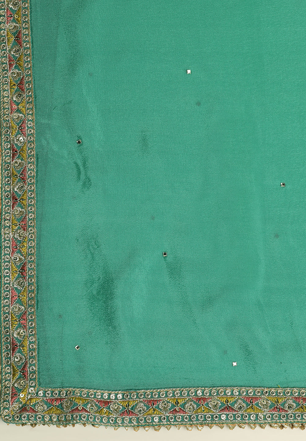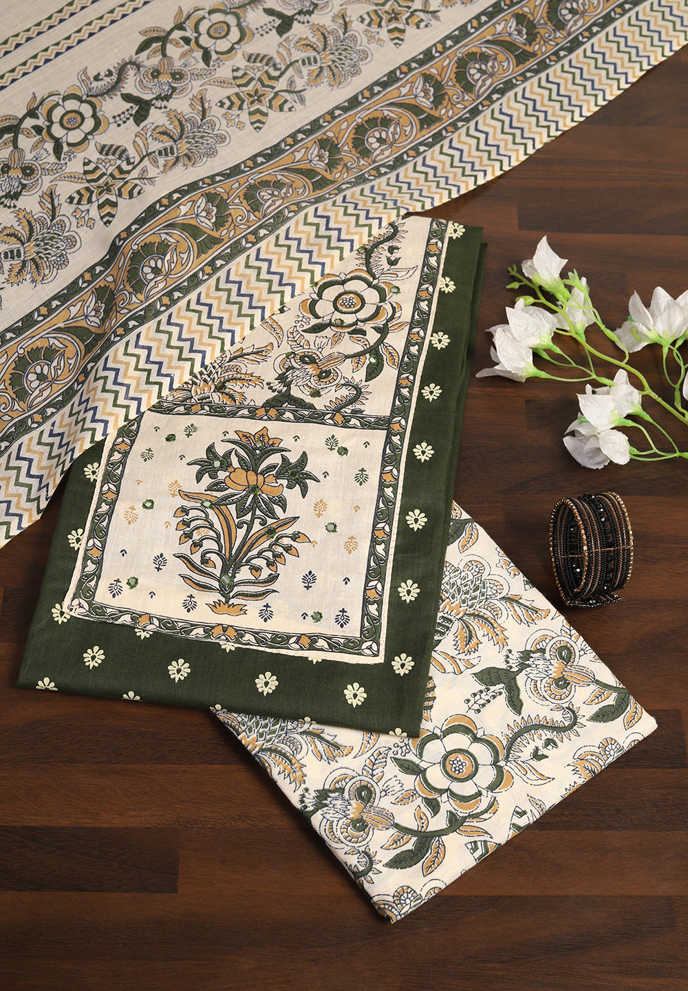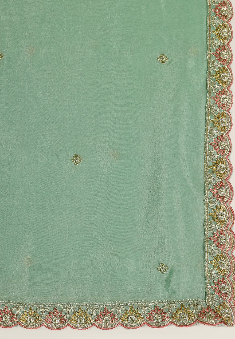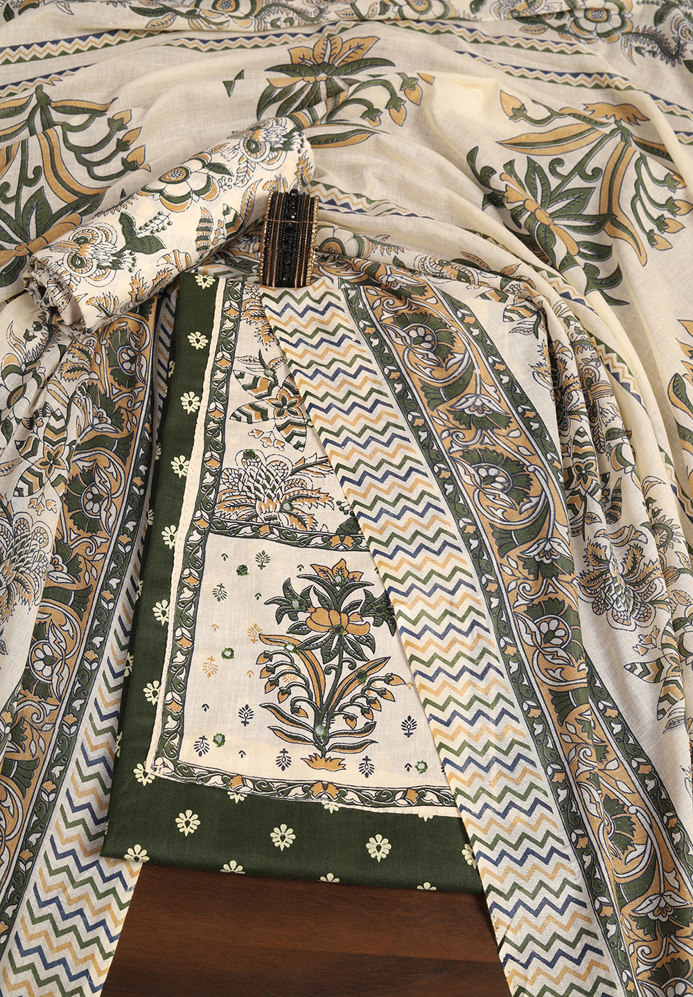 A. Golden, cream, or peach dupattas complement green suits beautifully.