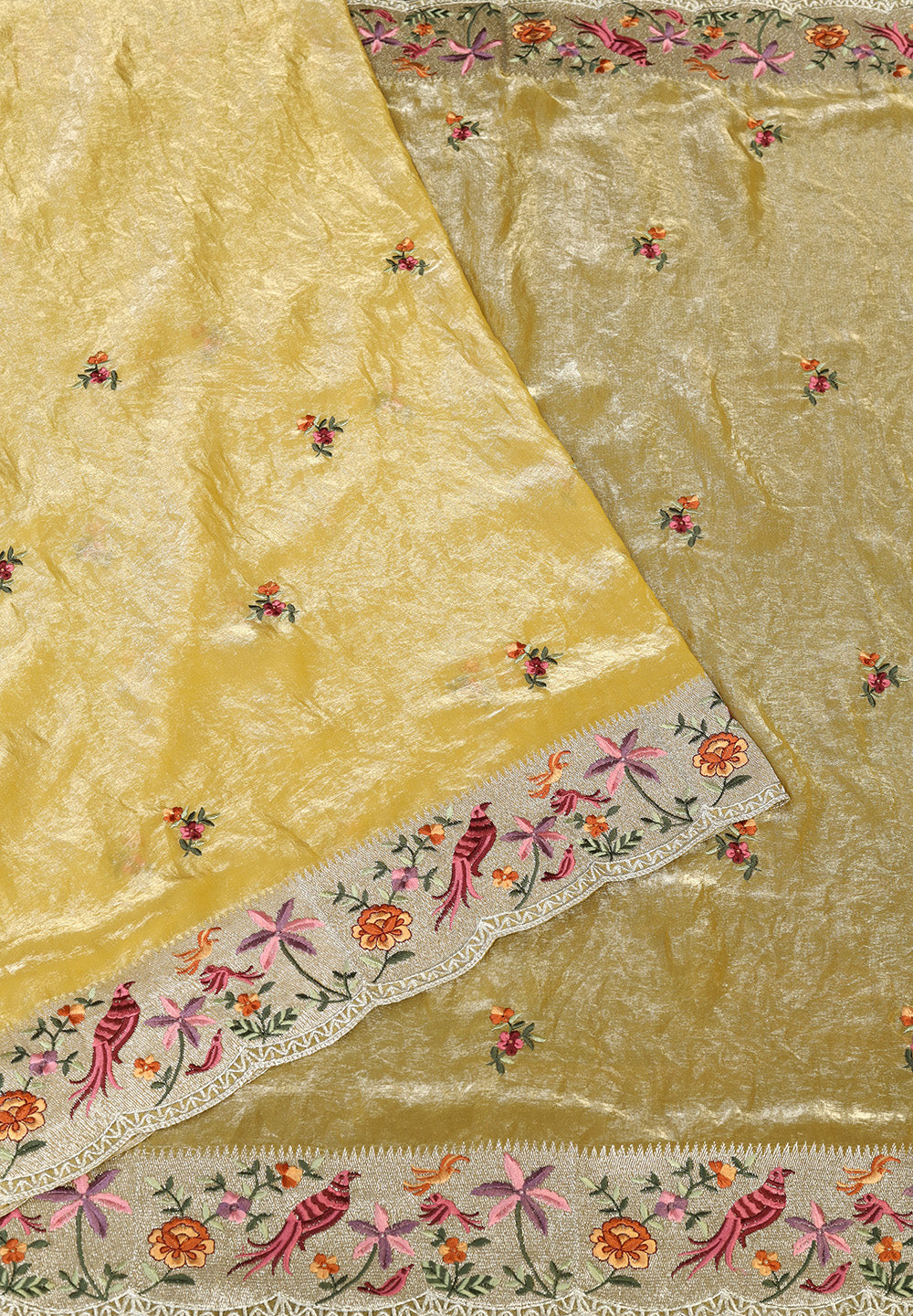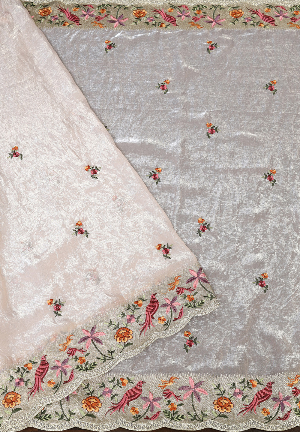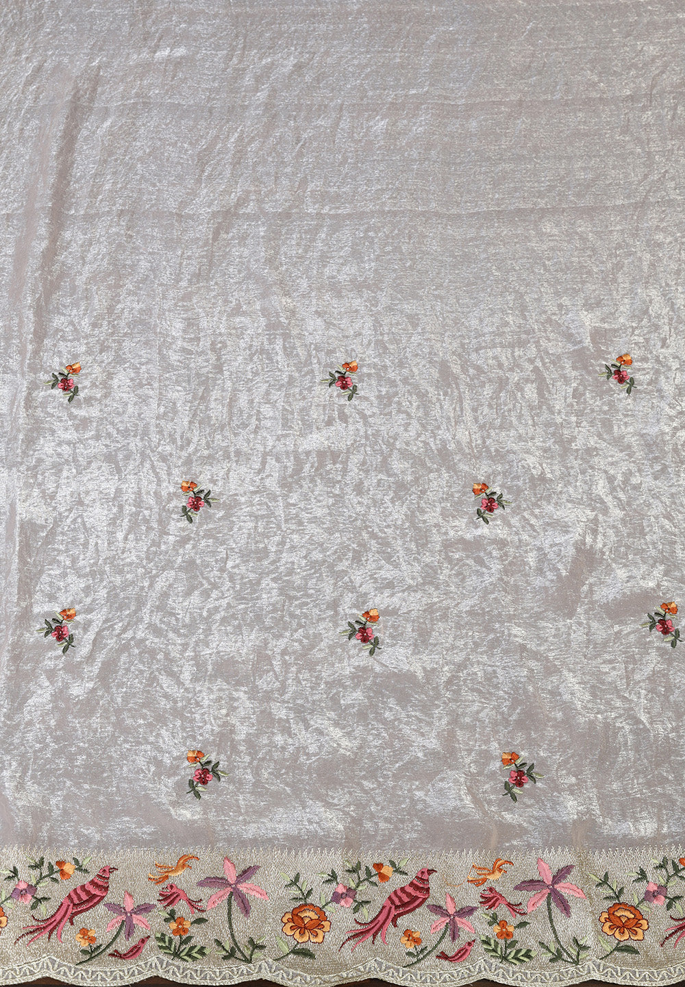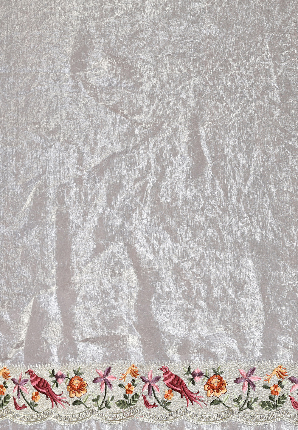 Tissue Net Saree with Artistic Threadwork Figures & Scalloped Cut-Work Border