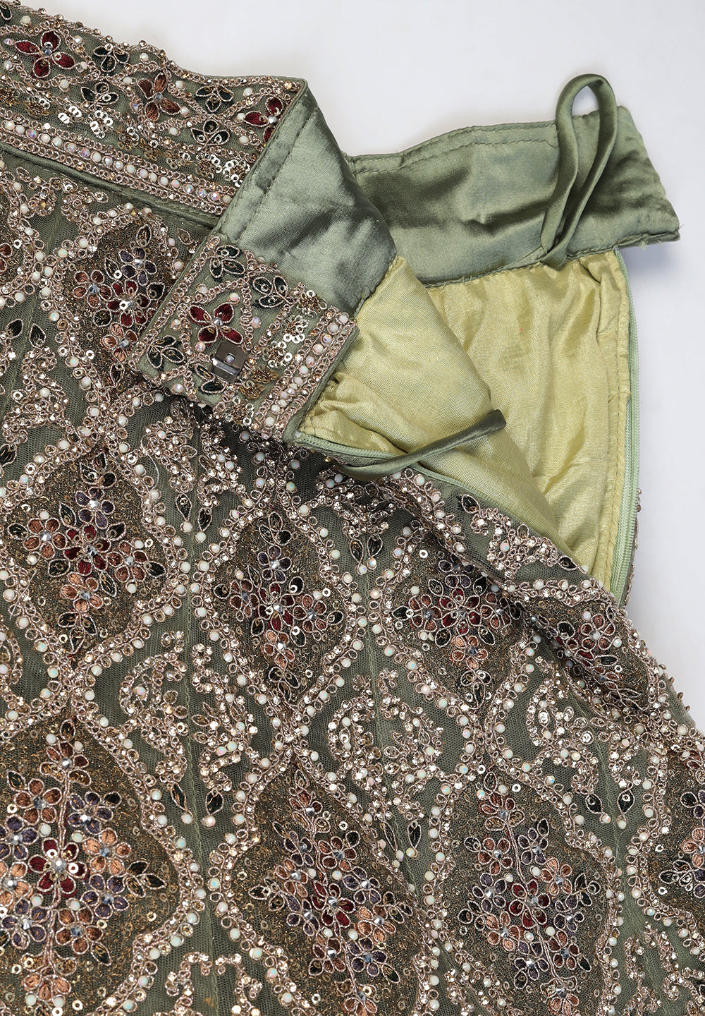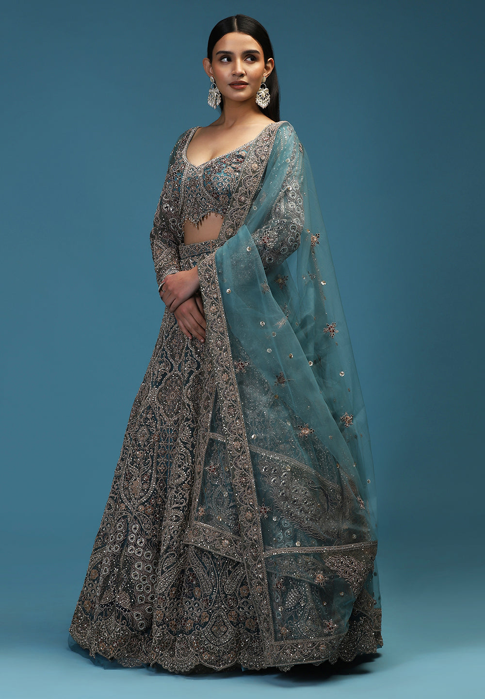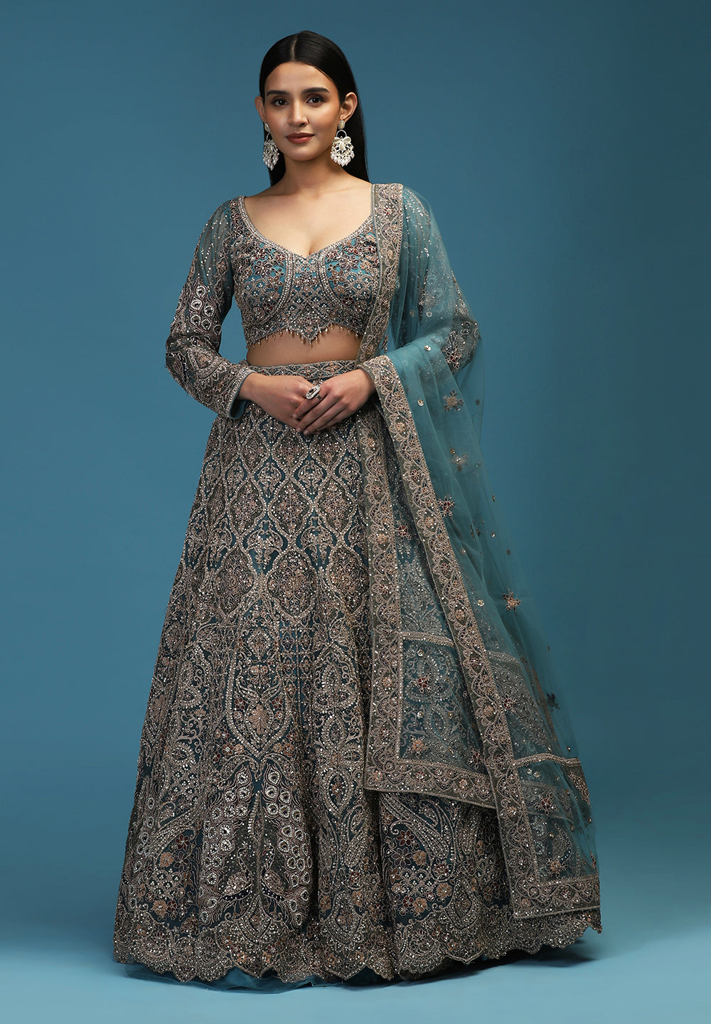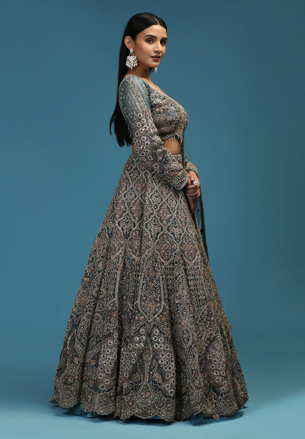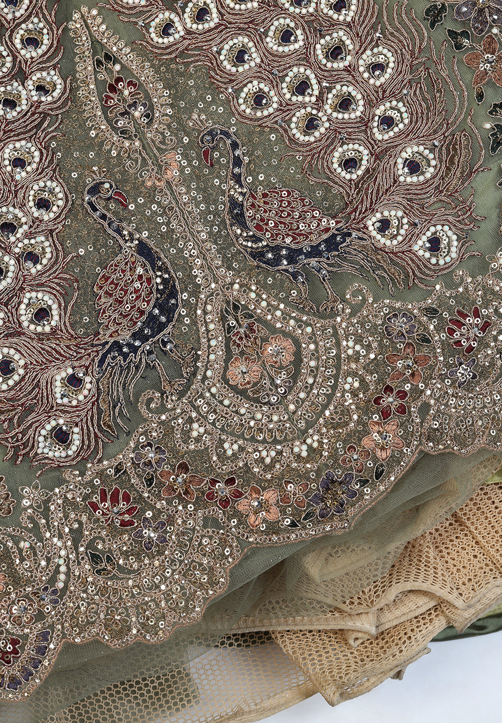 Every net lehenga in our collection is designed to tell a story — one of intricate artistry and timeless beauty. Explore statement-making bridal net lehengas in olive green, turquoise, and pistachio tones, adorned with mirror work, moti detailing, zari embroidery, and sequins.