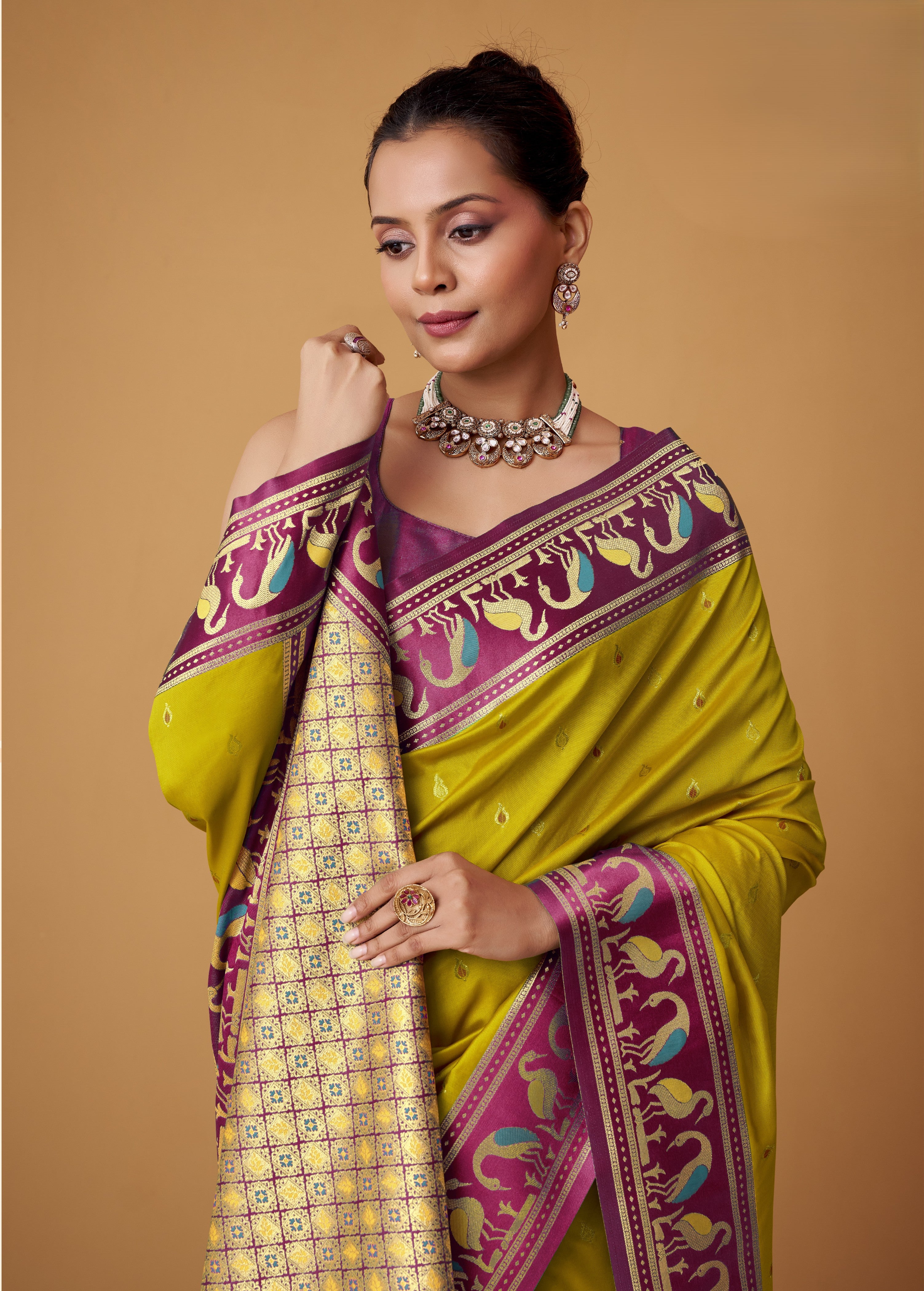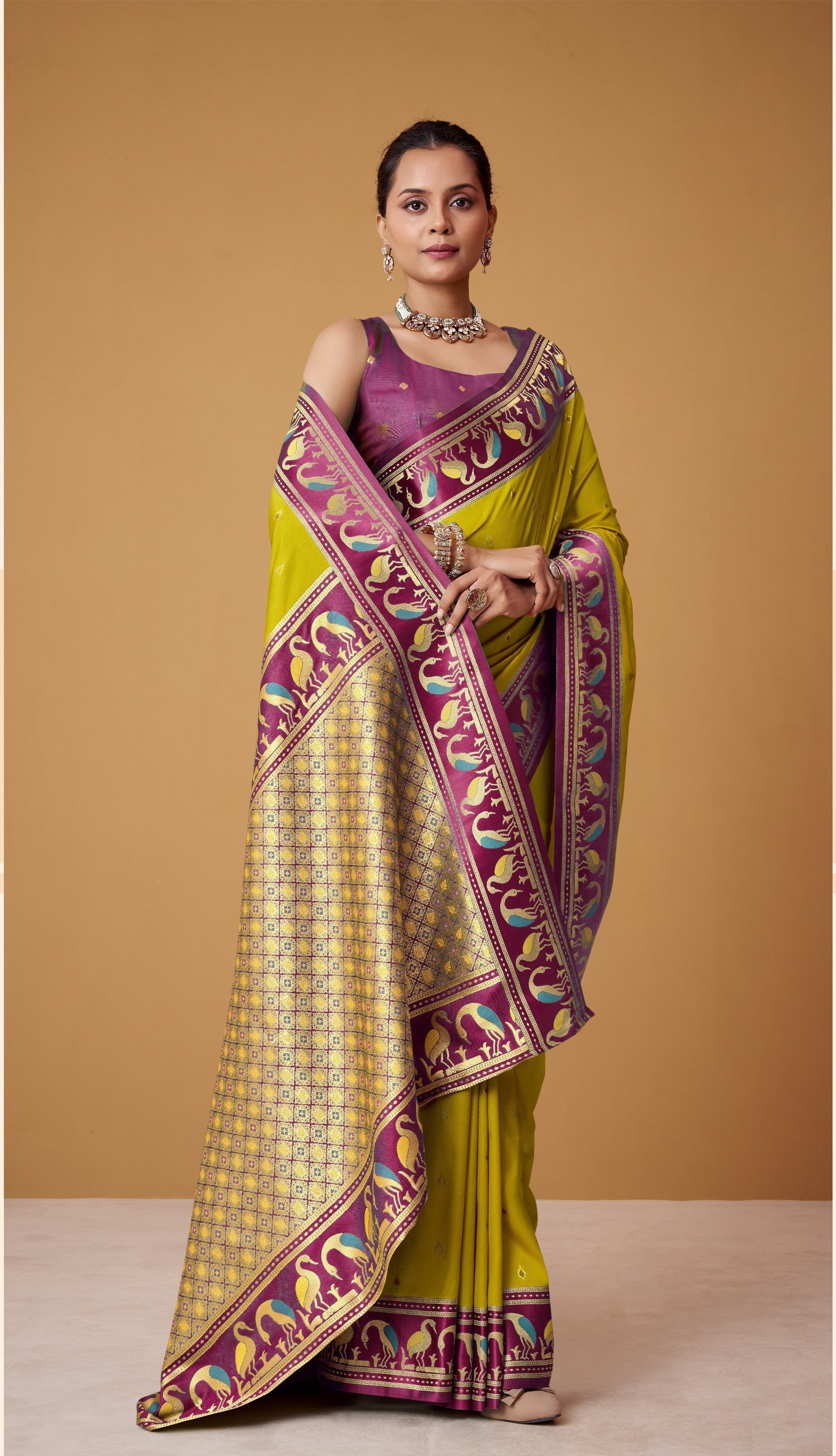 Celebrate in style with vibrant palettes and heritage motifs. A satin zari border saree in mustard yellow, rama green, or cream is perfect for Diwali, Eid, or Puja ceremonies, making it the ideal festive saree to reflect the joy of the occasion.