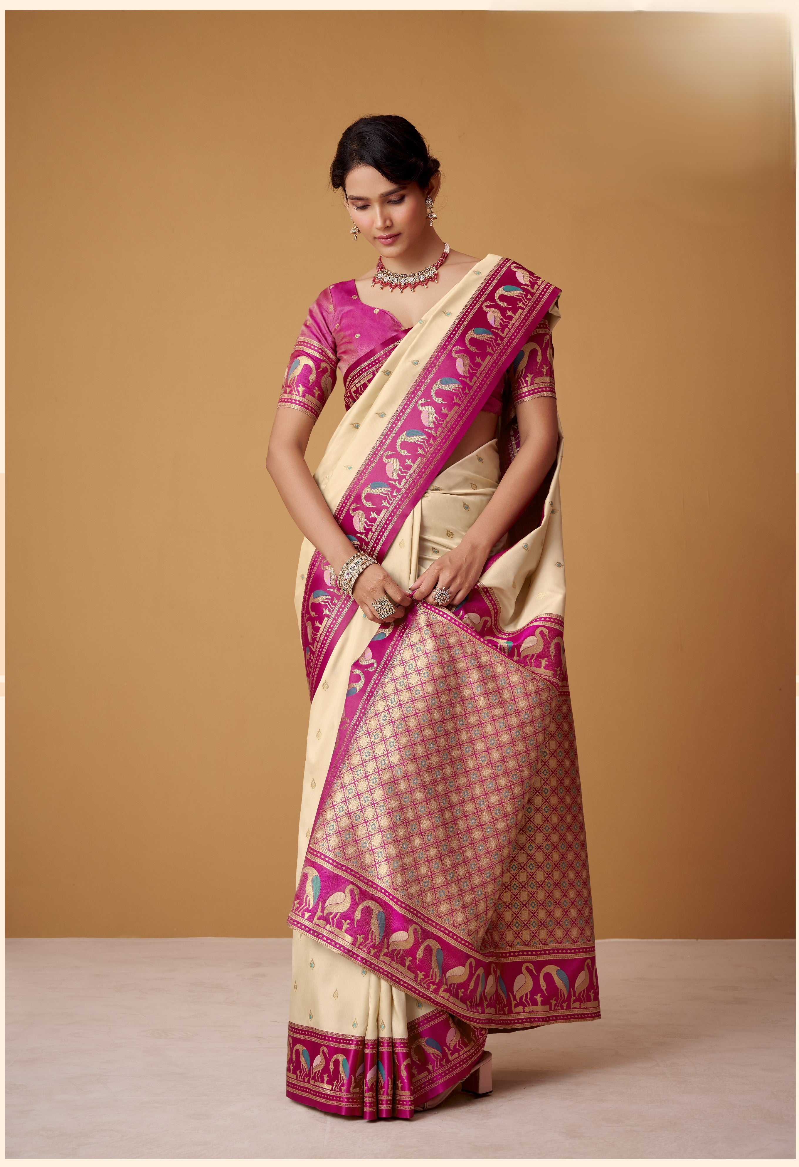 - Vibrant Festive Brights: Make a joyful statement with a dazzling rani satin saree, a warm and radiant mustard satin saree, or a pristine and elegant cream satin saree.
