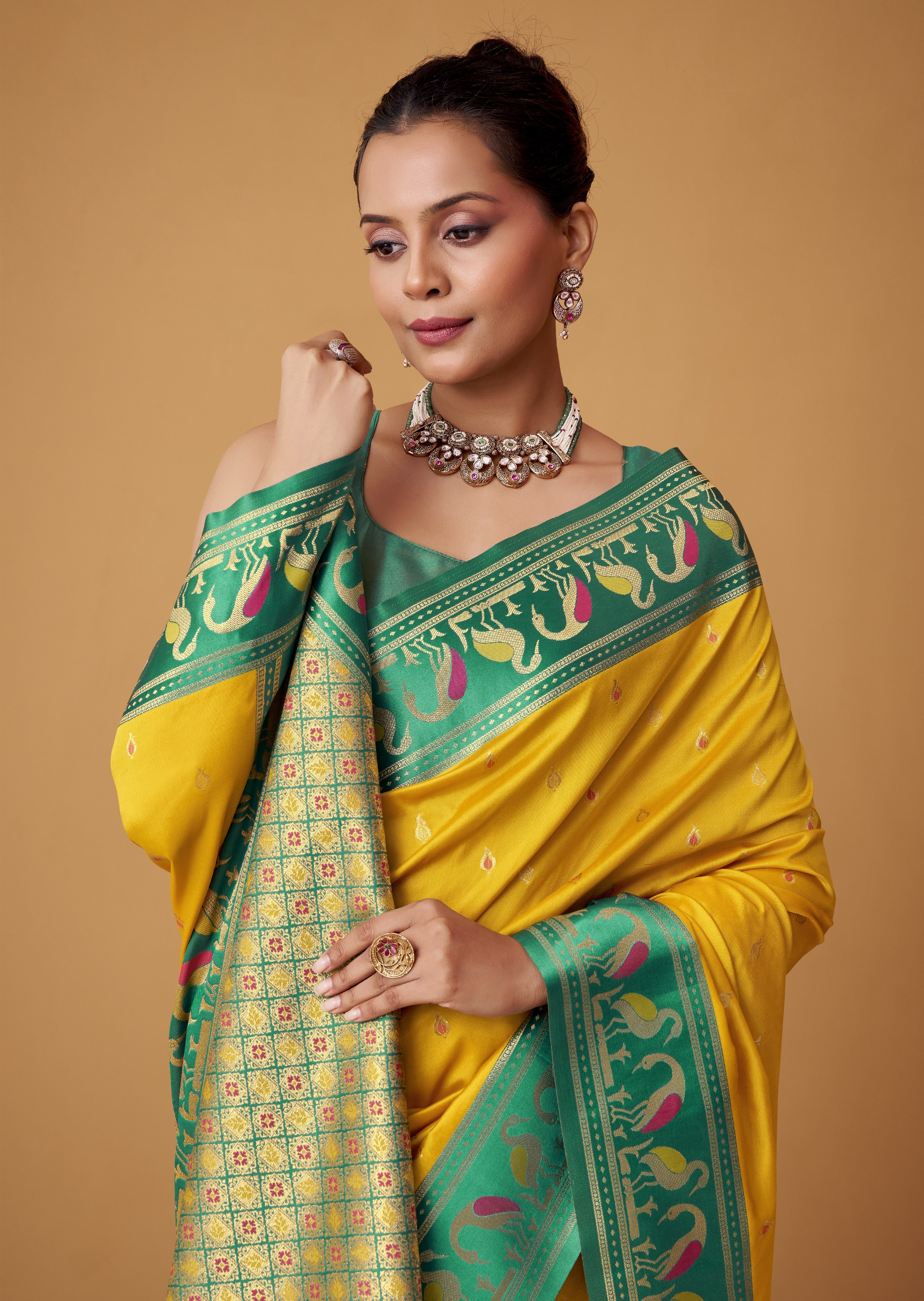 - Timeless Classics: The eternal elegance of a yellow satin saree, the regal grace of a green satin saree, the passionate allure of a red satin saree, the sophisticated mystery of a black satin saree, the serene depth of a blue satin saree, and the soft romance of a pink satin saree.