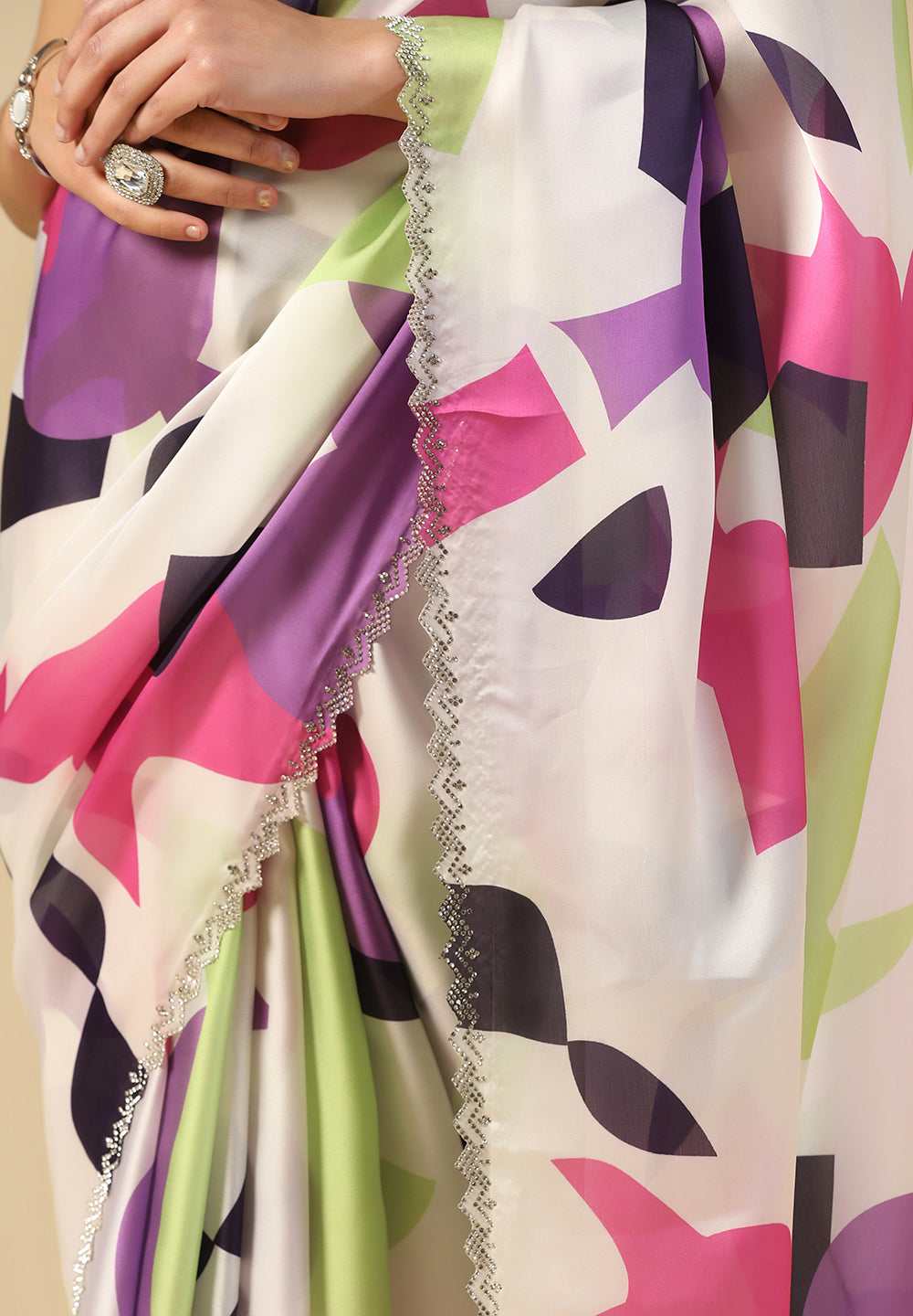 For moments that call for high-sparkle glamour. Choose a satin stone work saree for its faceted stones that catch the light with every turn. A satin zarkan work saree offers dazzling embellishment for evening events, while the premium, scintillating detail of a satin Swarovski work saree is perfect for red-carpet-ready looks.