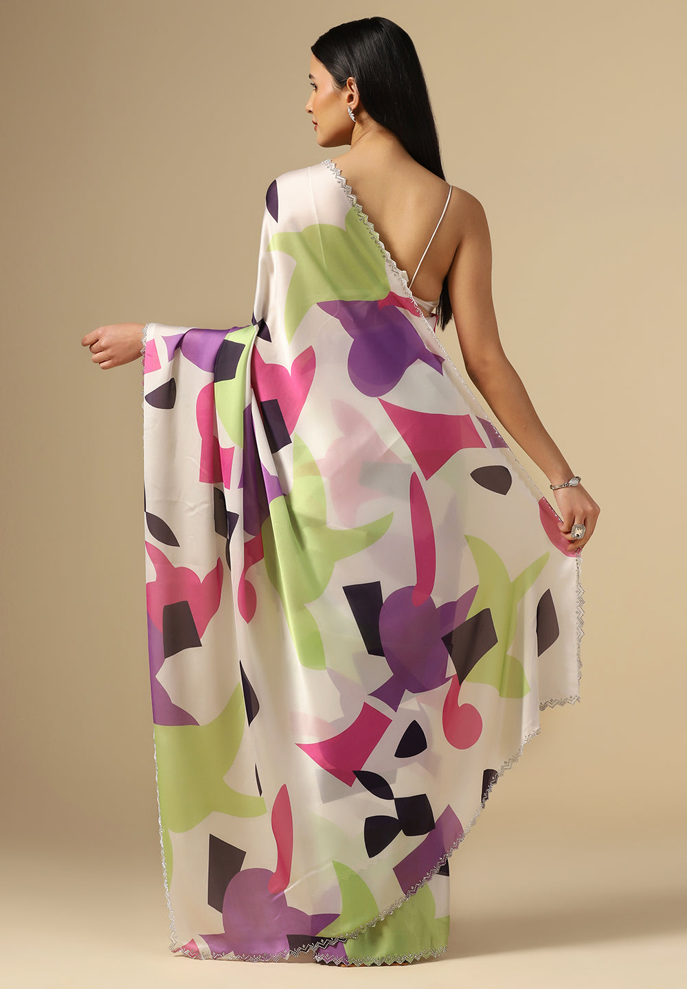 Minimalist yet profoundly impactful. The beauty of this saree lies in the unadorned, fluid expanse of the satin, complemented by a sleek, contrasting border. It’s a versatile canvas for statement jewellery and avant-garde blouse designs.