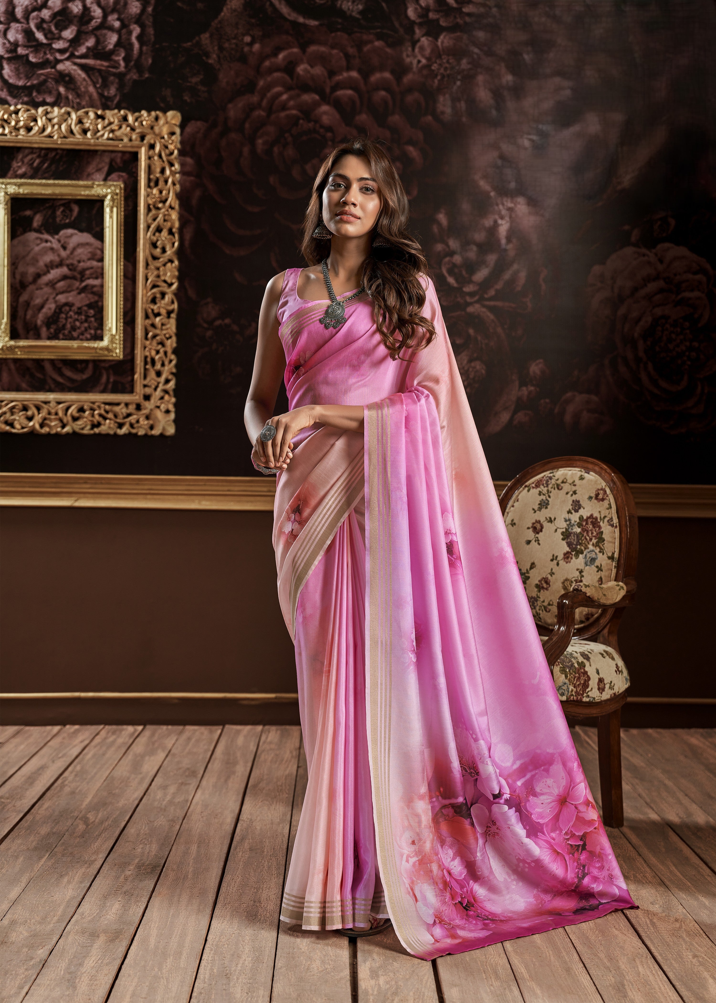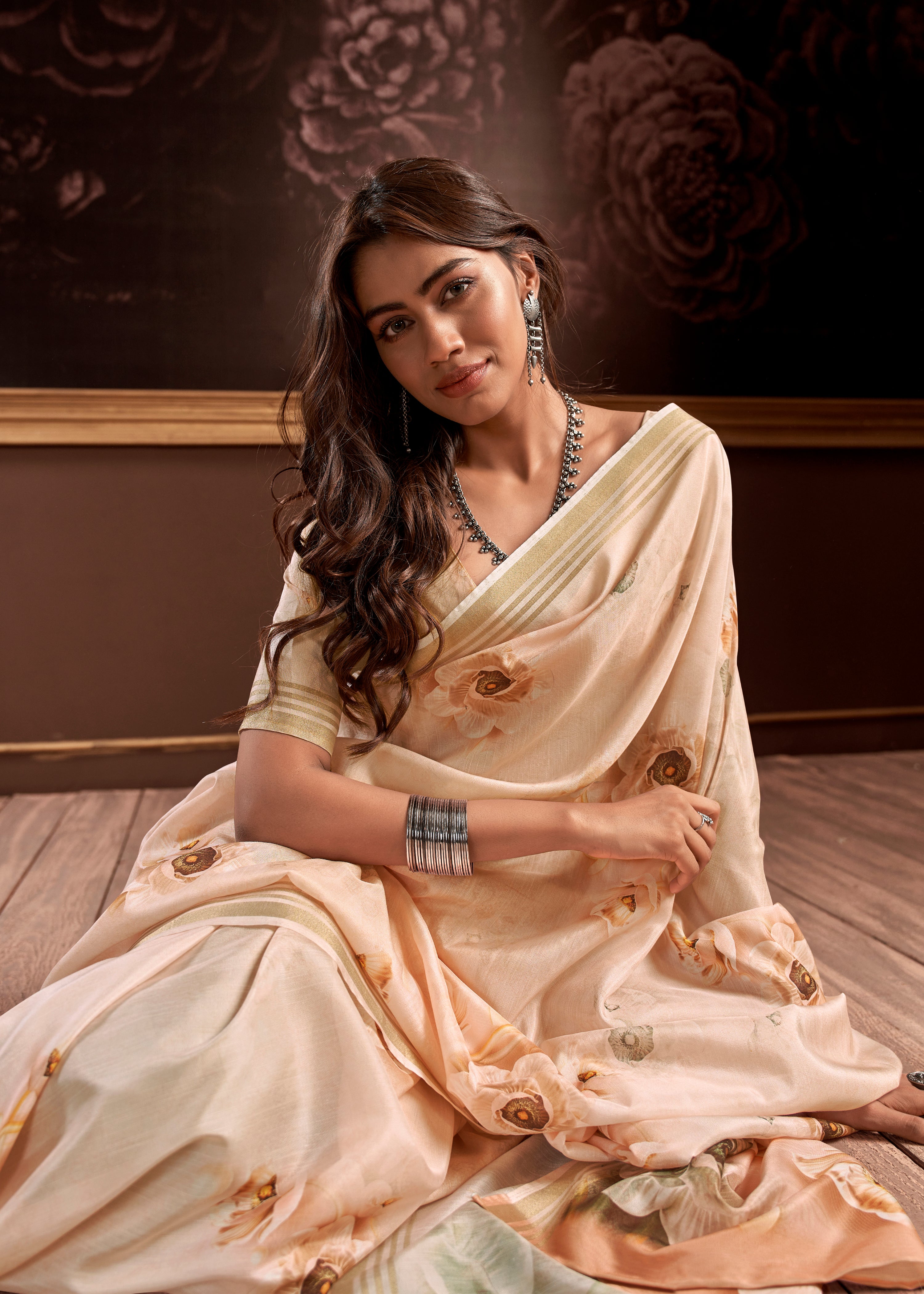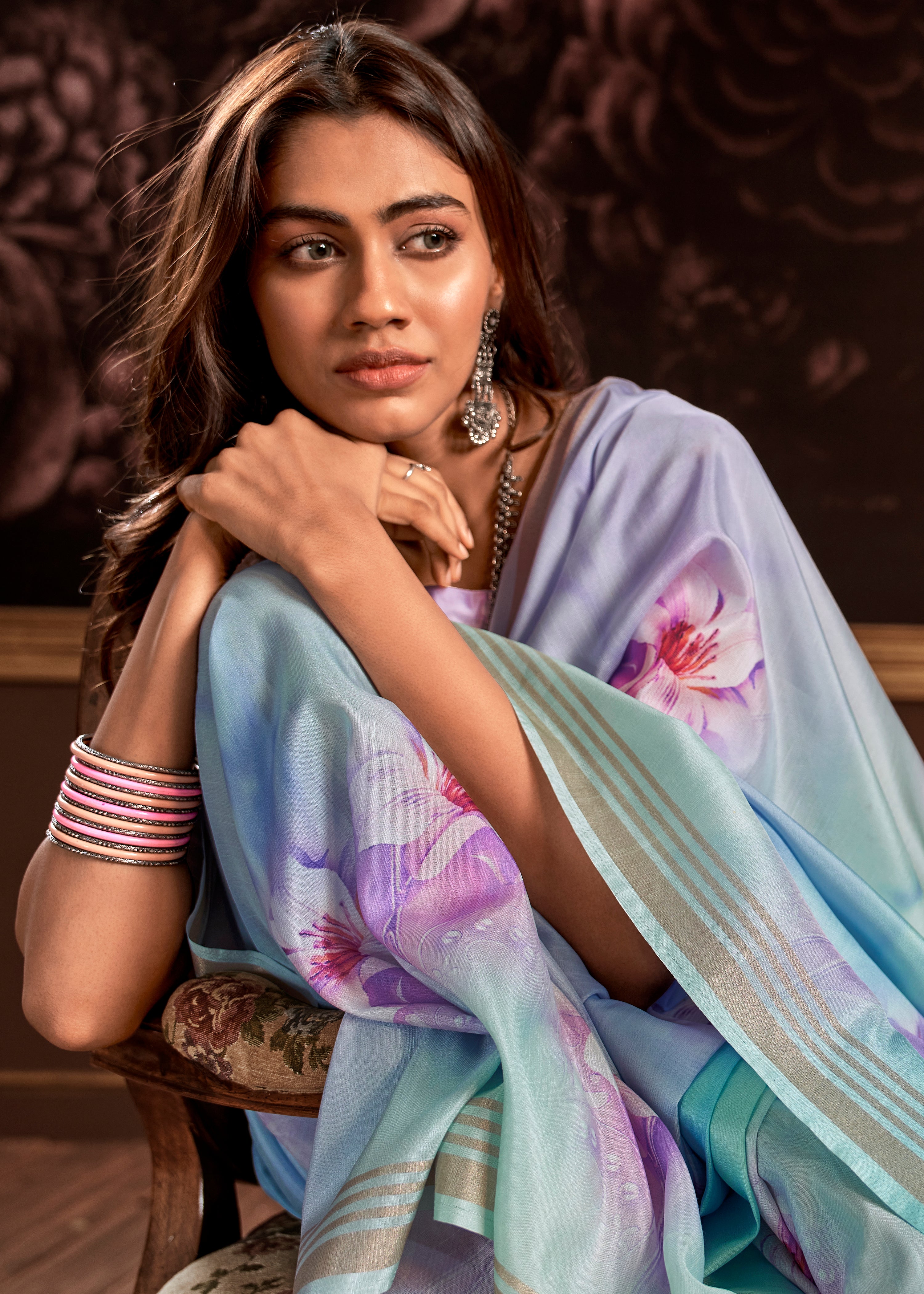 - Indo-Western Fusion: Style a pastel satin silk saree with rose-gold earrings, metallic clutch, soft curls.