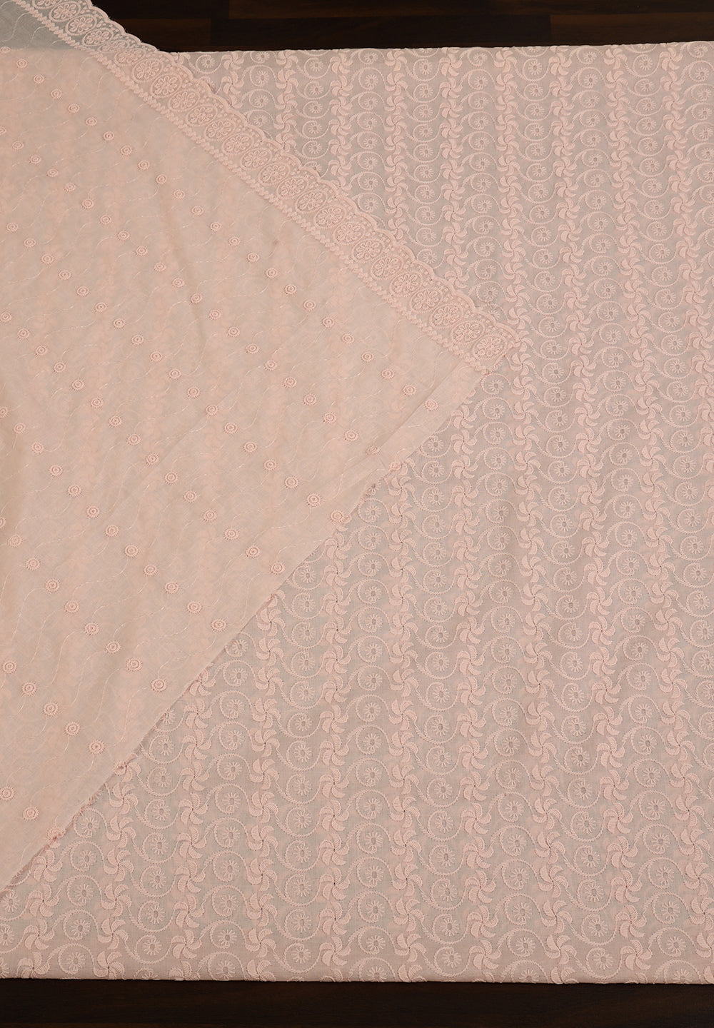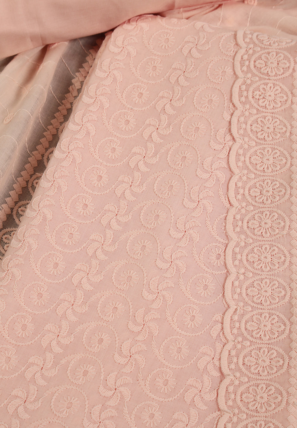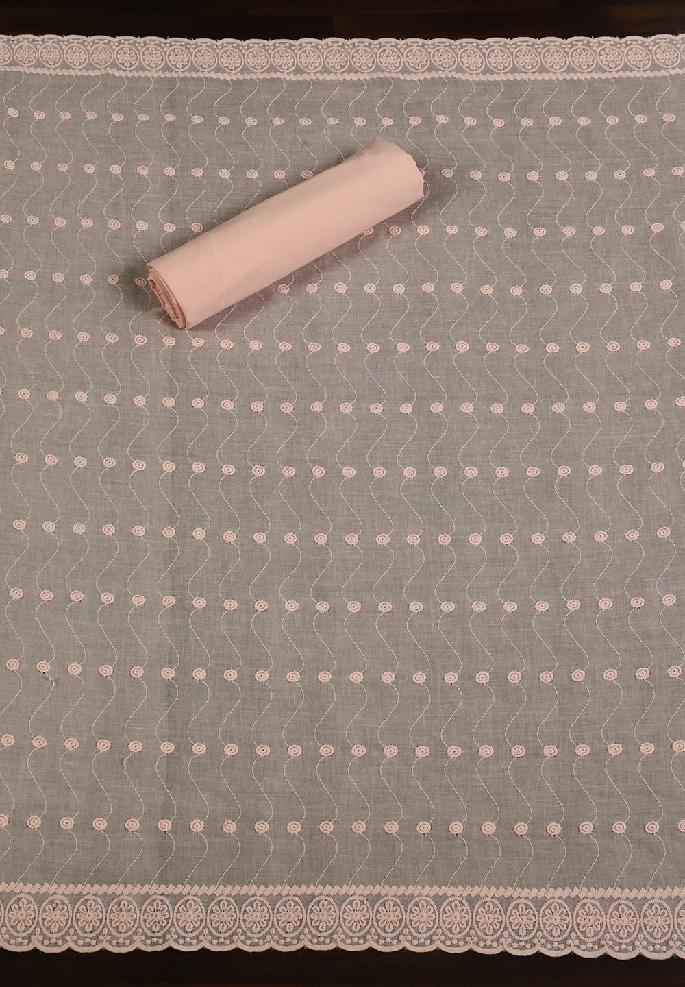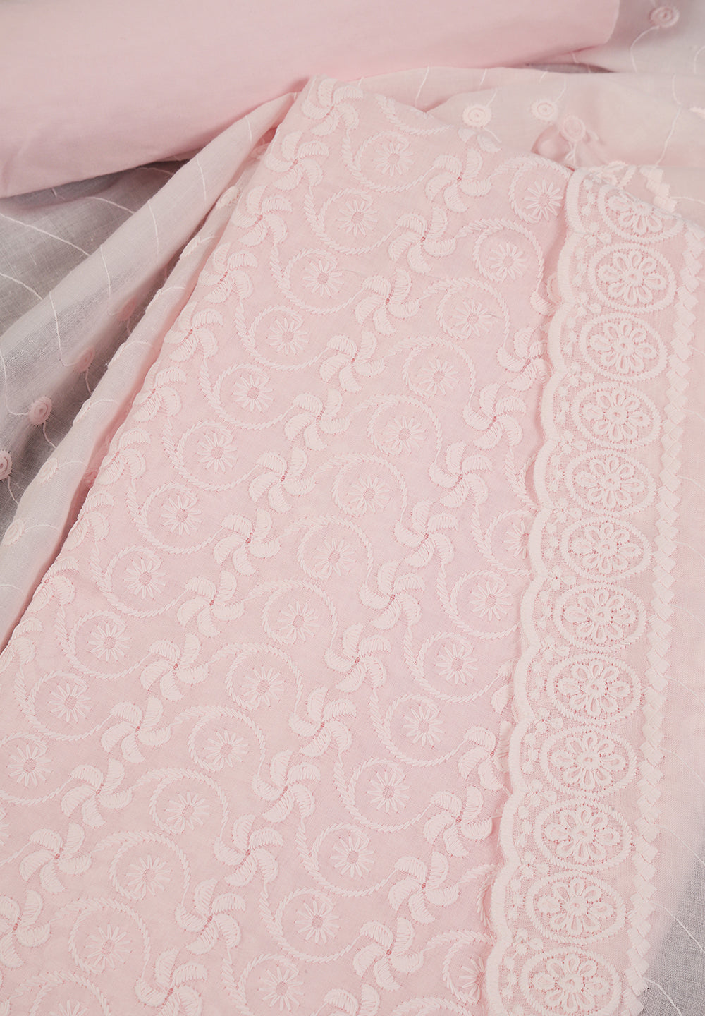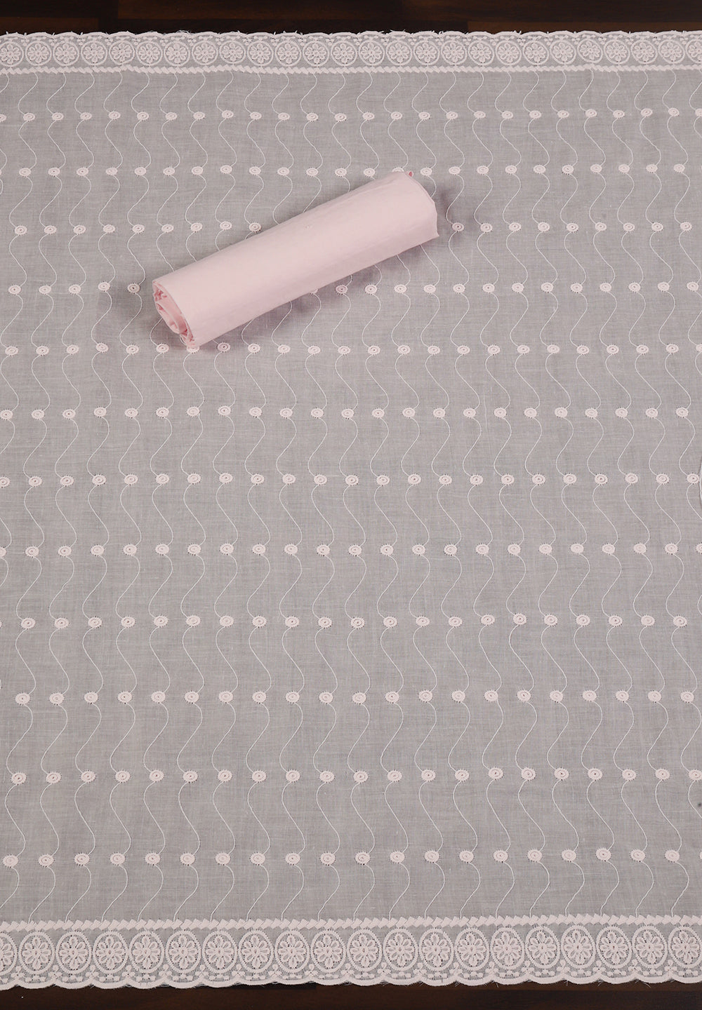Pastel Pink Floral Linen-Cotton Suit – Intricate White Thread Work & Silver Zari Border Dupatta₹ 2,385