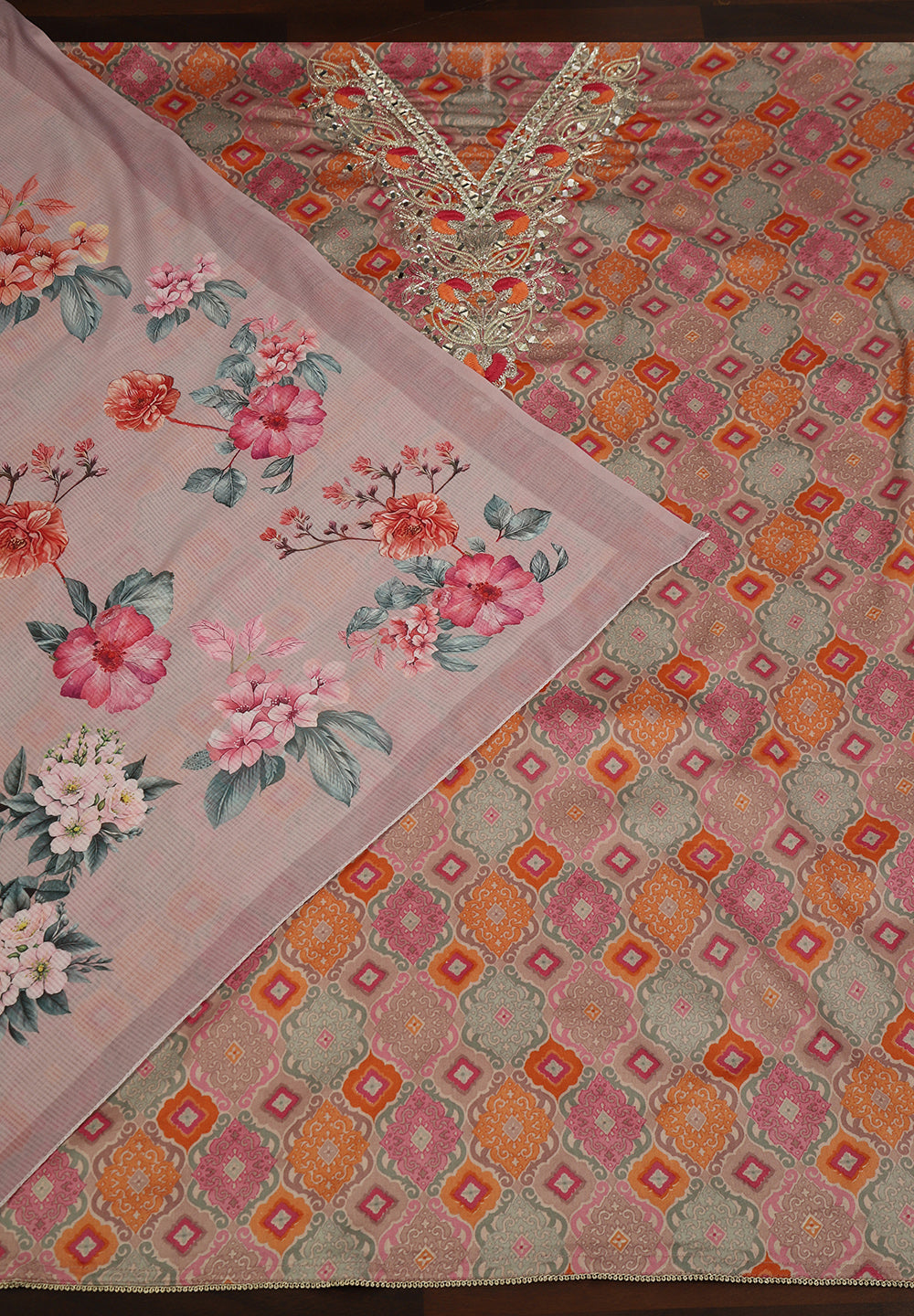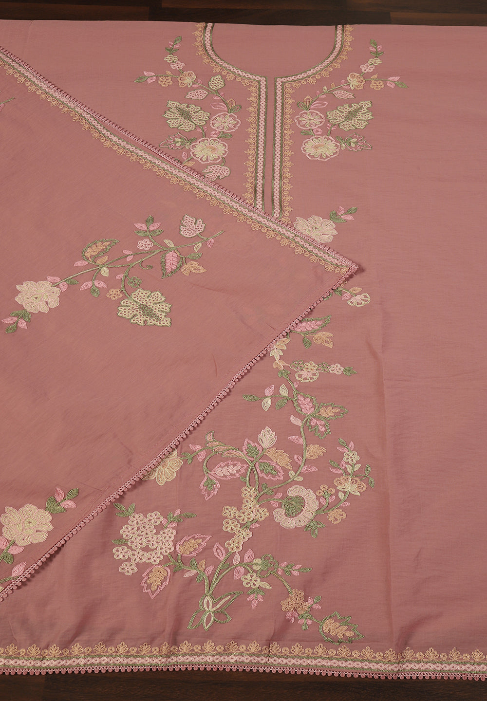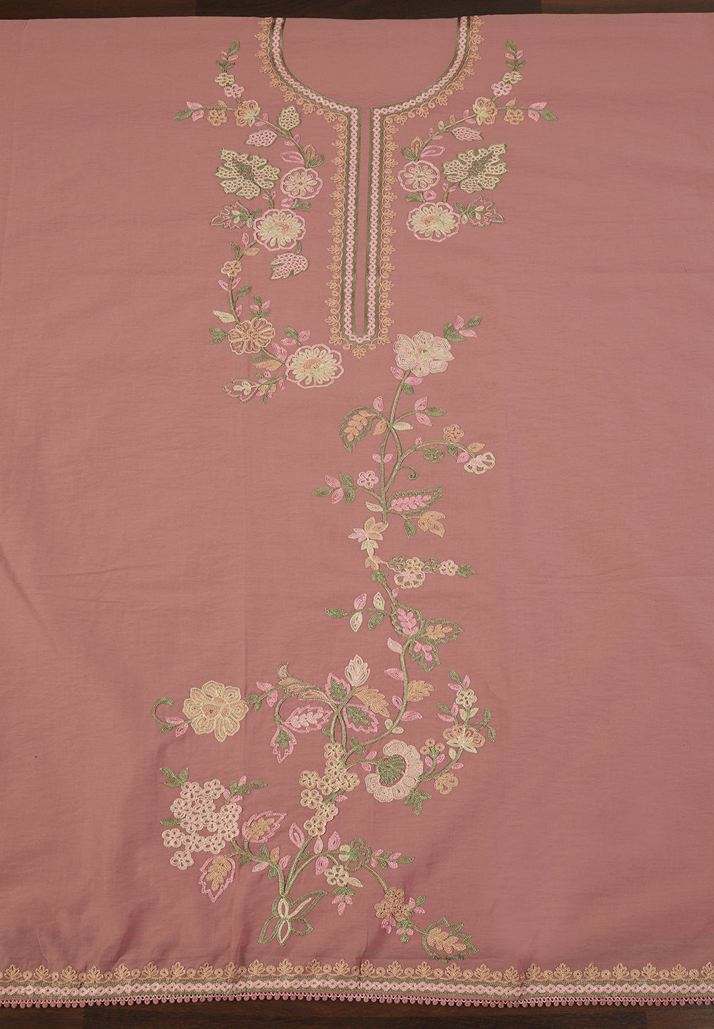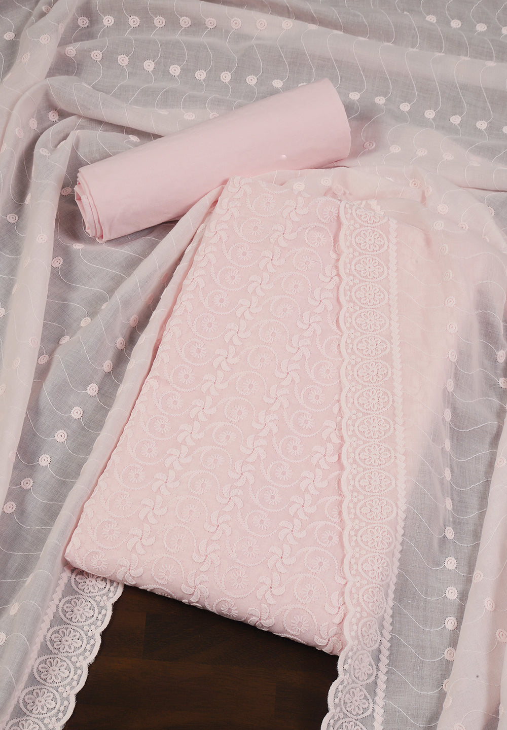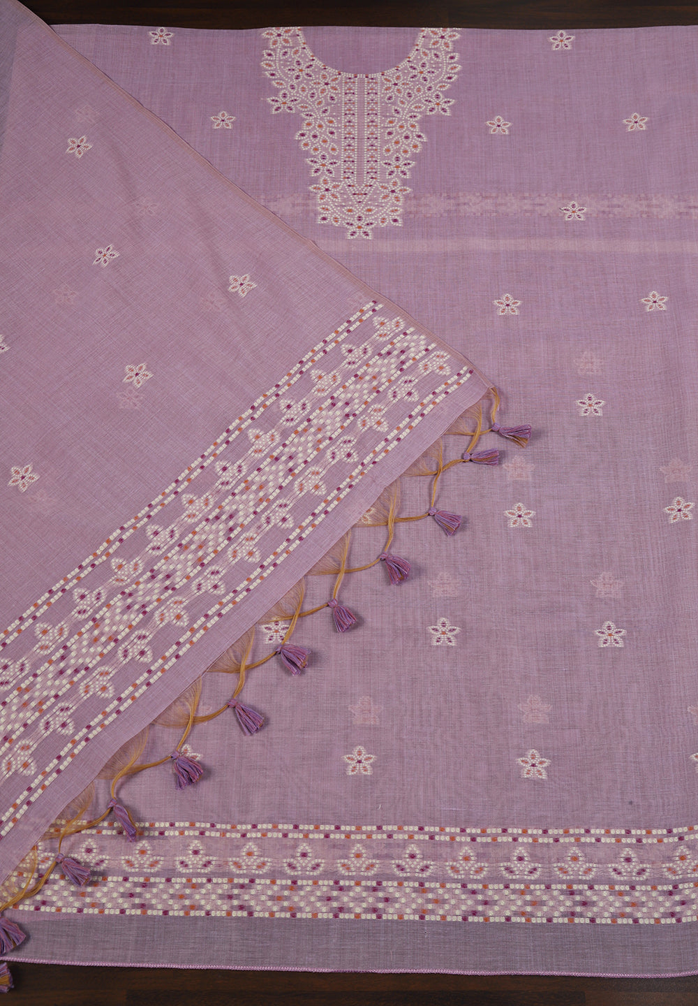 Pastel Pink Floral Linen-Cotton Suit – Intricate White Thread Work & Silver Zari Border Dupatta₹ 2,385