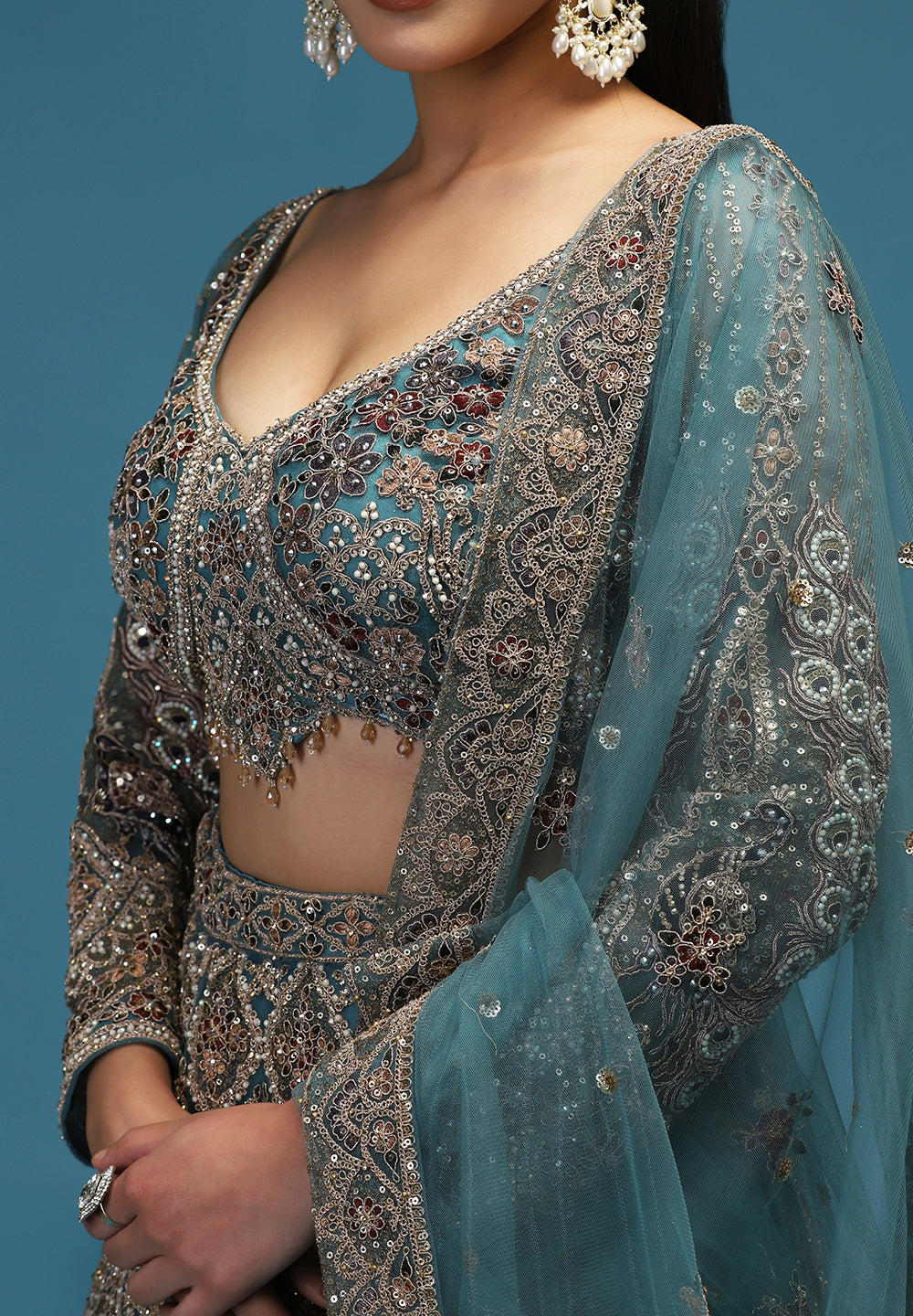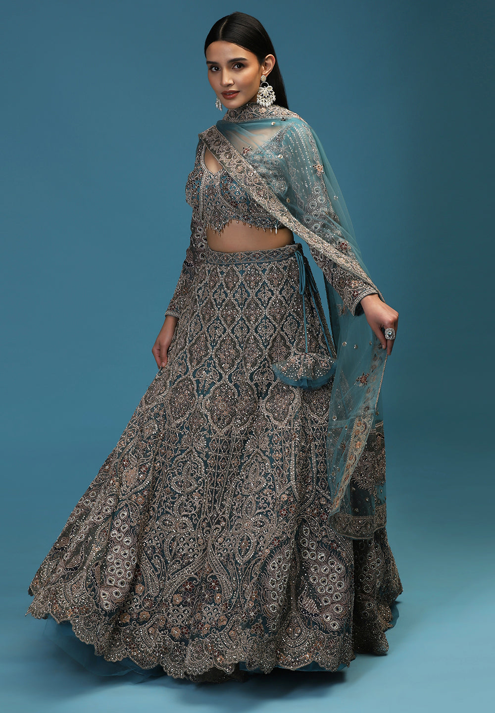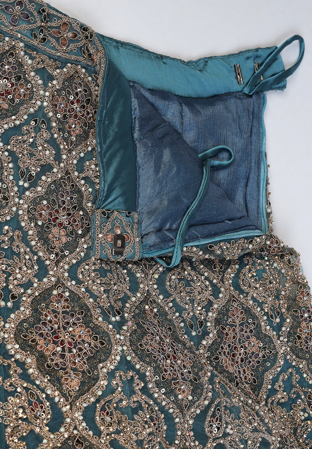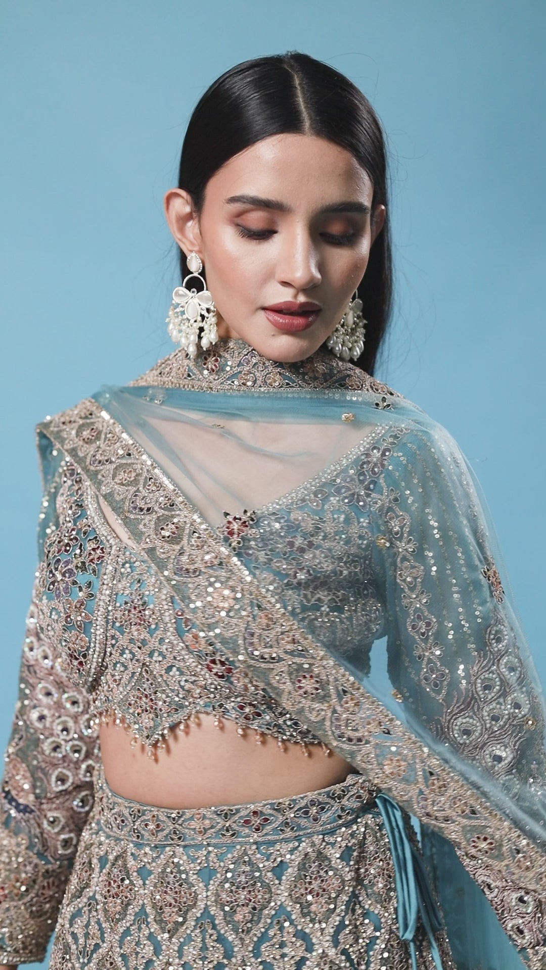 - The Lehenga is embellished with Zarkan, Dori And Pearl Work