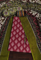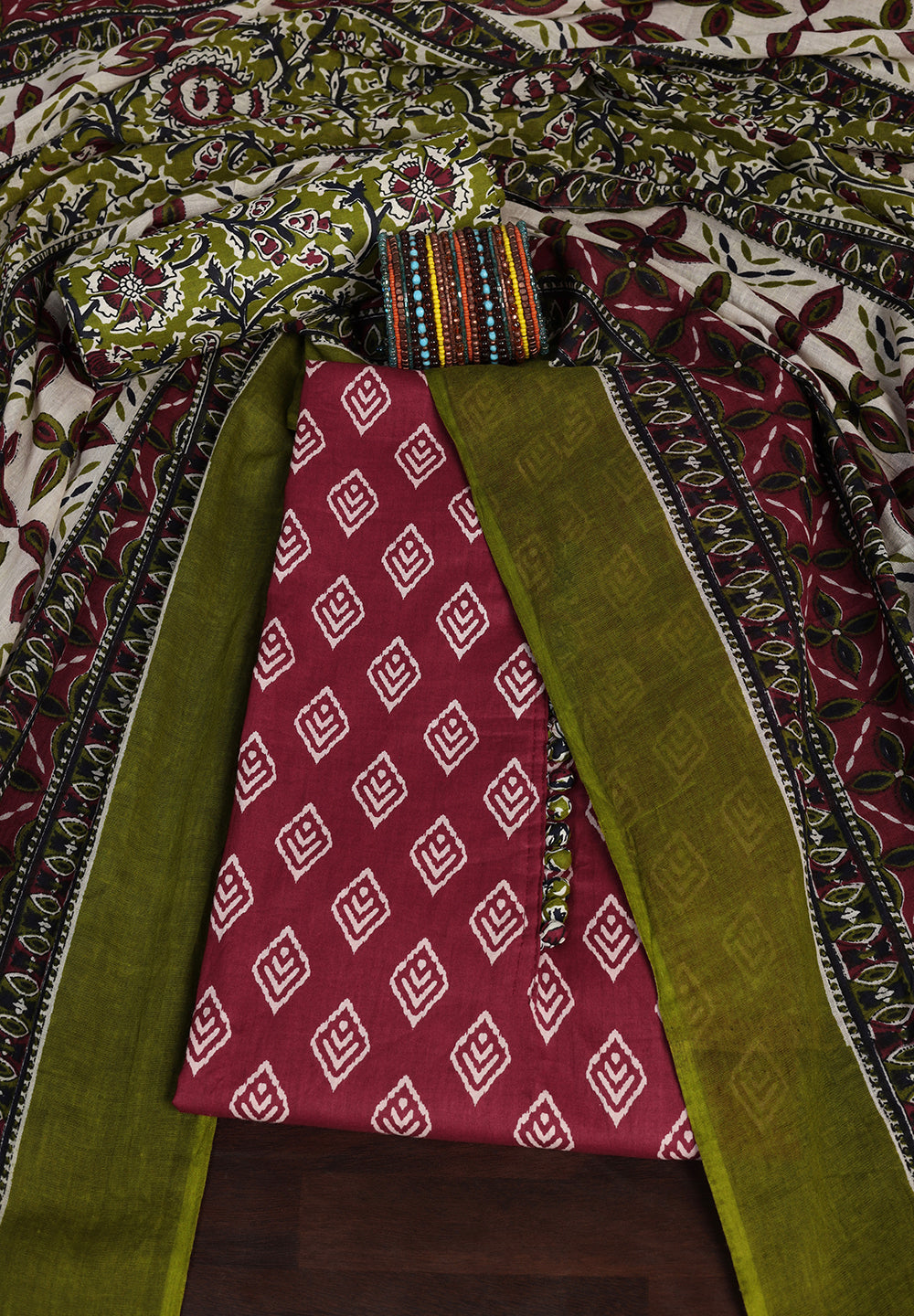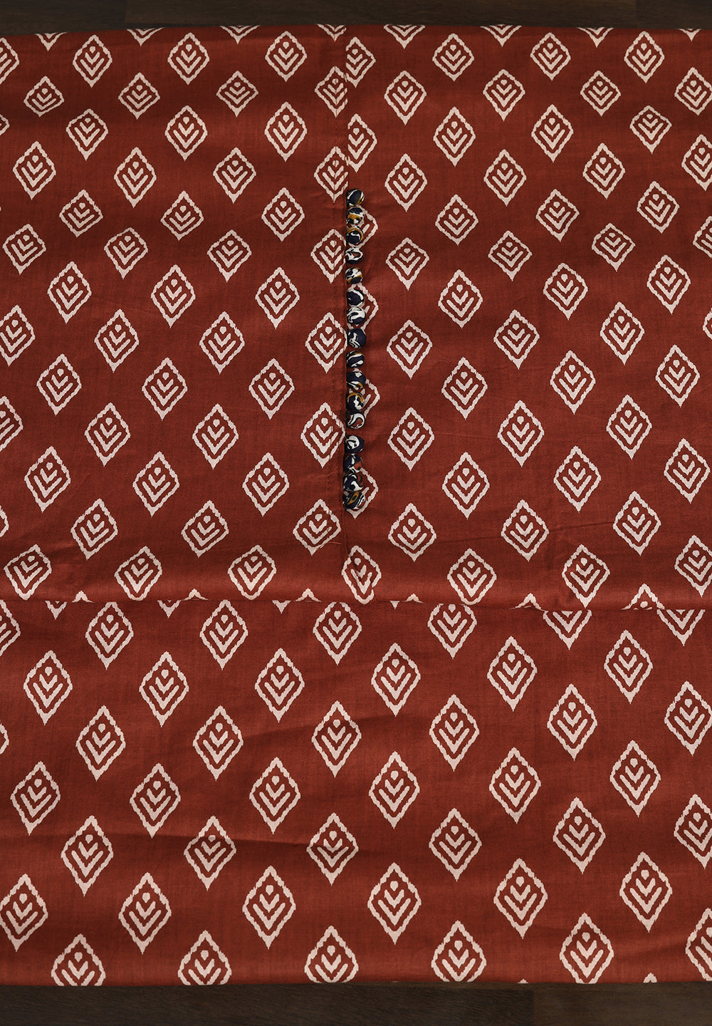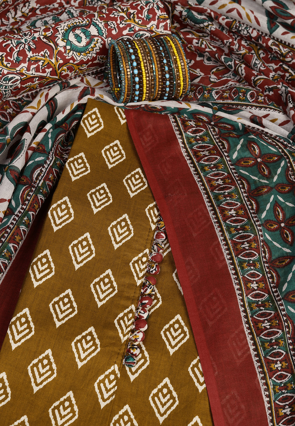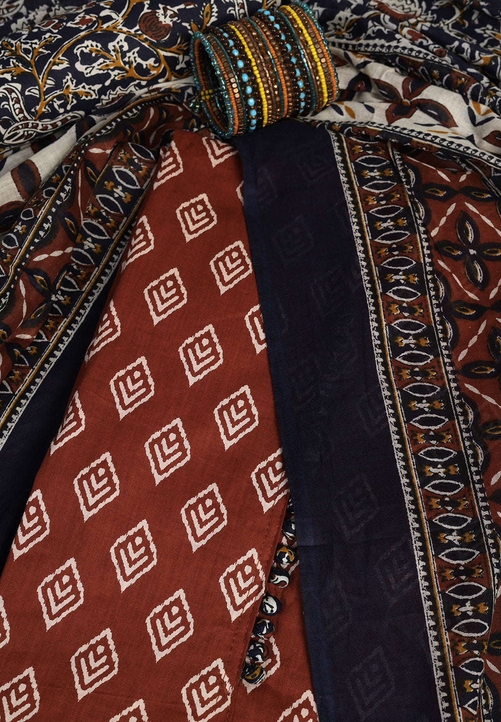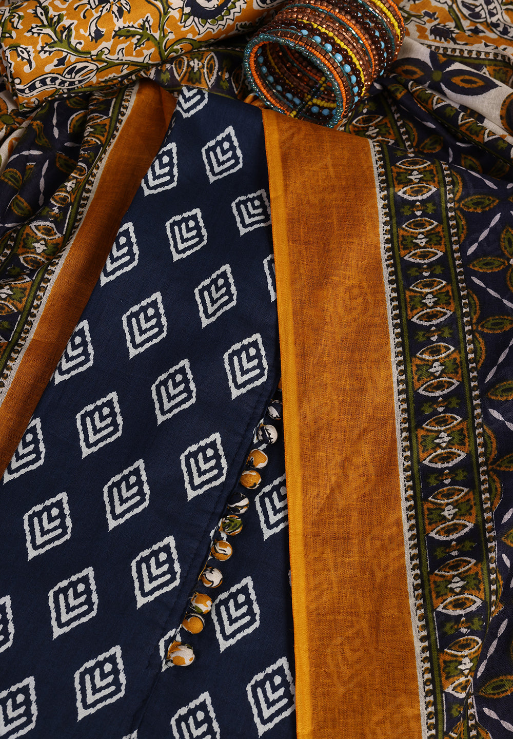 Elevate your style with our Printed Cotton Suit Set. The unstitched fabric is adorned with exquisite Neck Patch. Paired with an unstitched Printed Cotton bottom and a Printed Cotton Dupatta, the ensemble is designed to bring together the beauty of craftsmanship and elegance. Available in Maroon, Blue, Mustard and Rust Color.