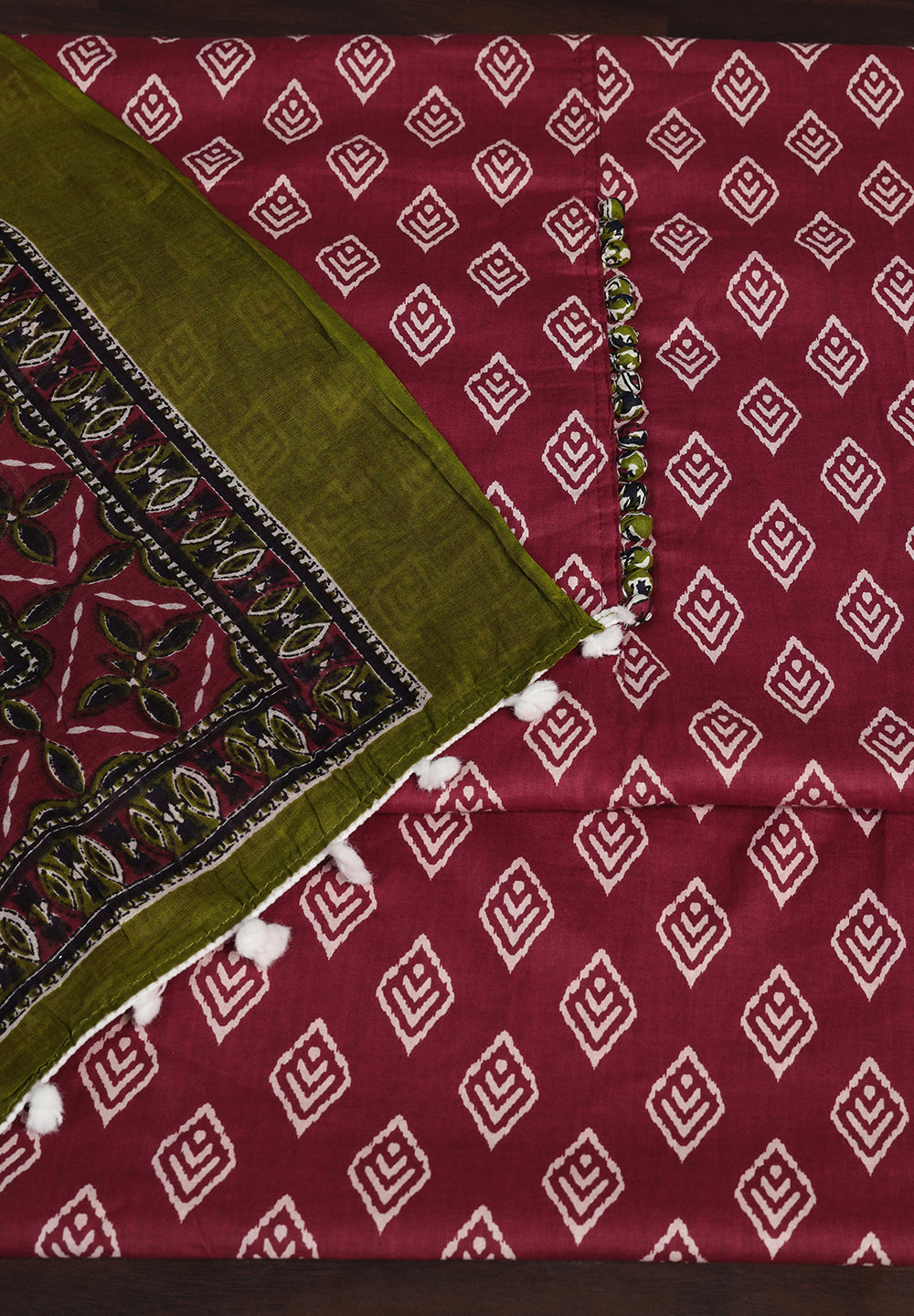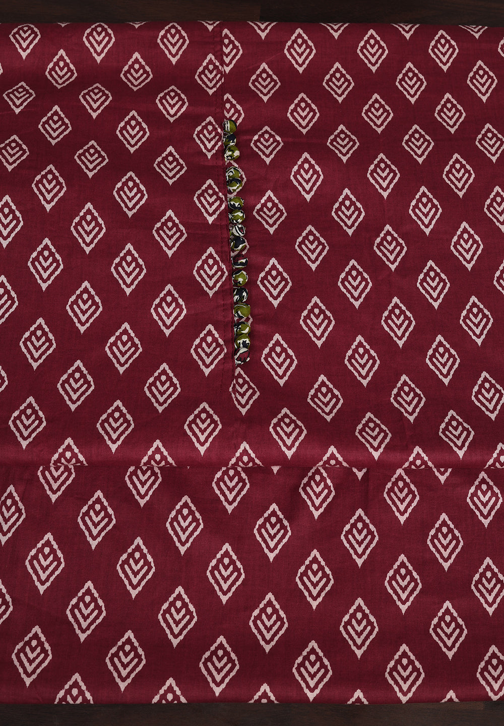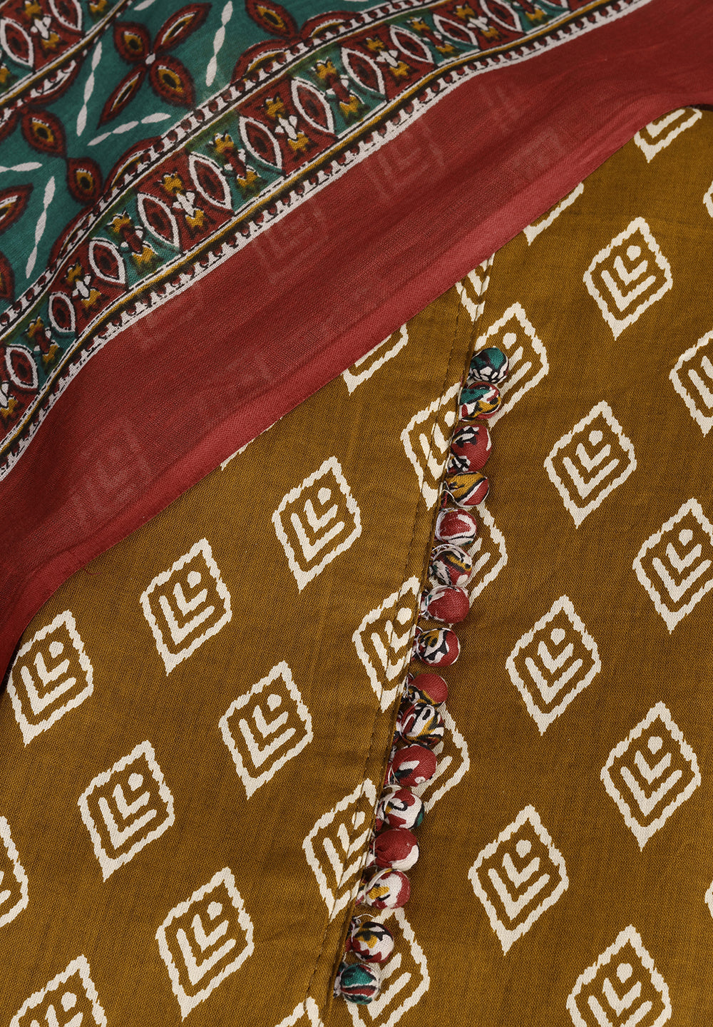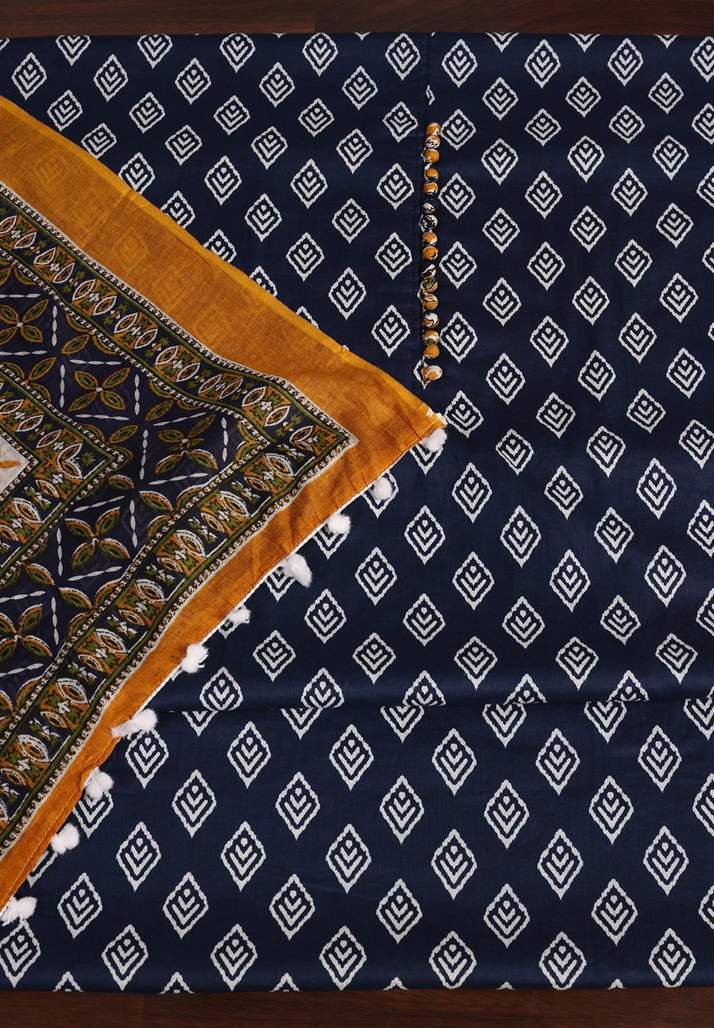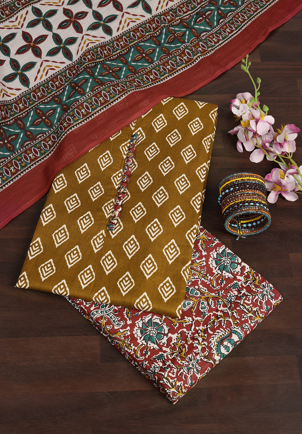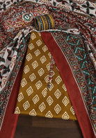 Elevate your style with our Printed Cotton Suit Set. The unstitched fabric is adorned with exquisite Neck Patch. Paired with an unstitched Printed Cotton bottom and a Printed Cotton Dupatta, the ensemble is designed to bring together the beauty of craftsmanship and elegance. Available in Maroon, Blue, Mustard and Rust Color.