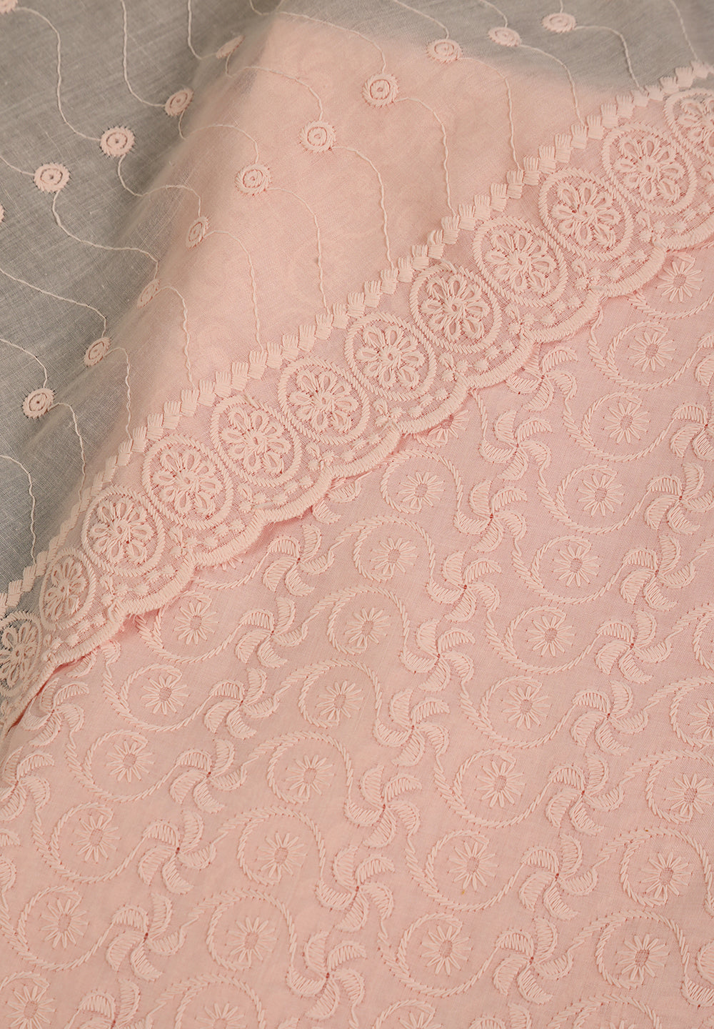 - Intricate hand-done Lucknowi Chikankari floral and wave patterns. Common stitches used in this style include Bakhiya (shadow work), Phanda (knot stitch), and Pechni.