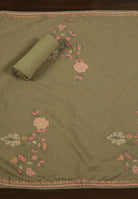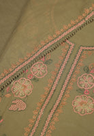 The centerpiece of this set is the intricate Resham thread work. The embroidery features a soft palette of peach, sage green, and cream, creating a delicate floral vine pattern that flows across the shirt. Paired with an unstitched Cotton bottom and a Cotton Dupatta.