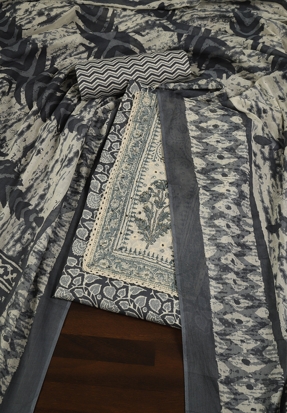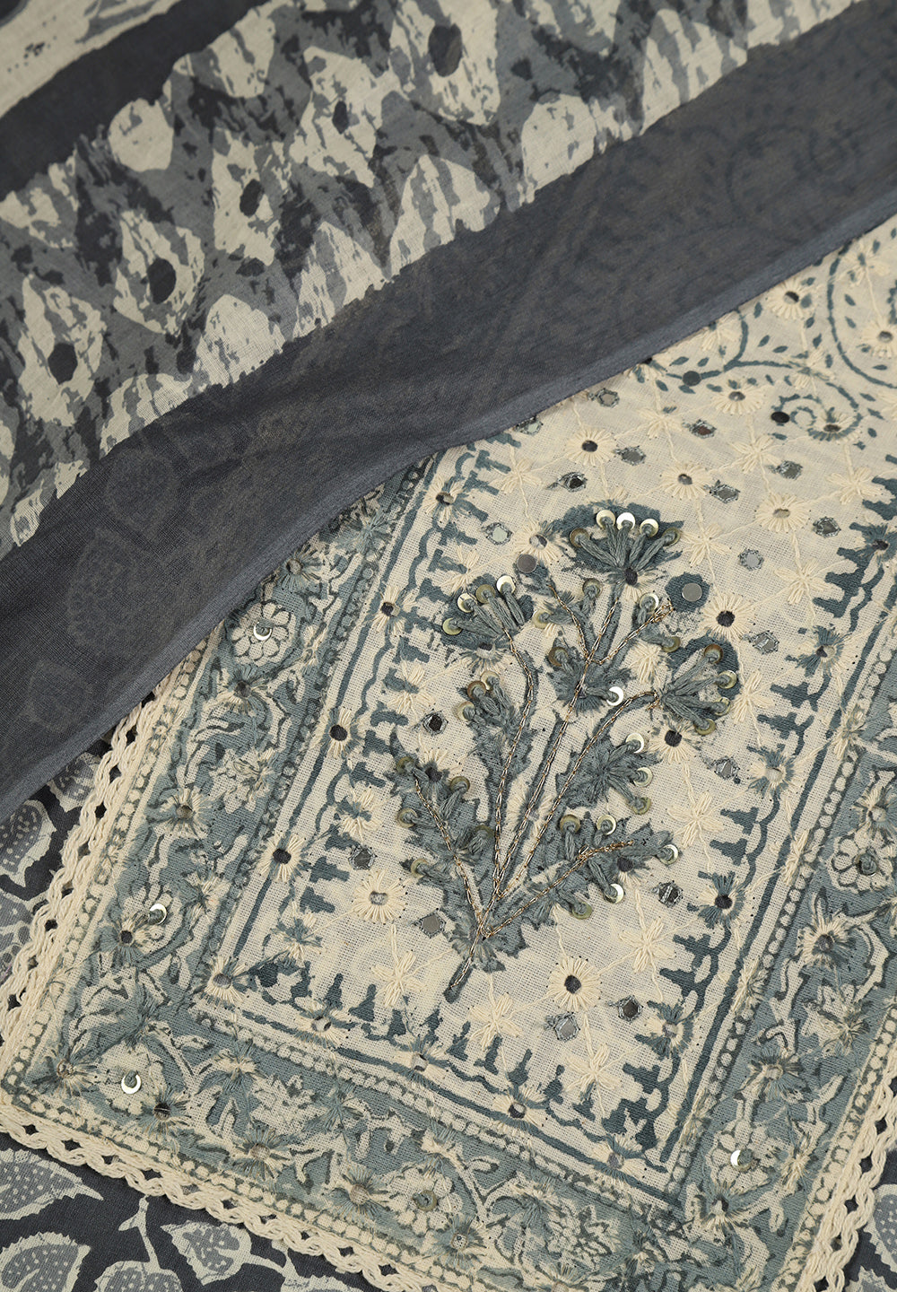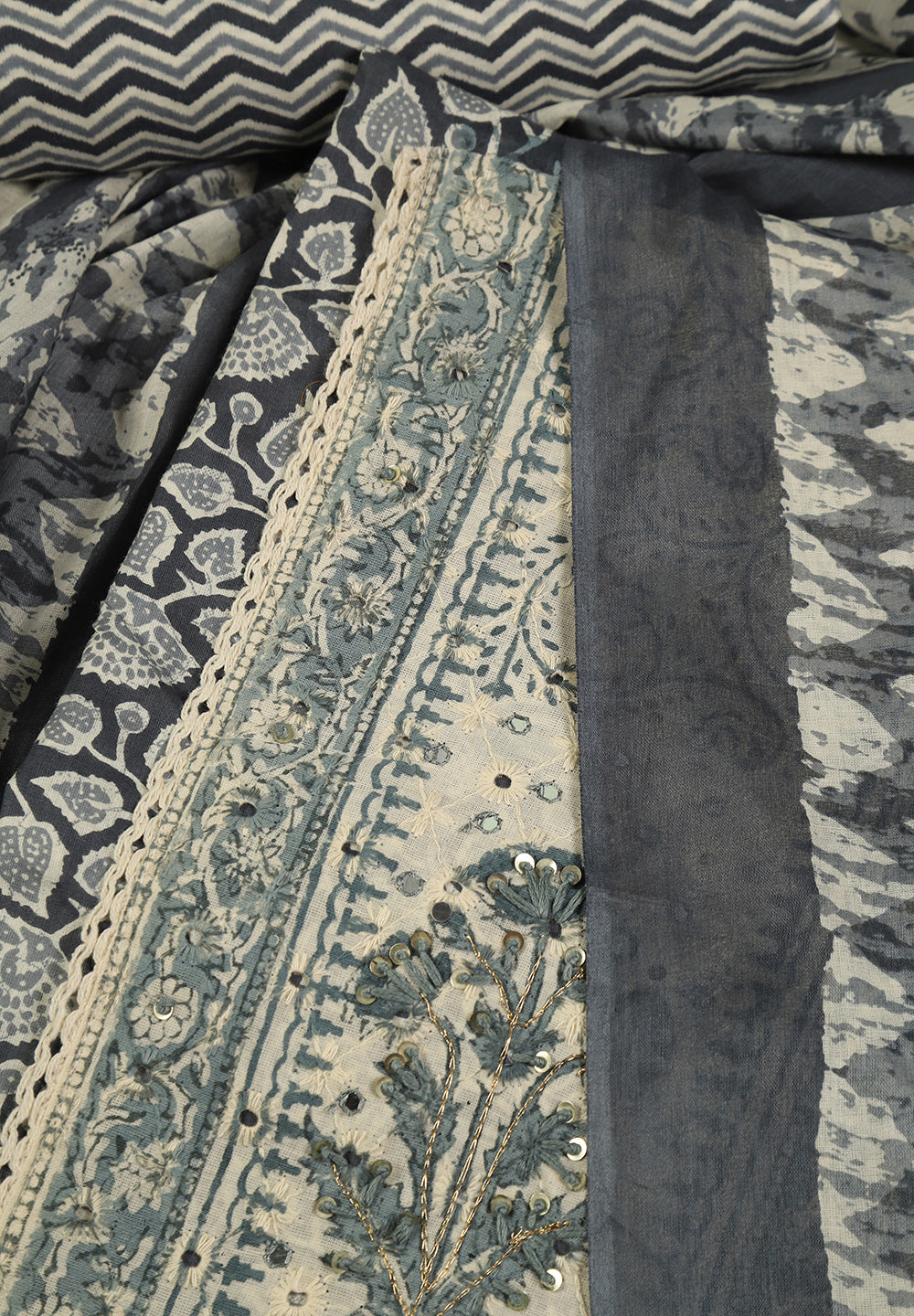 Elevate your style with our Cotton Suit Set. The unstitched fabric is adorned with exquisite Thread Neck patch, Paired with an unstitched Printed Cotton bottom and a Printed Cotton Dupatta, the ensemble is designed to bring together the beauty of craftsmanship and elegance.