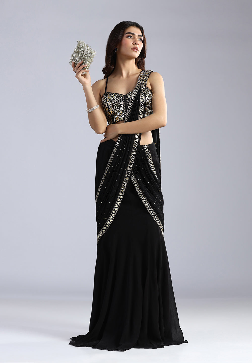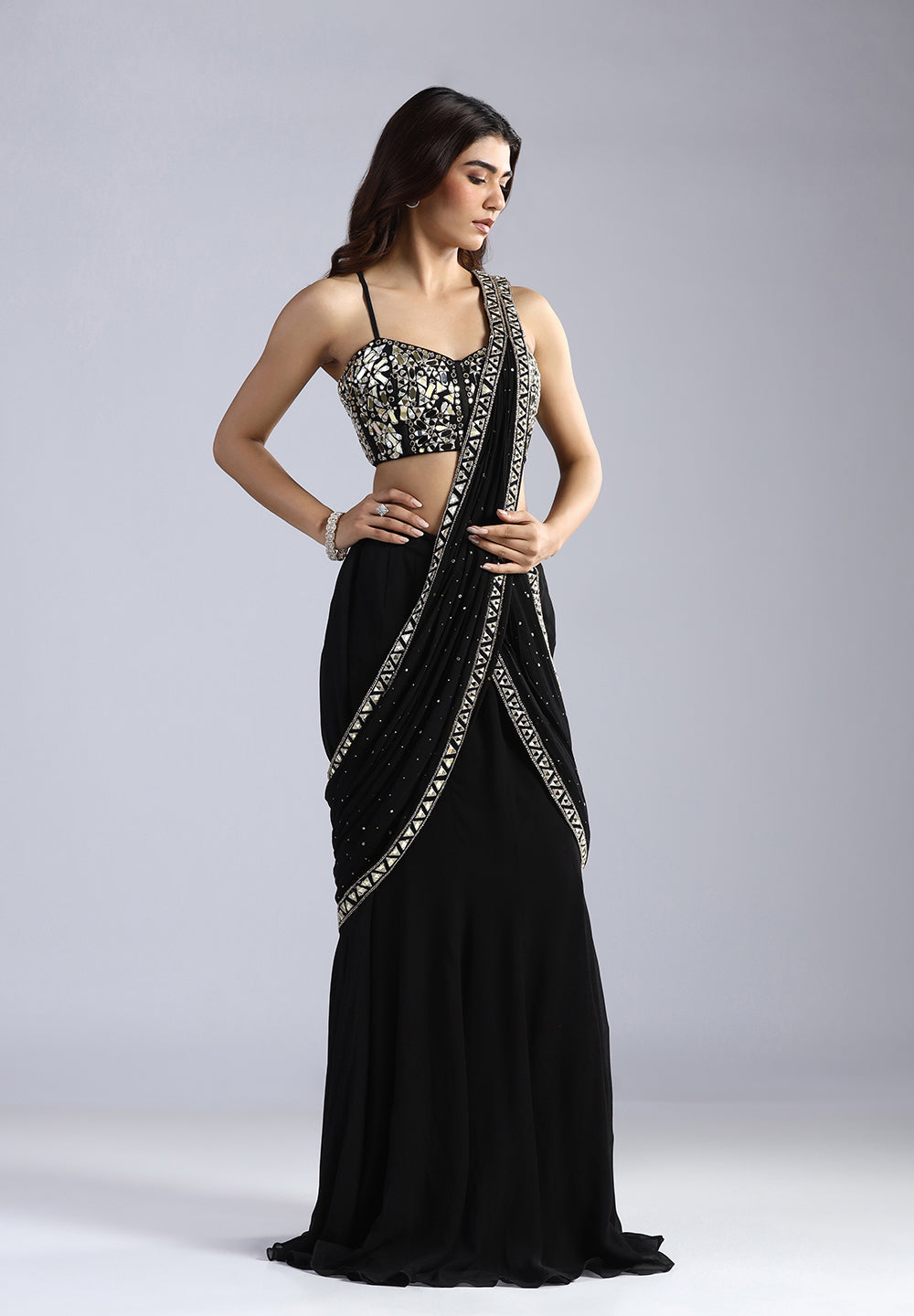 Skip the draping and step straight into luxury. Our Electric Petal Ready-to-Wear Saree is designed for the woman who loves the grace of a saree but craves the ease of a gown.