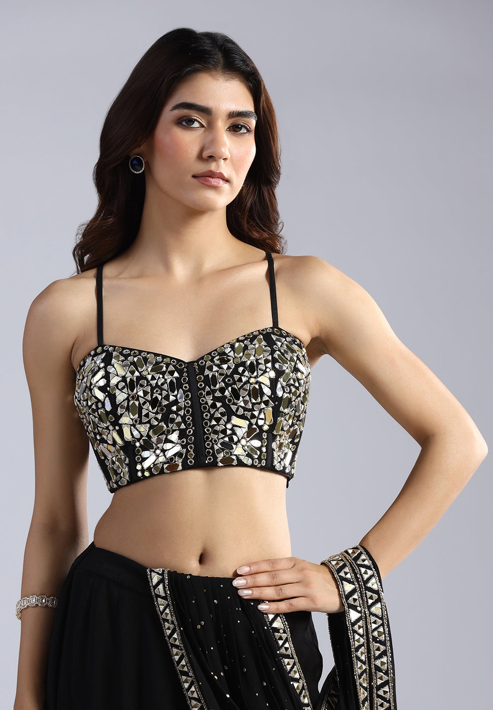 The "Prism" Corset Top: A contemporary twist on the traditional blouse. This strappy corset is heavily encrusted with hand-sewn mirrors, silver thread, and crystal droplets.