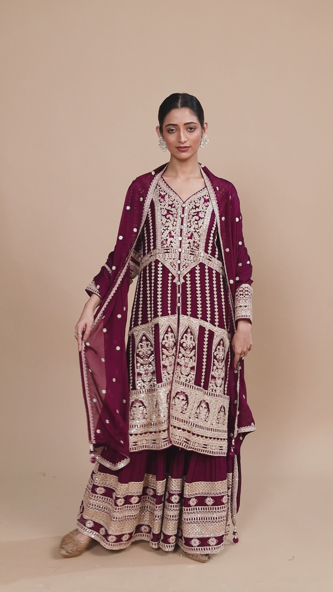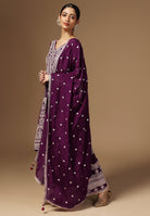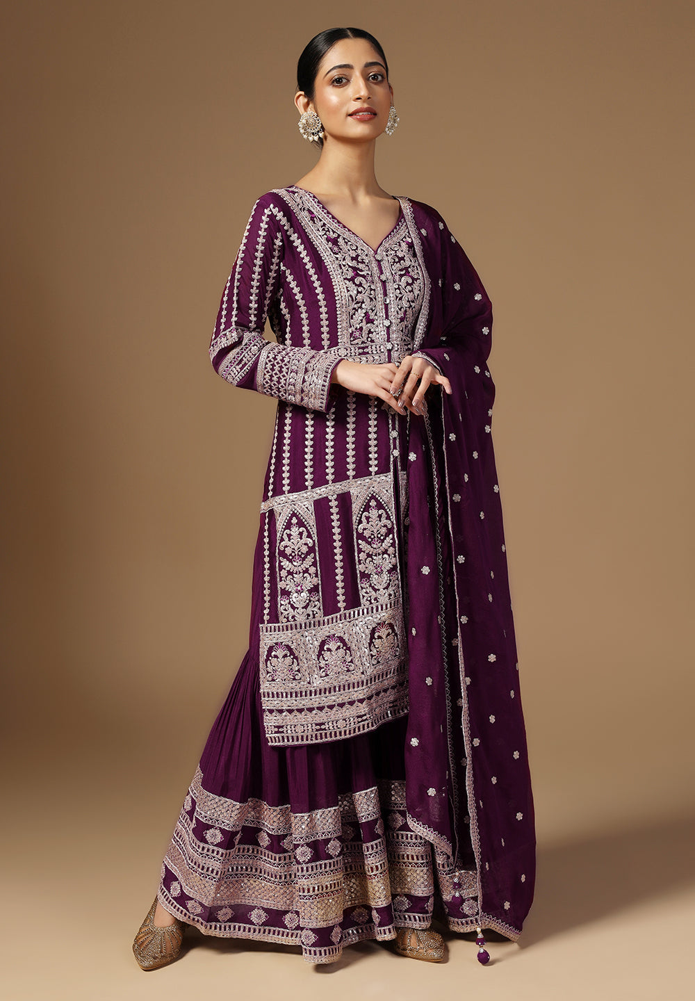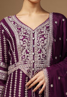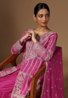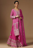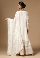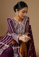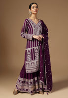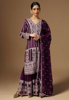 Drape yourself in elegance with our Crepe Sharara Suit, adorned with beautiful all Over Zari and Sequins work. Paired with a matching bottom and Zari Border Dupatta, this ensemble is a celebration of traditional craftsmanship And contemporary allure. Make a captivating statement at any occasion with this blend of grace and style. Available in White, Black, Magenta and Wine Color.