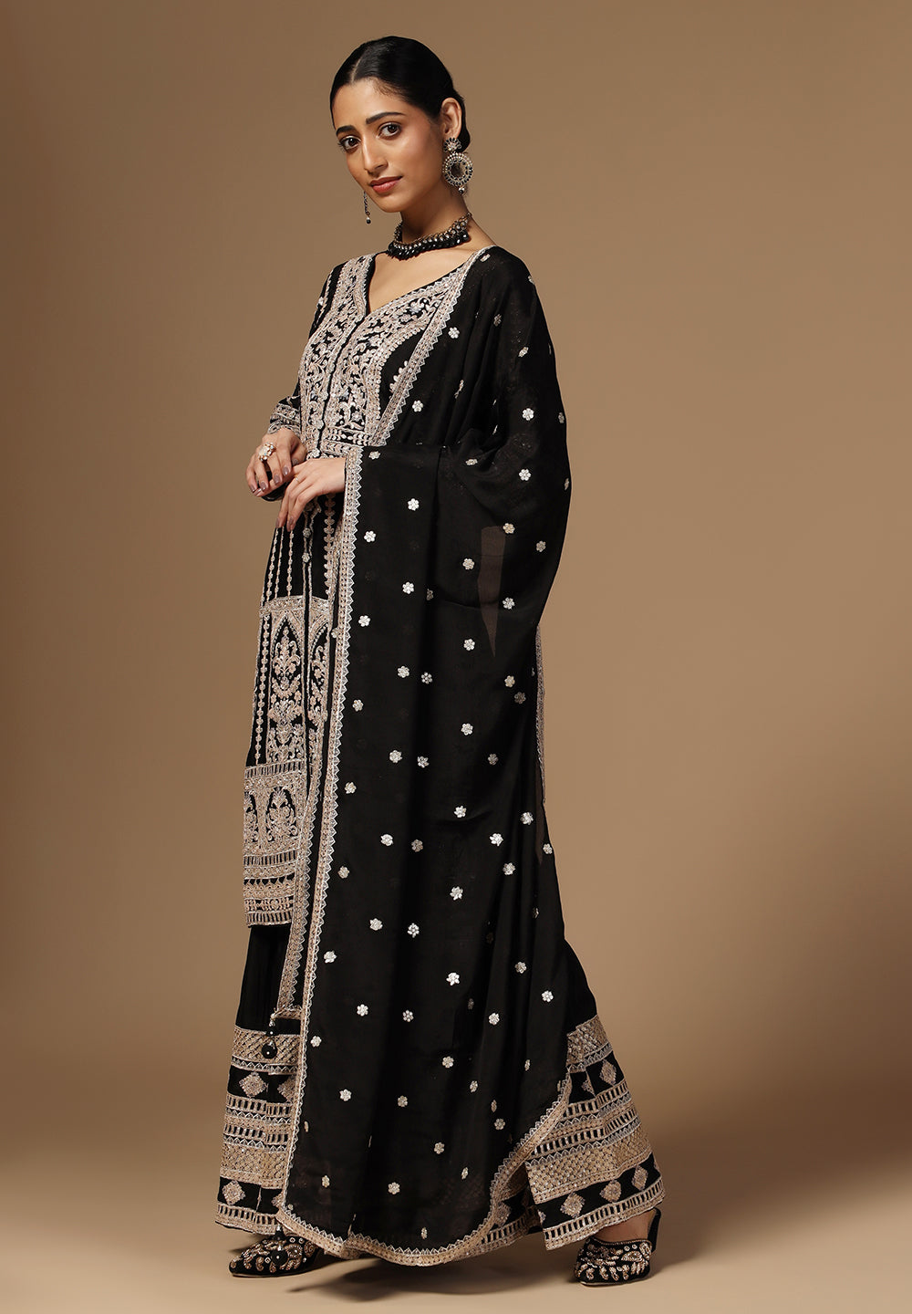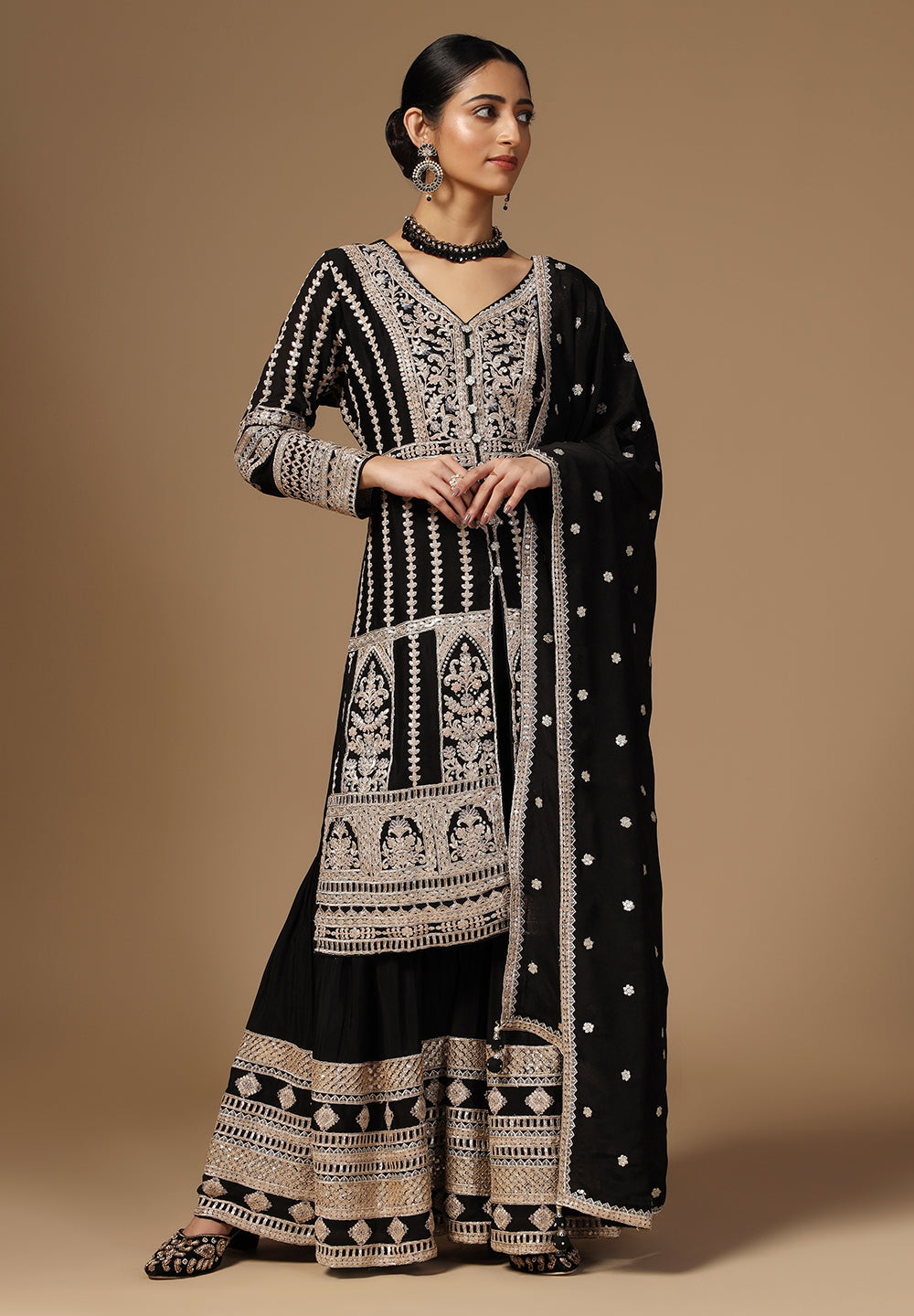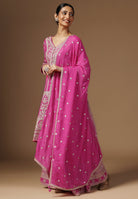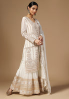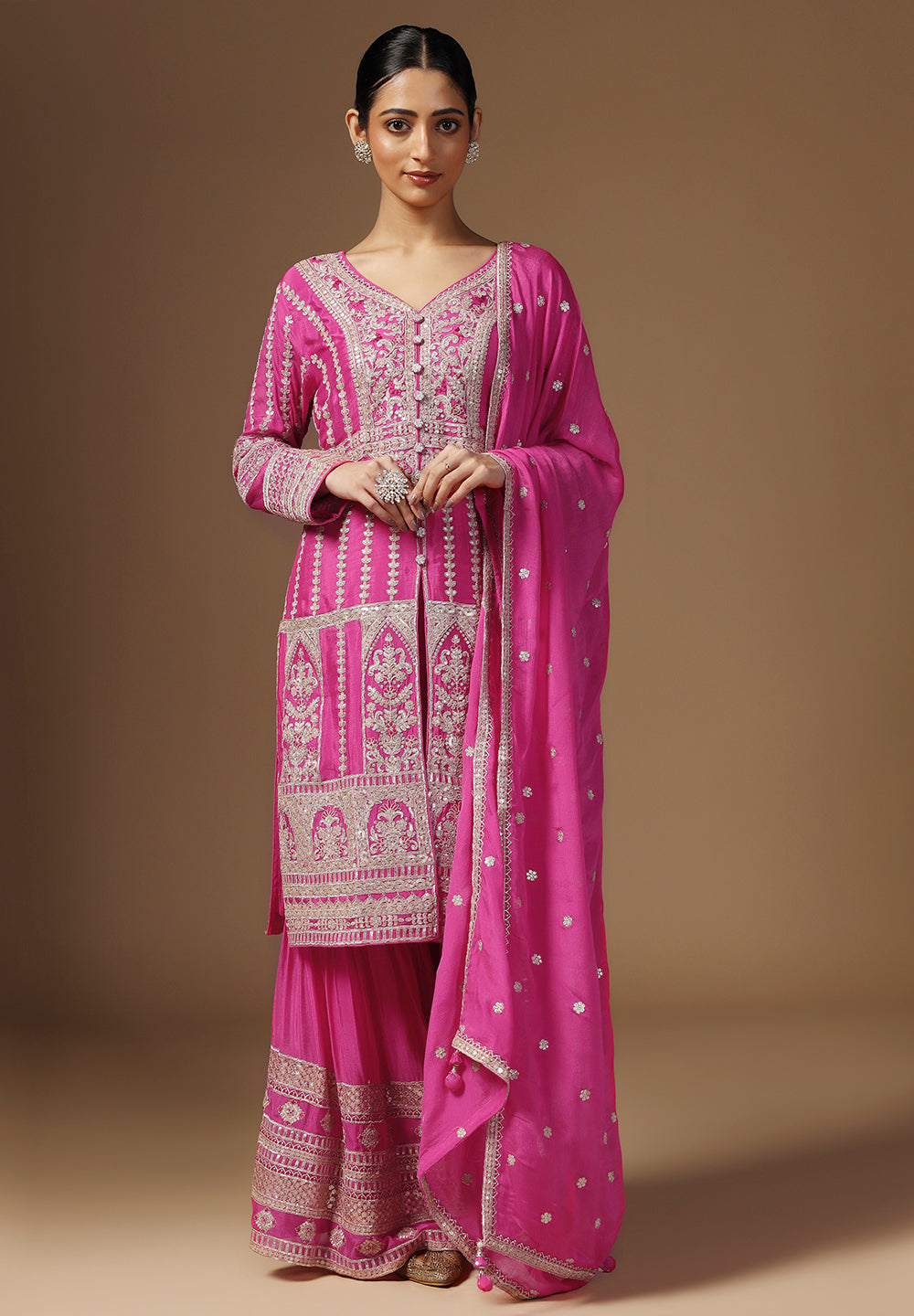 Drape yourself in elegance with our Crepe Sharara Suit, adorned with beautiful all Over Zari and Sequins work. Paired with a matching bottom and Zari Border Dupatta, this ensemble is a celebration of traditional craftsmanship And contemporary allure. Make a captivating statement at any occasion with this blend of grace and style. Available in White, Black, Magenta and Wine Color.