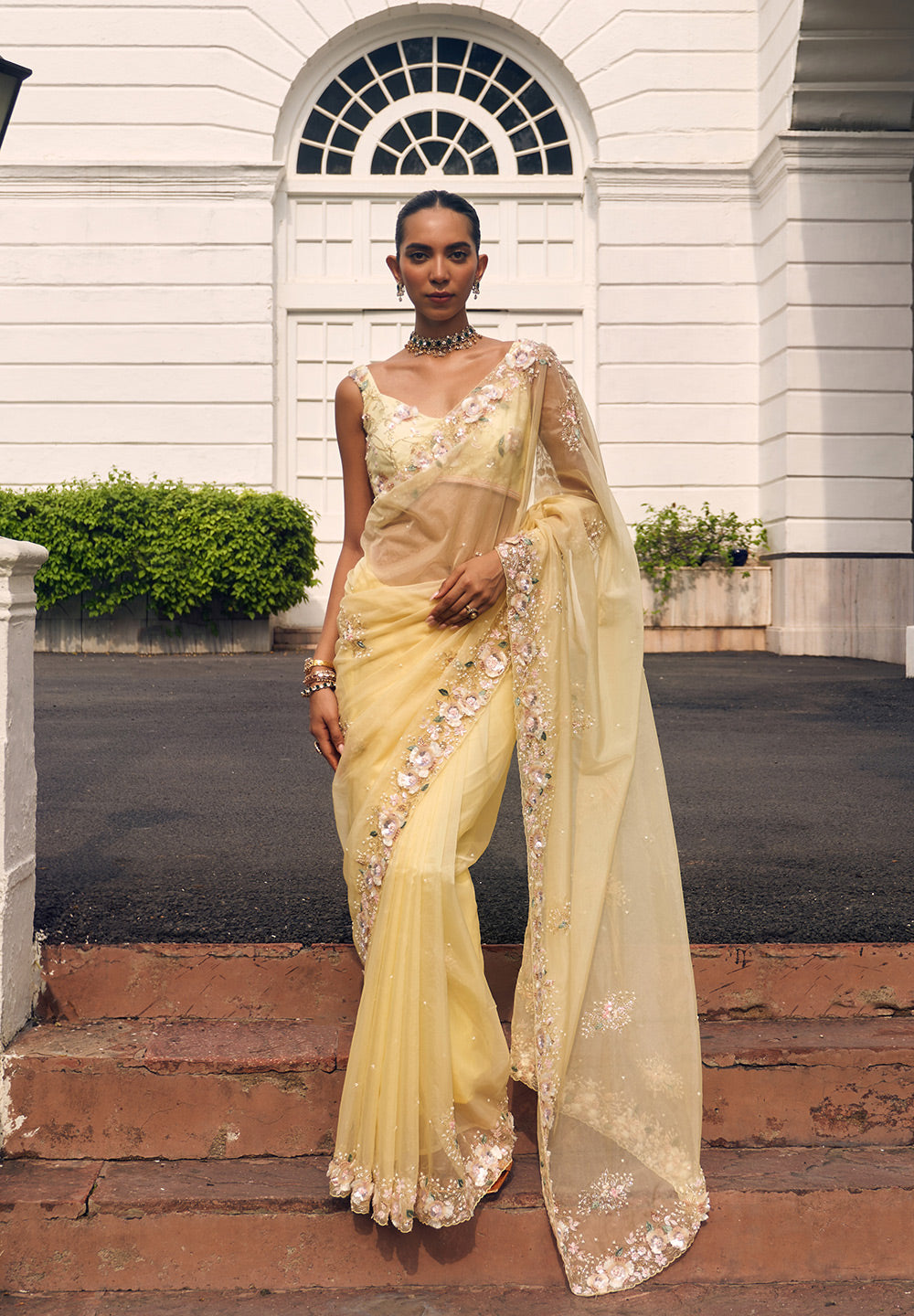 - The Saree is Elevated With All Over Cutdana, Sequin And Floral Resham Work